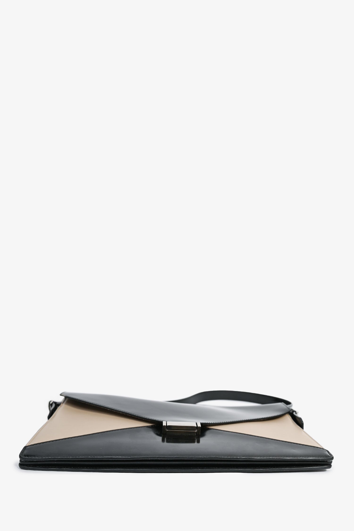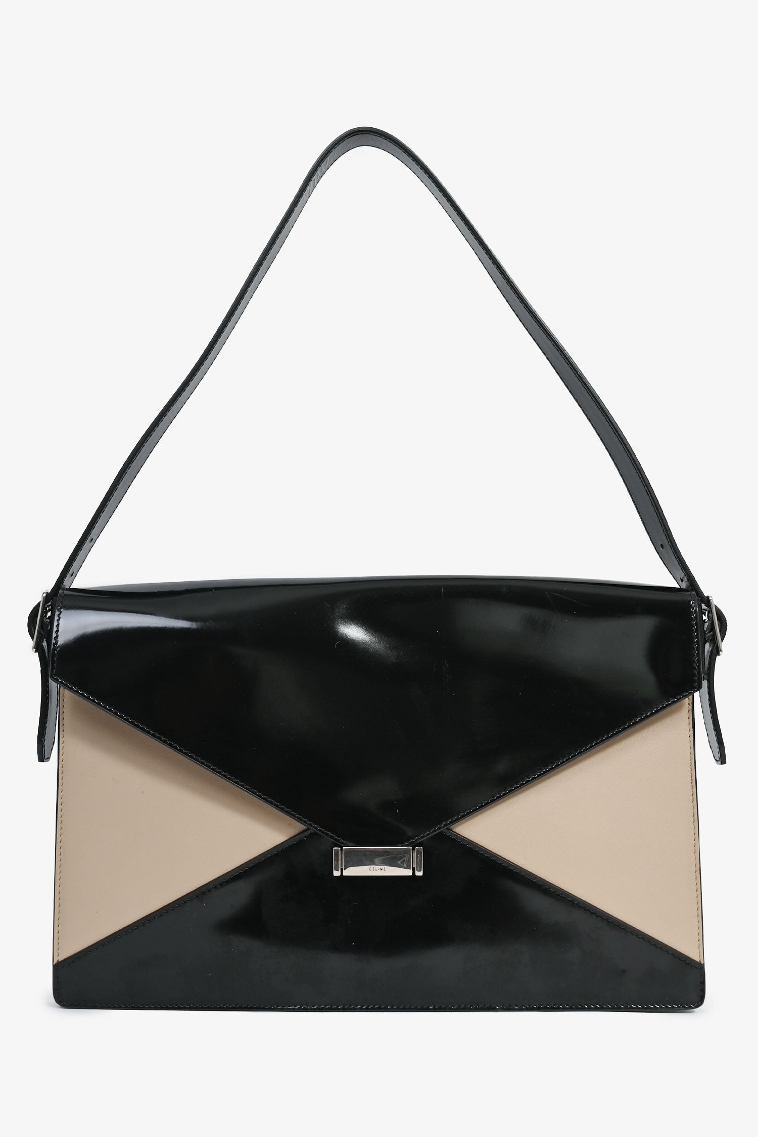 Celine Black/Brown Patent Leather Diamond Shoulder Bag. Single shoulder strap. Silver-tone hardware. Rear zipped compartment. Fold-over flap. Suede lined interior with a zipped pocket and 2 compartments.
