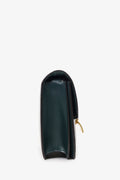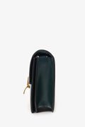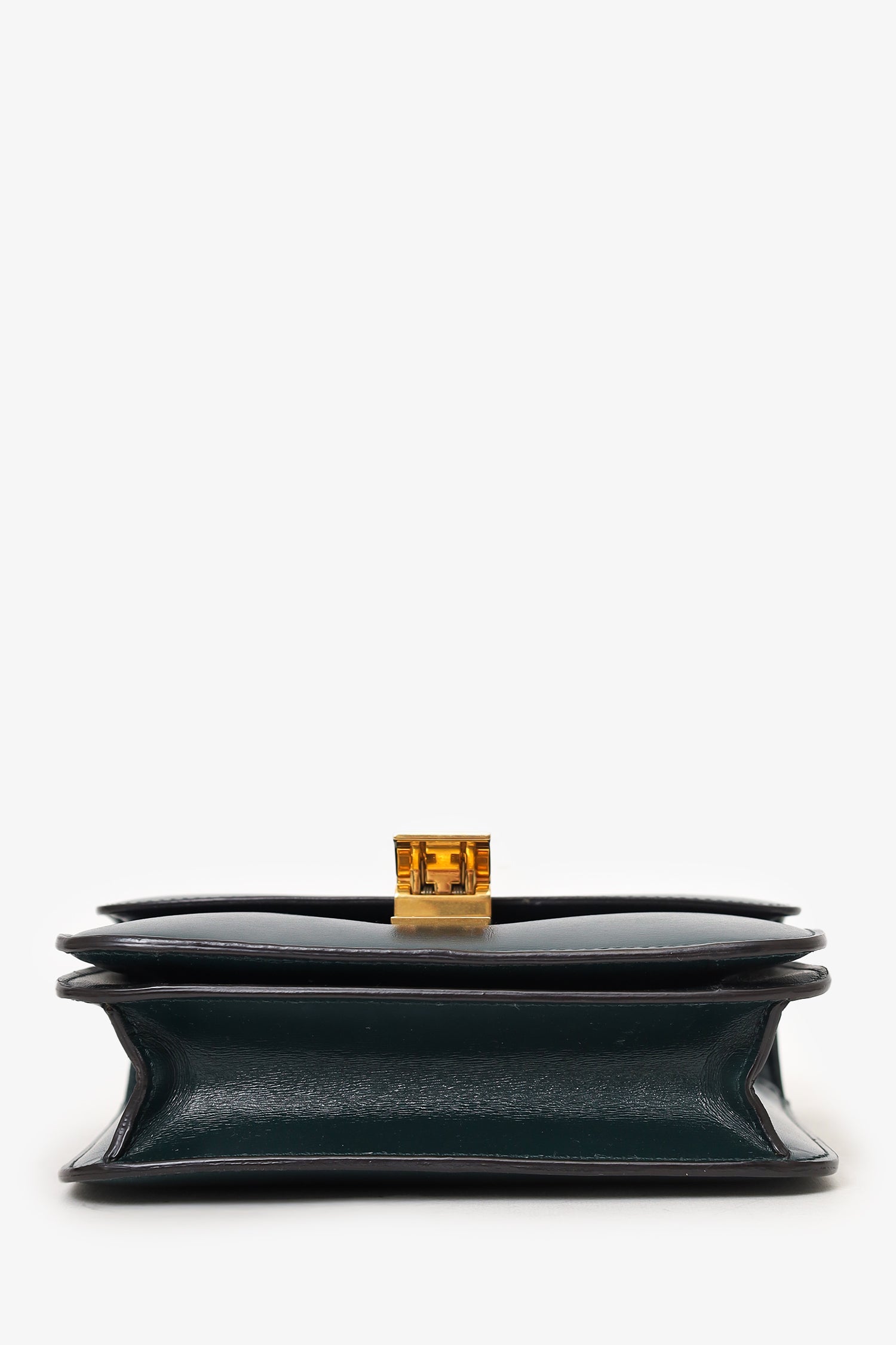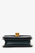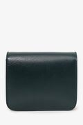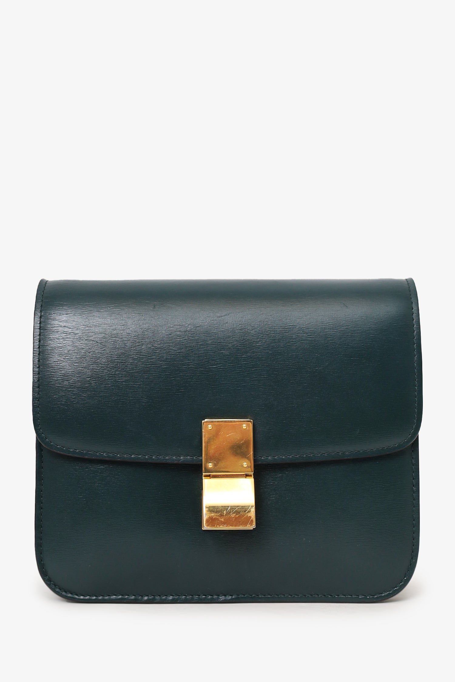 Celine Green Leather Teen Box Bag. Fold-over flap with push-lock closure. 2 interior compartments. 1 interior wall slip pocket. Adjustable crossbody strap. Gold-tone hardware. Tonal stitching.