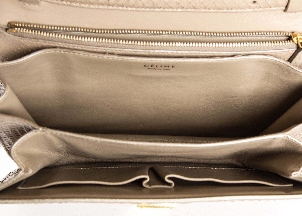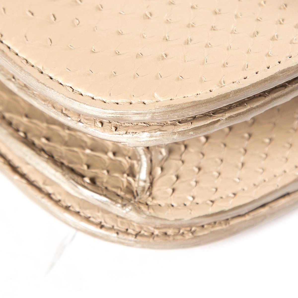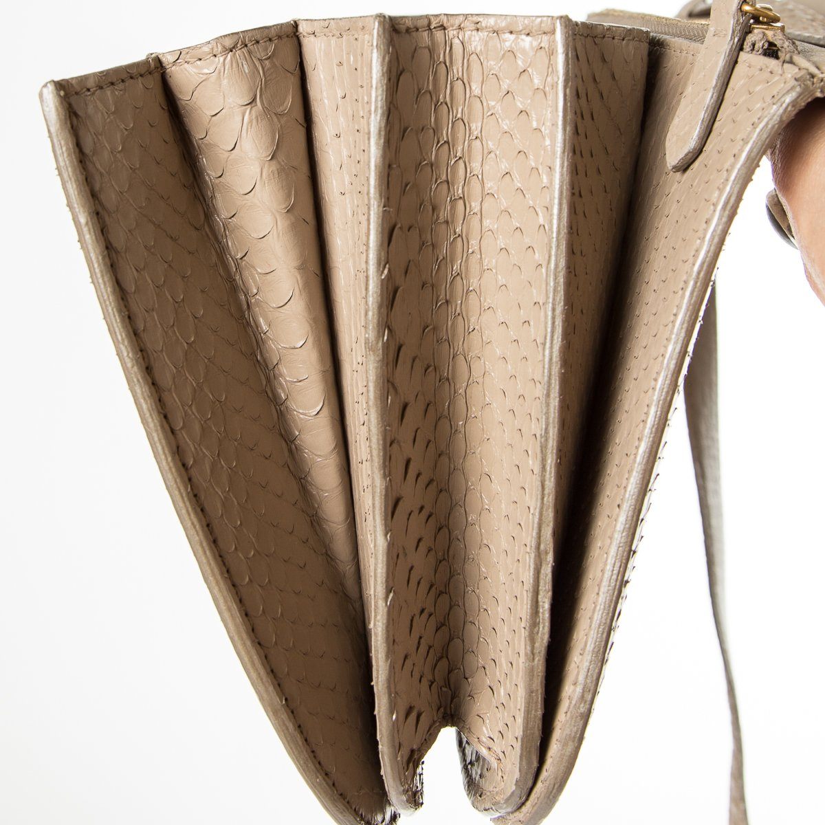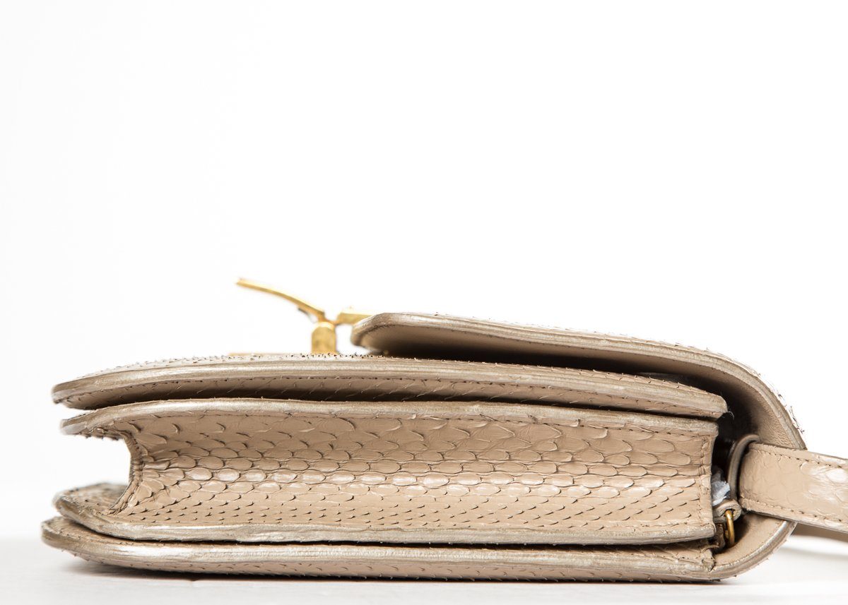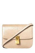Celine tan python Classic Box handbag with gold tone hardware, detachable shoulder strap with buckle adjustment and push-lock closure at front flap.