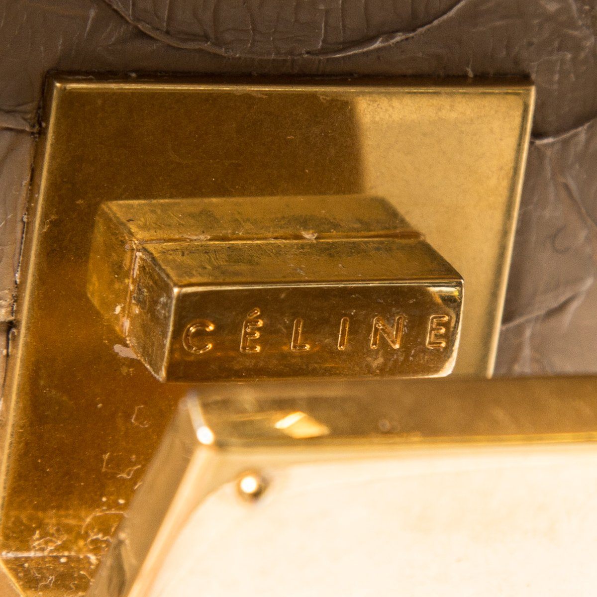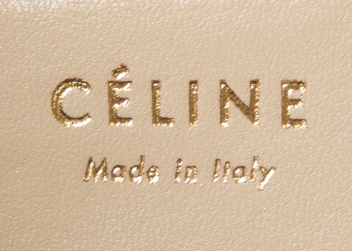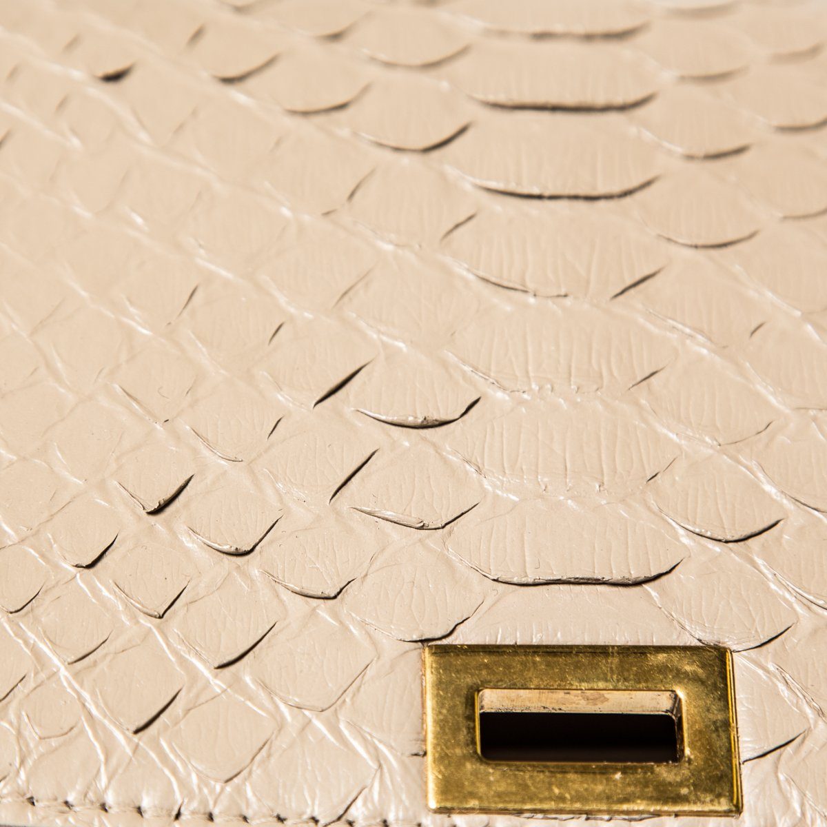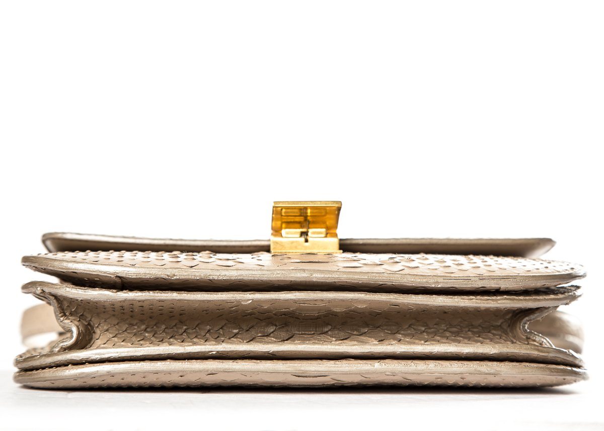 Celine tan python Classic Box handbag with gold tone hardware, detachable shoulder strap with buckle adjustment and push-lock closure at front flap.