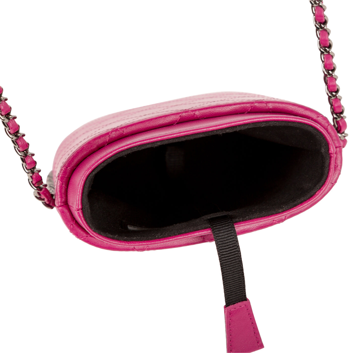 The Chanel Chain Around Phone Holder Crossbody Bag is the perfect accessory to complete any outfit. The raspberry pink lambskin leather bag features a stitched interlocking CC logo with the classic leather interwoven chain strap which can also be worn crossbody or doubled up and worn on your shoulder. This bag is an easy, efficient way to carry your phone and be completely handsfree. This stunning little gem is a well-worthy addition to your handbag collection.