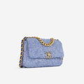 For timeless Parisian-chic there is no better investment than a Chanel flap bag. This particular Chanel 19 is crafted Chanel's bouclé tweed in a navy colour scheme. The interwoven chain sits elegantly on your shoulder or doubled up on your arm. Under the creative direction of Karl Lagerfeld, Chanel continues with its line of classic quilted bags.