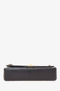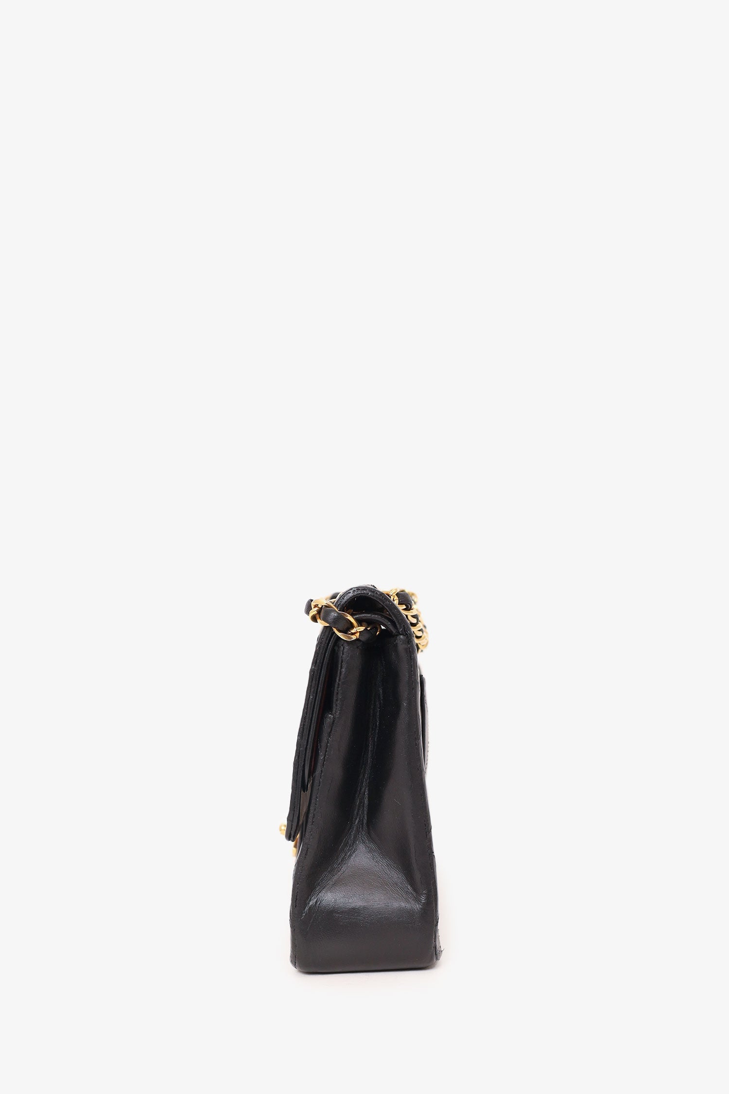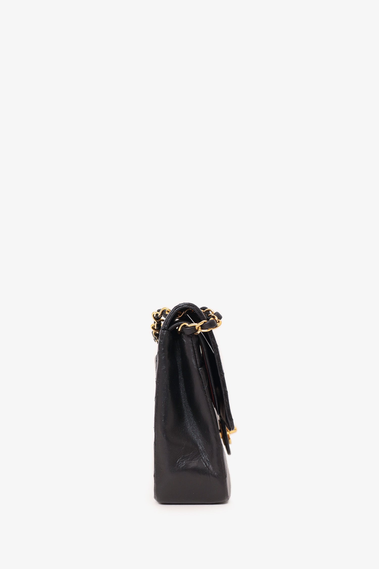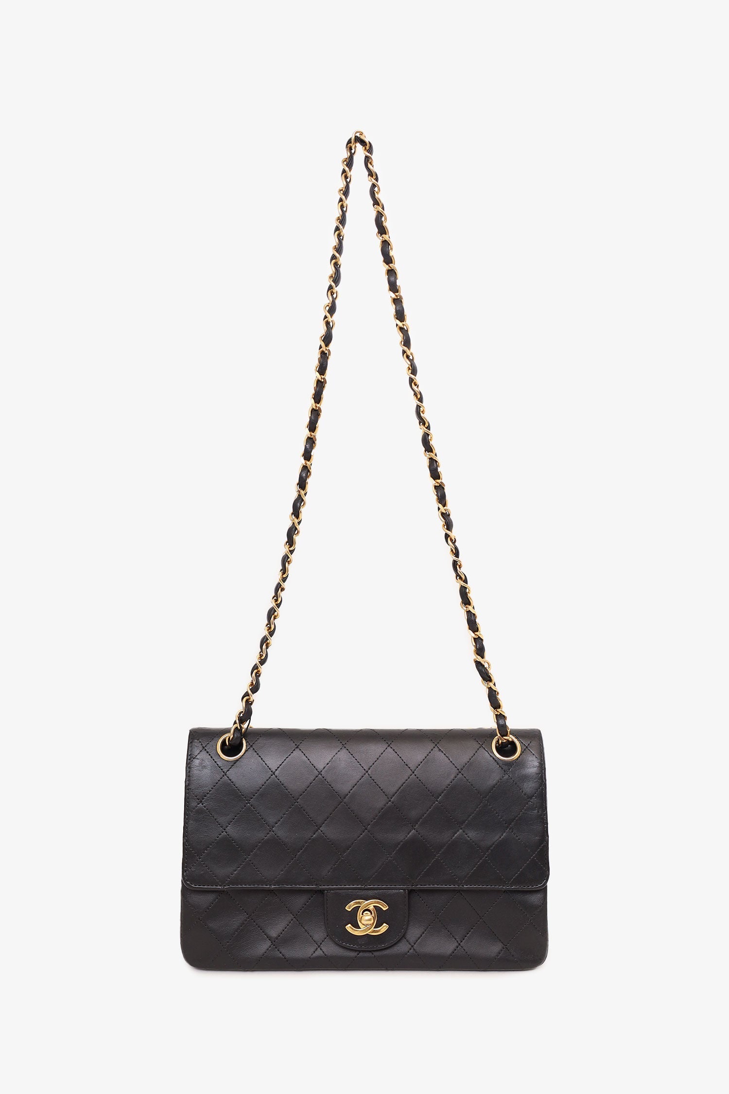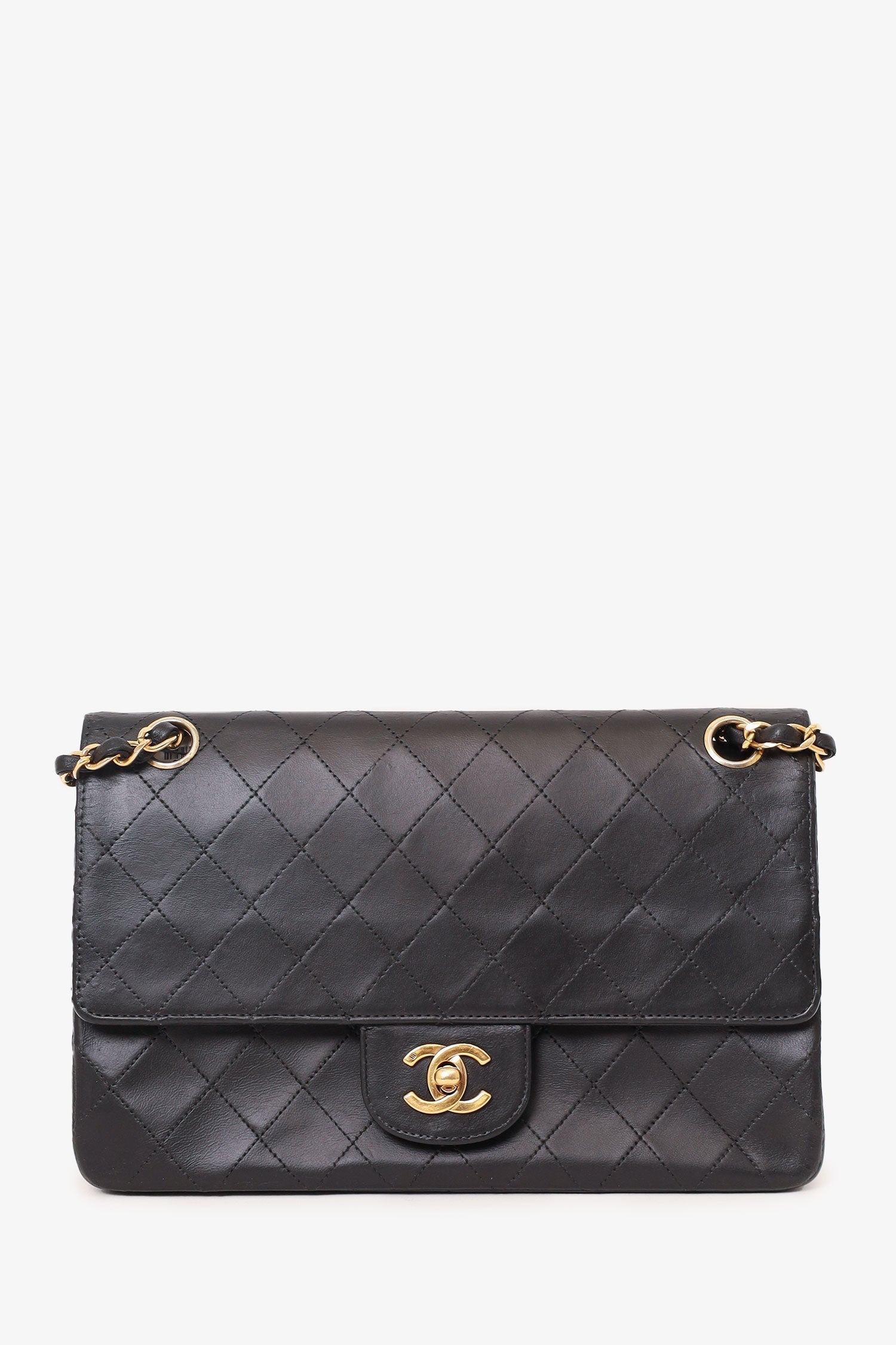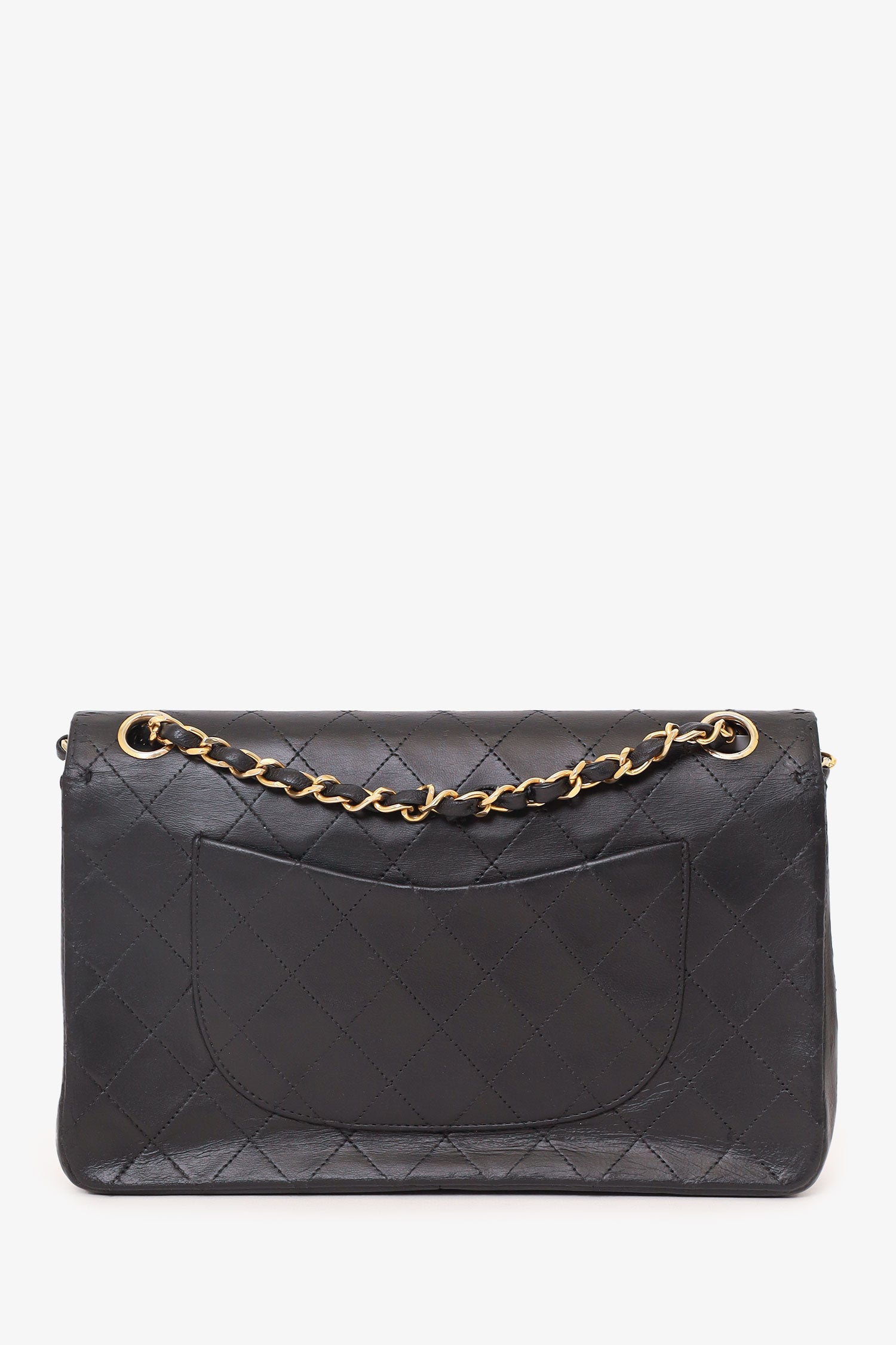 Pre-Loved Chanel™ 1986-88 Black Quilted Lambskin Medium Double Flap Bag 'Refurbished'. Front fold-over flap with turn-lock closure. Double chain shoulder strap. Single rear slip pocket. Zip closure pocket on outer flap. Single front interior slip pocket. Interior main compartment with 2 slip pockets and 1 pen compartment. Rear interior slip compartment. Gold-tone hardware. Tonal stitching.