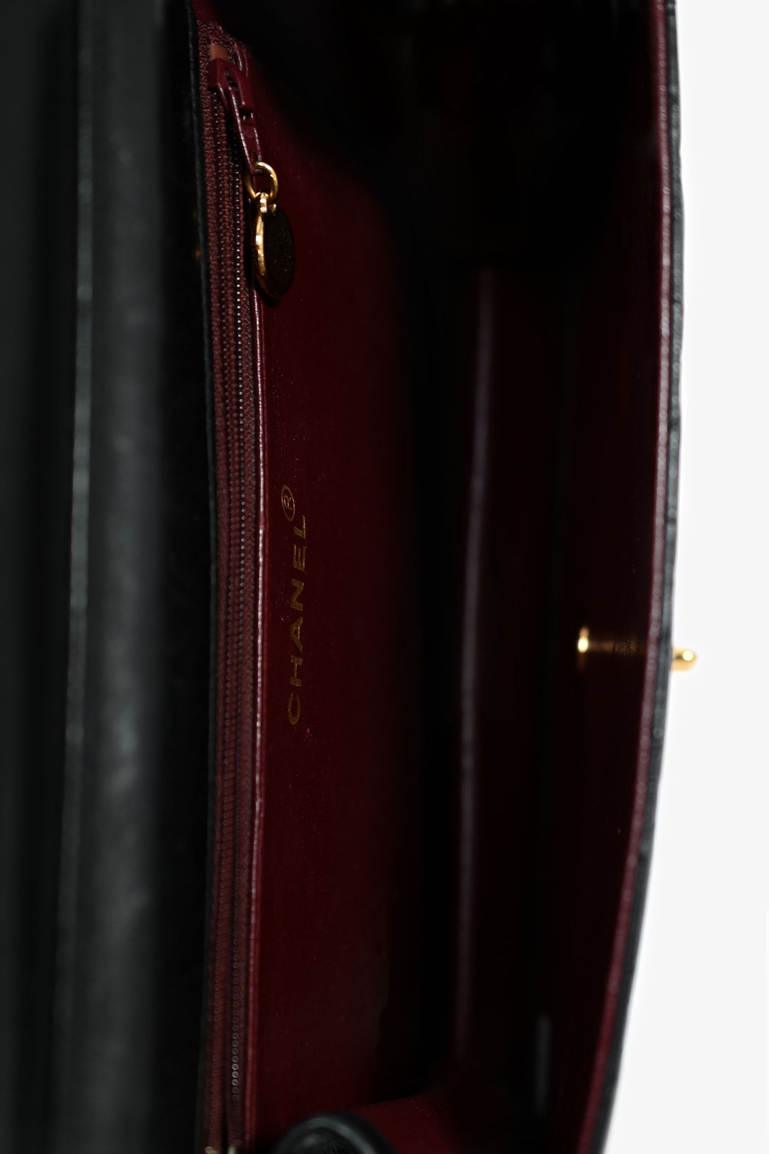 Pre-Loved Chanel™ 1994 Black Lambskin Single Chain Flap Bag. Front fold-over flap with turn-lock closure. Burgundy leather interior. Single interior wall zip pocket. Slide-around chain (non-adjustable). Gold-tone hardware.