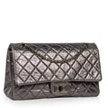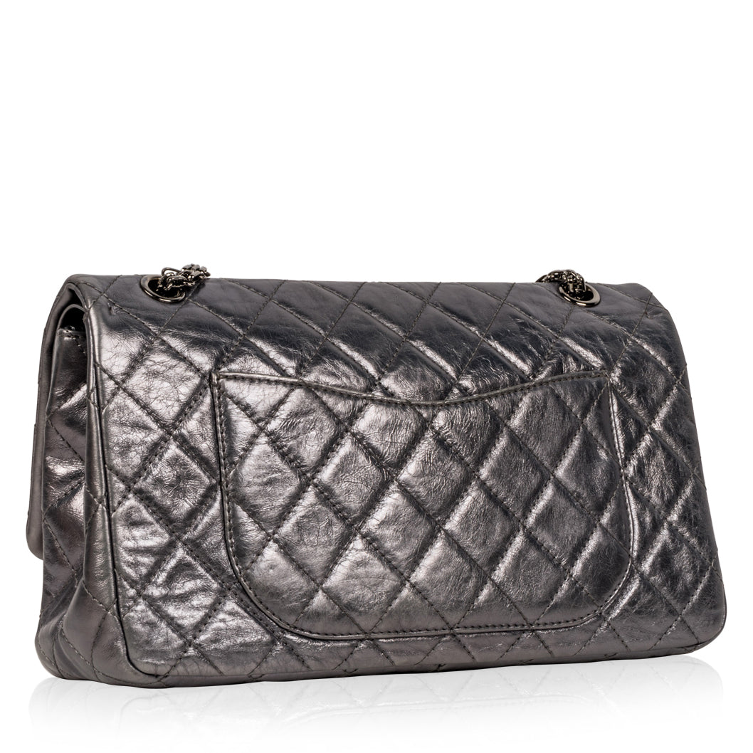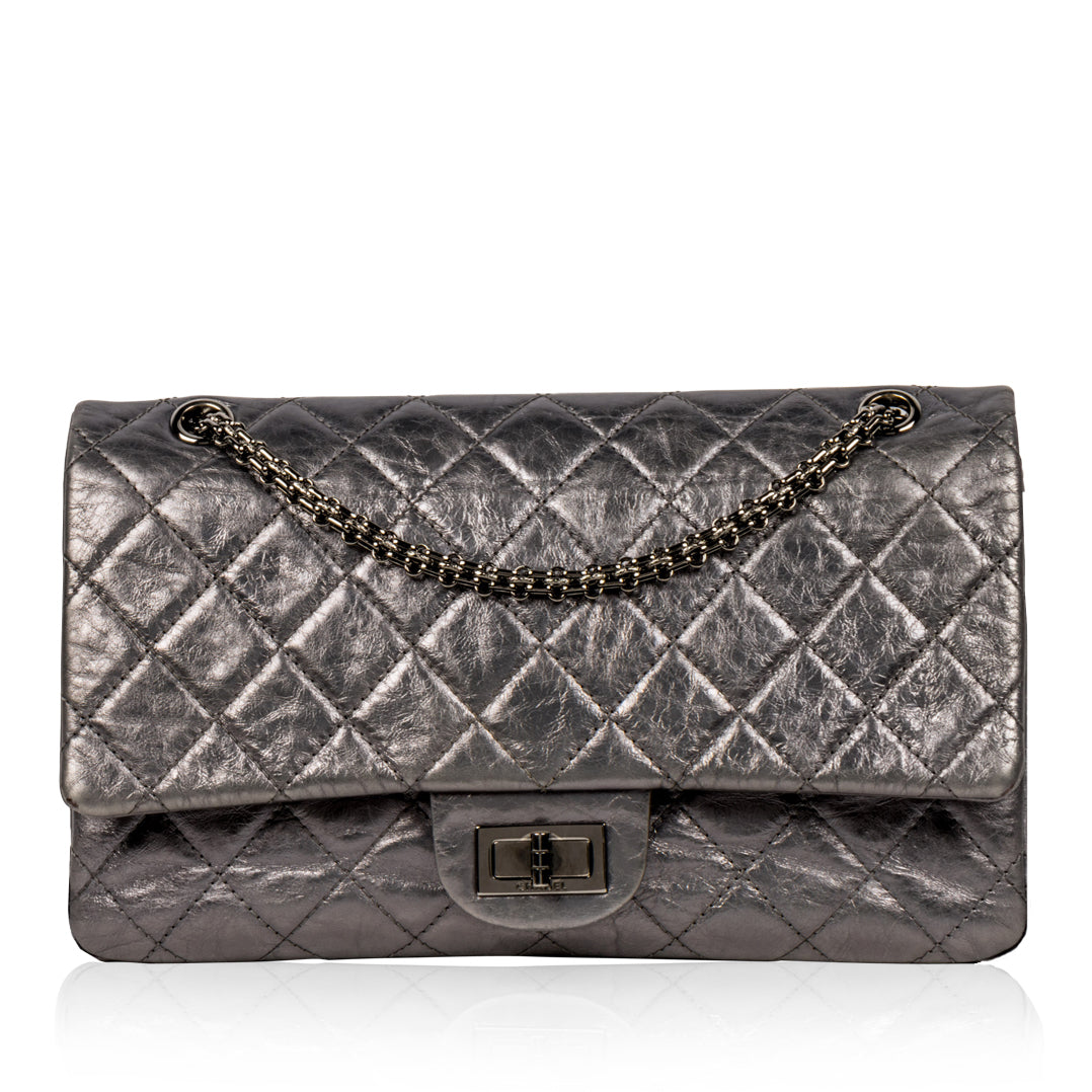For timeless Parisian-chic there is no better investment than a Chanel classic flap bag, and this 2.55 re-issue is classic and stunning. This stylish shoulder bag is beautifully crafted of diamond quilted aged calfskin leather in a metallic blueish silver. Under the creative direction of Karl Lagerfeld, Chanel have continued to create these flawlessly crafted handbags which last a lifetime. This one is silver, crafted out of lambskin, with silver tone hardware and the classic re-issue twist lock. This bag can be worn with any outfit and in any season, it is a true investment piece.