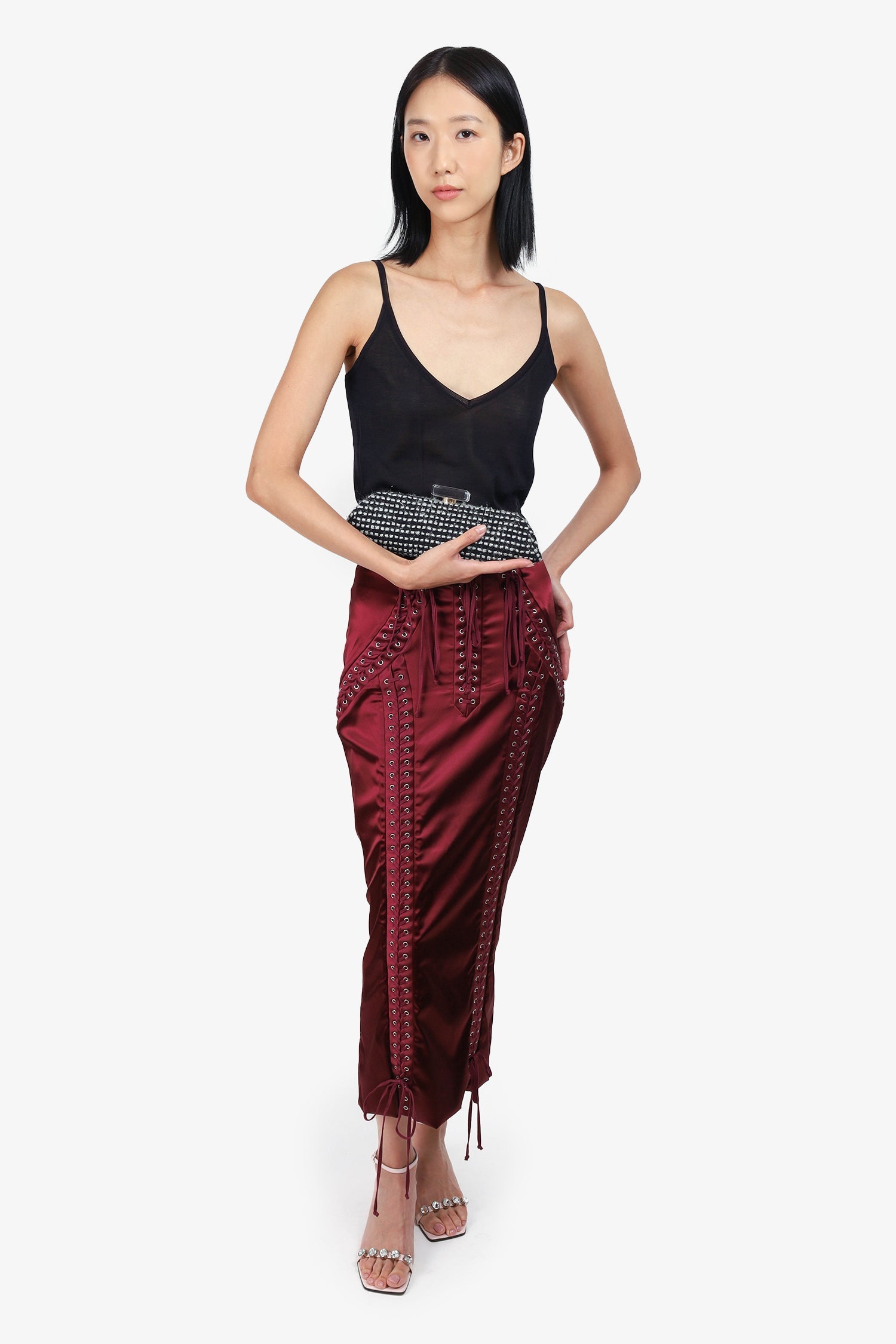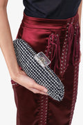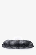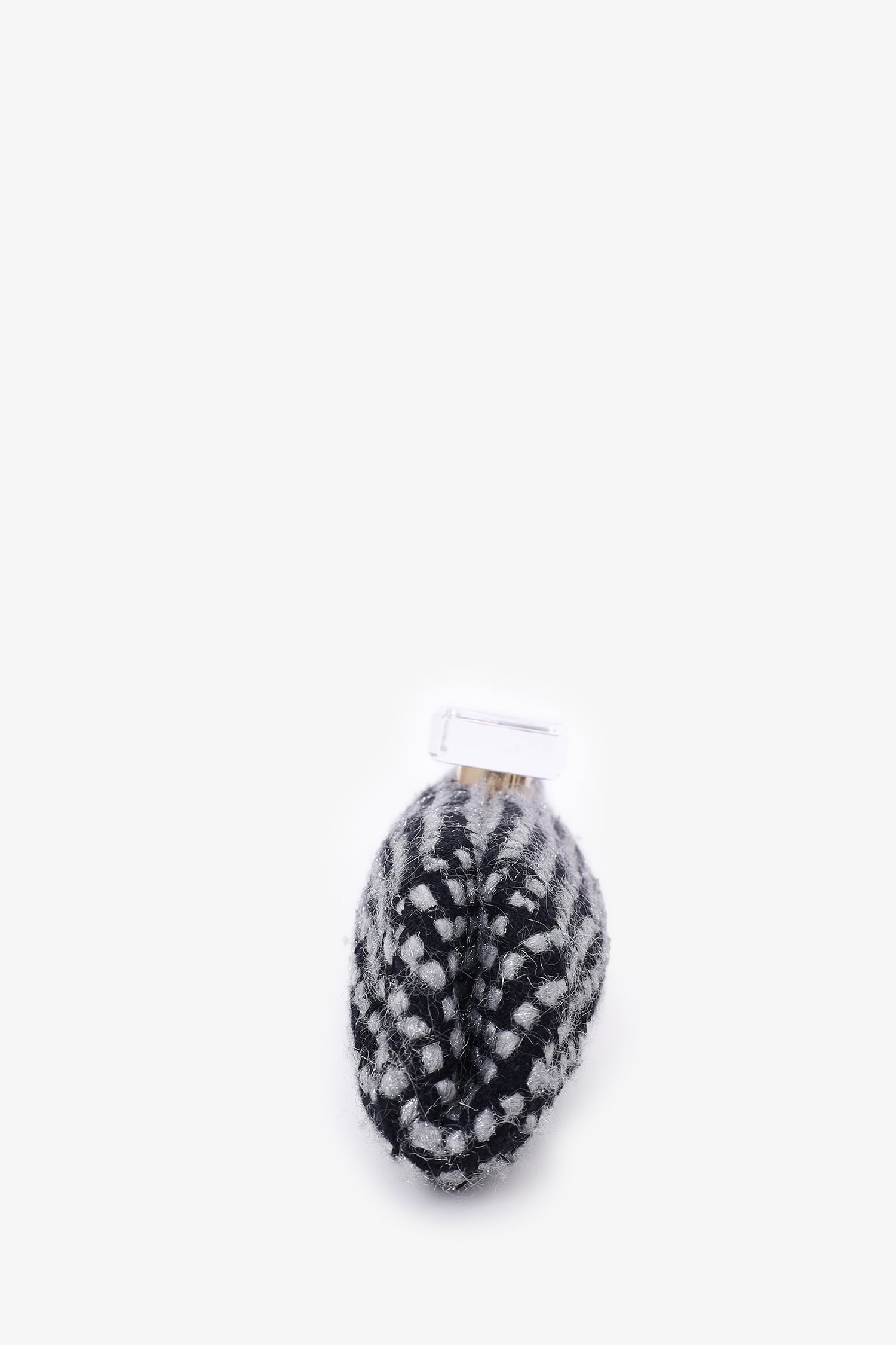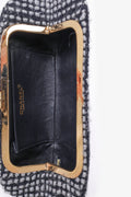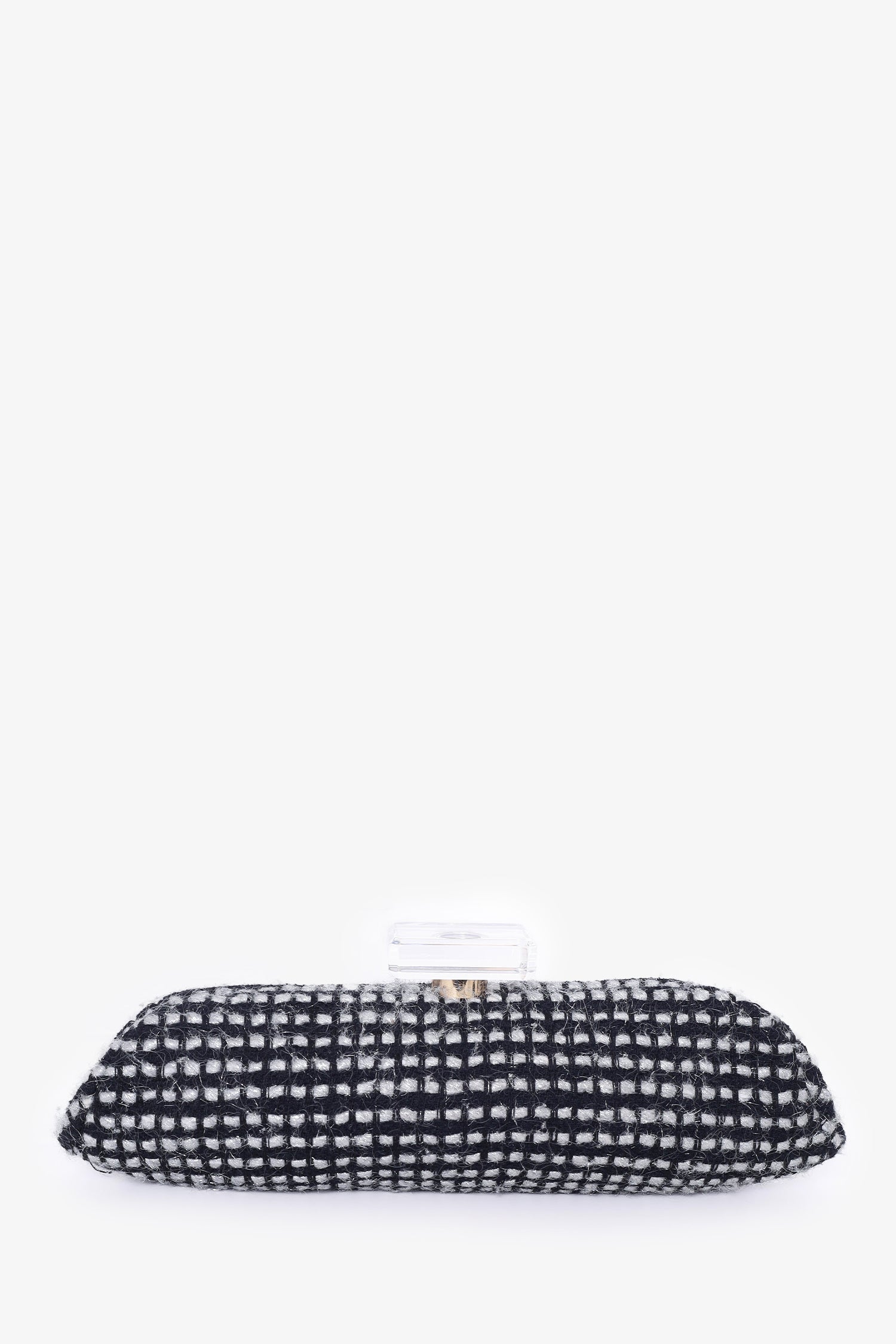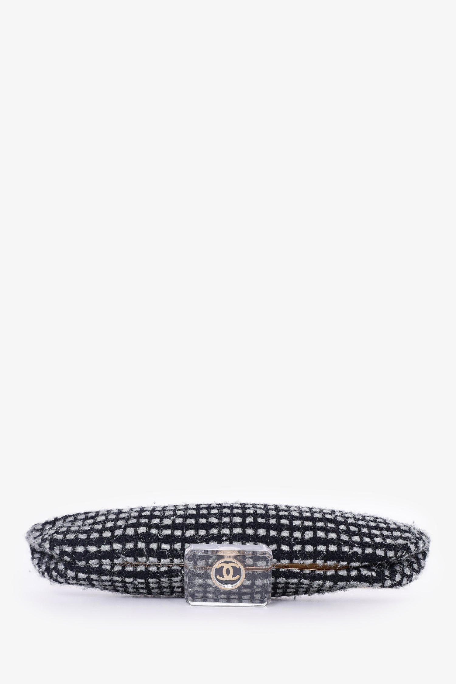 Pre-Loved Chanel™ 2002/03 Black/Silver Tweed Clutch. Clear top knob handle. Clasp closure on top. Open interior with single wall slip pocket. Leather lining. Gold-tone hardware.