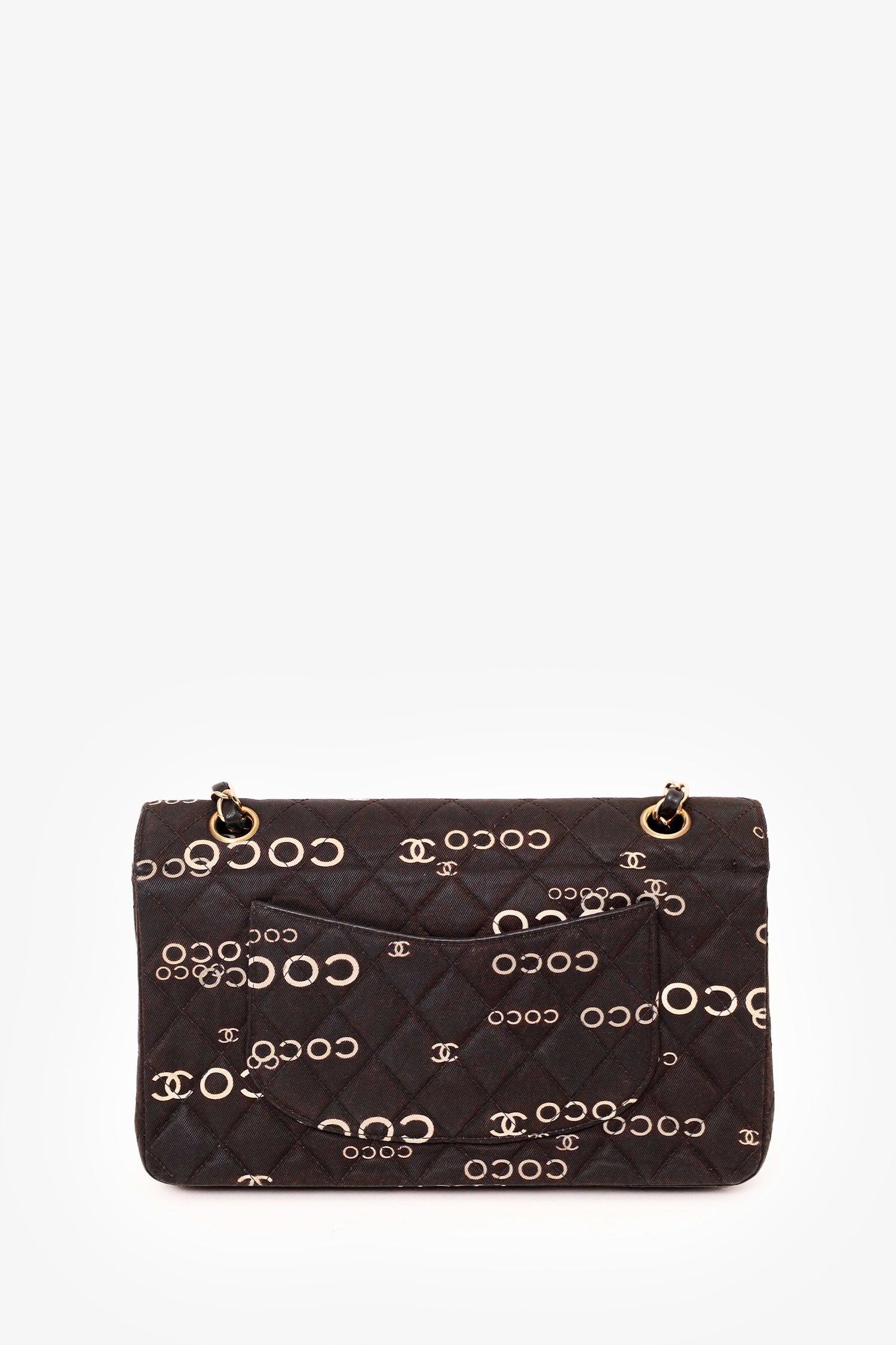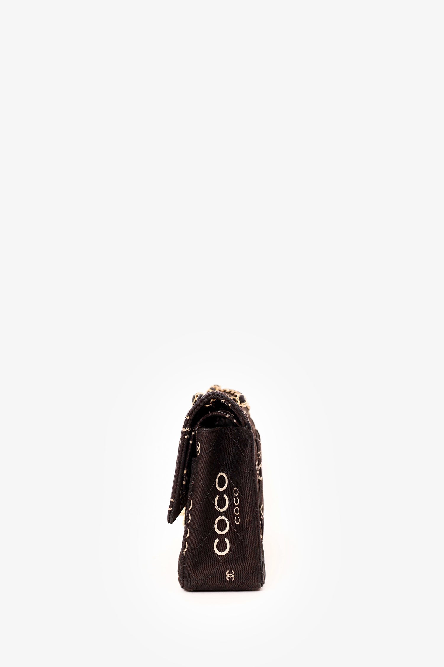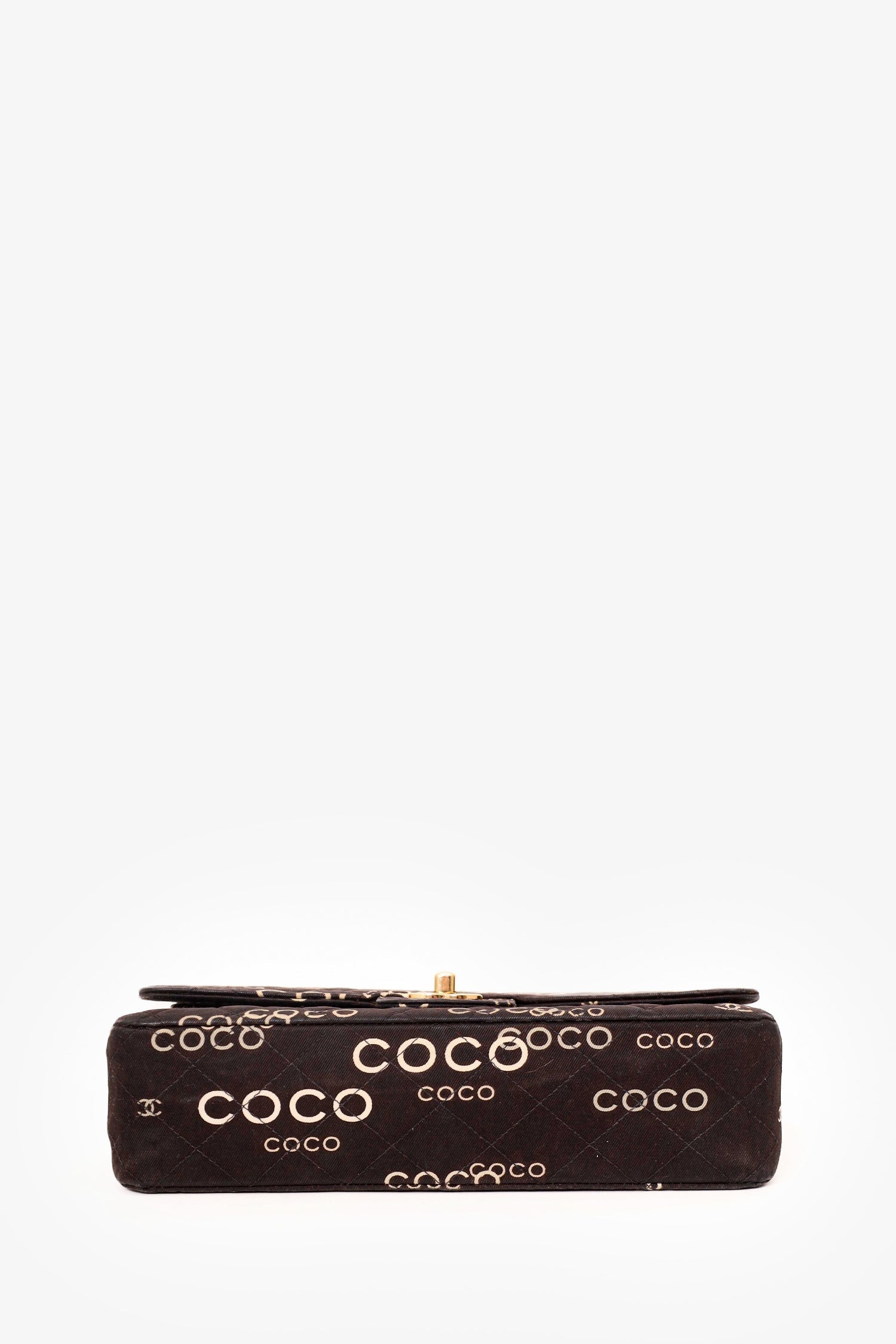 Pre-Loved Chanel™ 2002-03 Black/White Denim Quilted Coco Print Medium Double Flap Bag. Front fold-over flap with turn lock closure. Exterior rear slip pocket. Double chain shoulder strap. Zip closure pocket on outer flap. Single front interior slip pocket. Interior main compartment with 2 slip pockets and 1 pen compartment. Rear interior slip compartment. Gold-tone hardware. Tonal stitching.