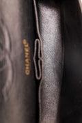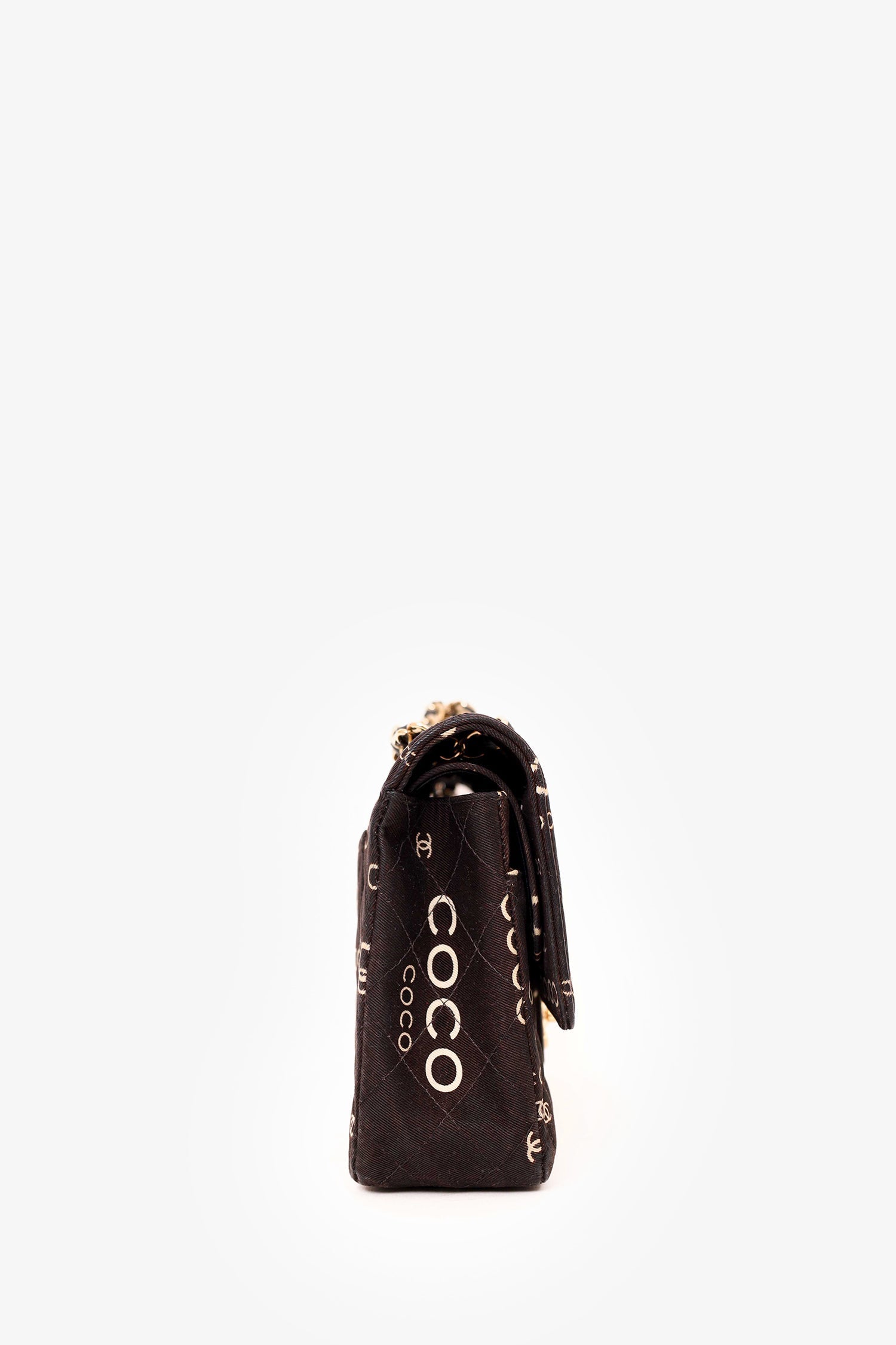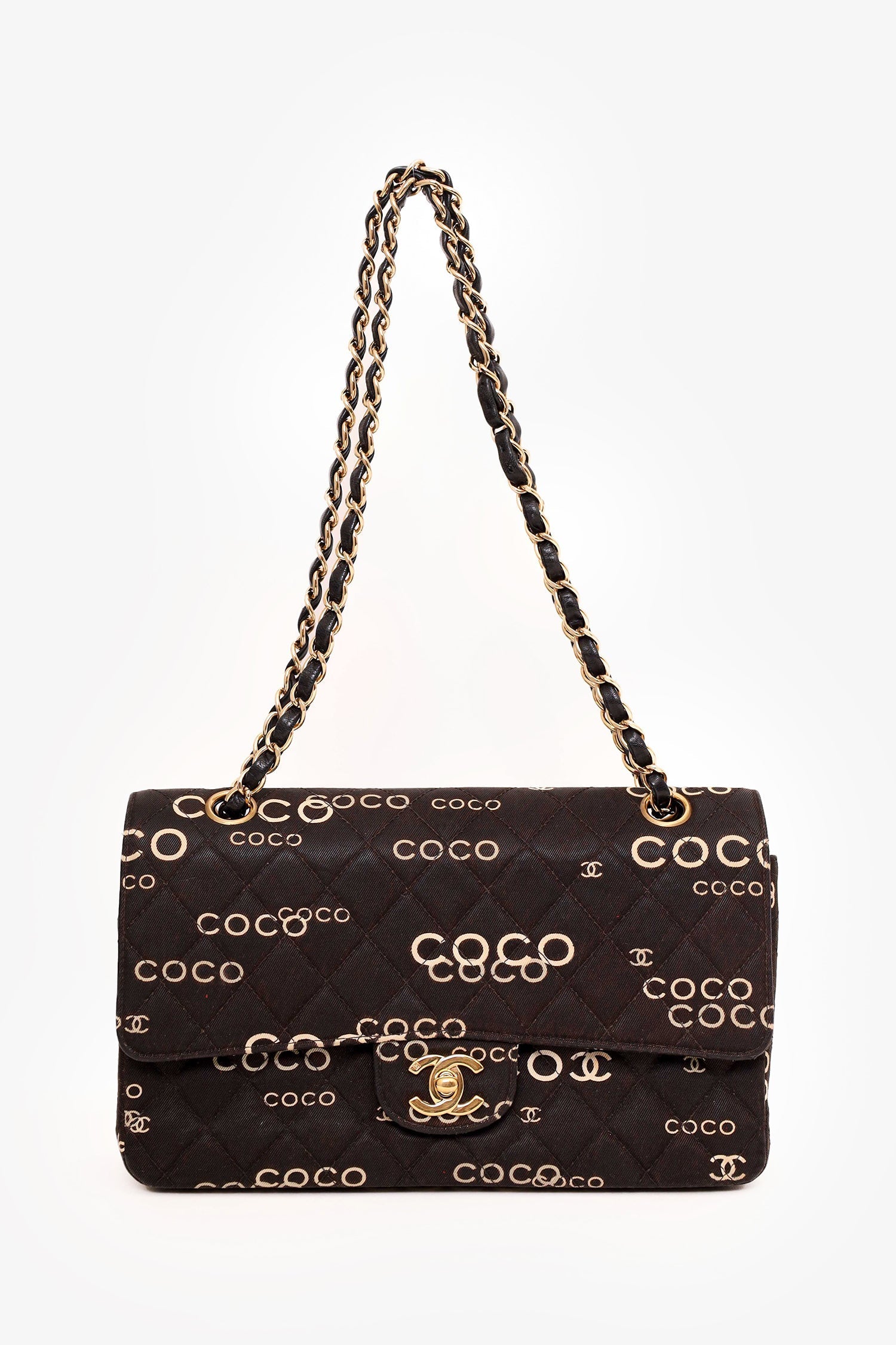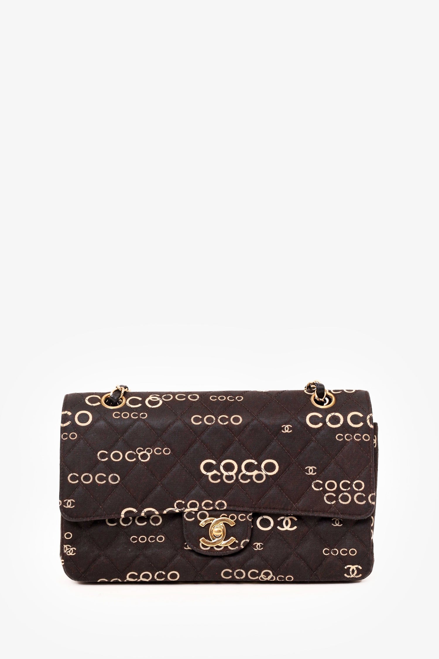 Pre-Loved Chanel™ 2002-03 Black/White Denim Quilted Coco Print Medium Double Flap Bag. Front fold-over flap with turn lock closure. Exterior rear slip pocket. Double chain shoulder strap. Zip closure pocket on outer flap. Single front interior slip pocket. Interior main compartment with 2 slip pockets and 1 pen compartment. Rear interior slip compartment. Gold-tone hardware. Tonal stitching.