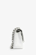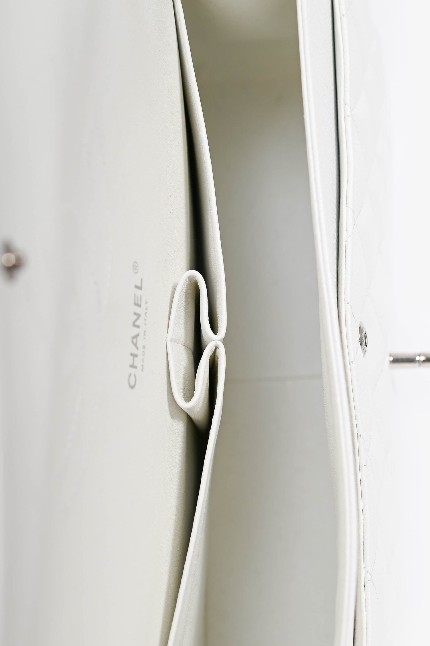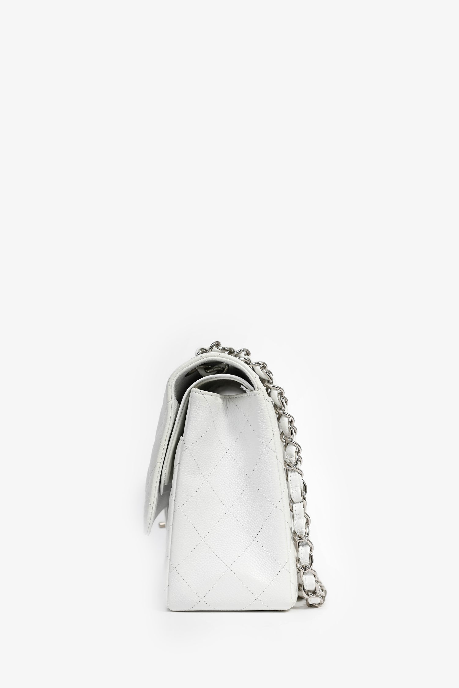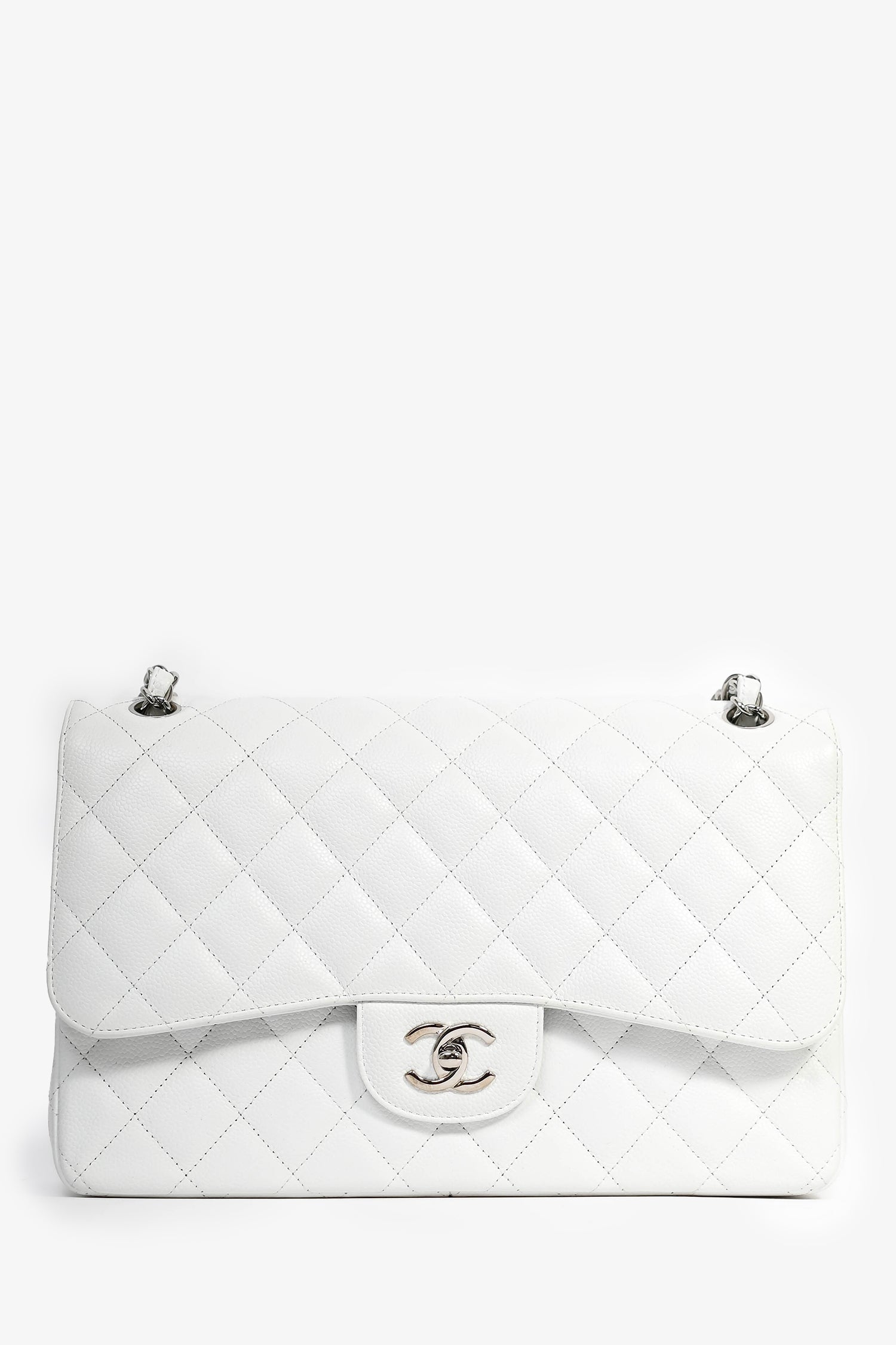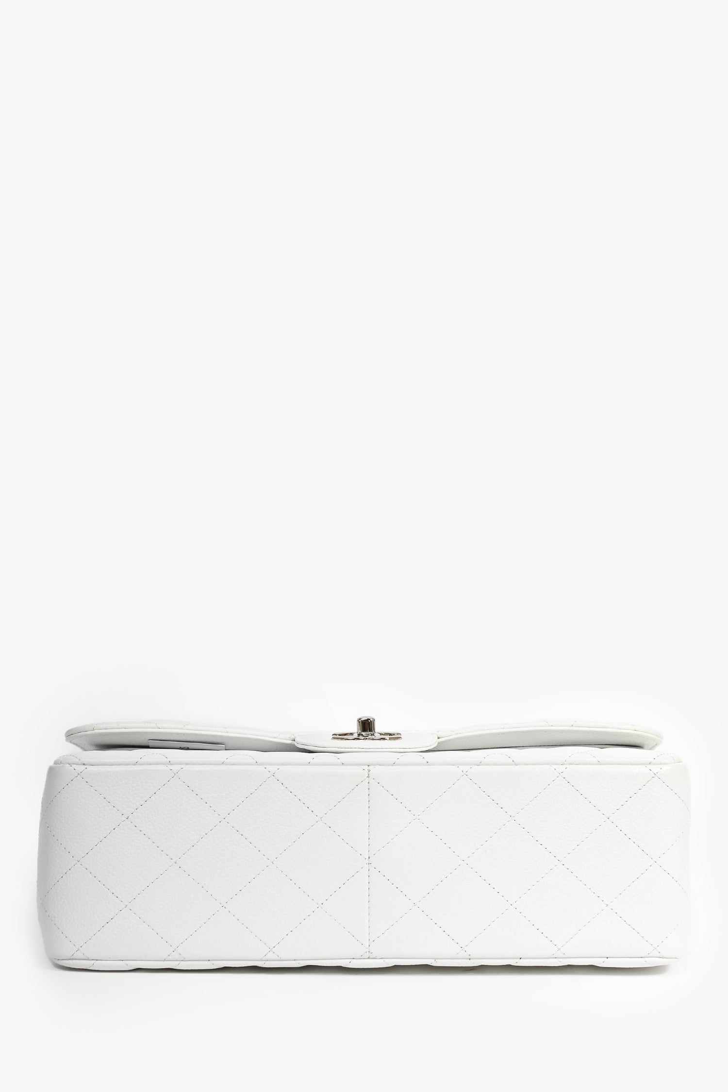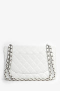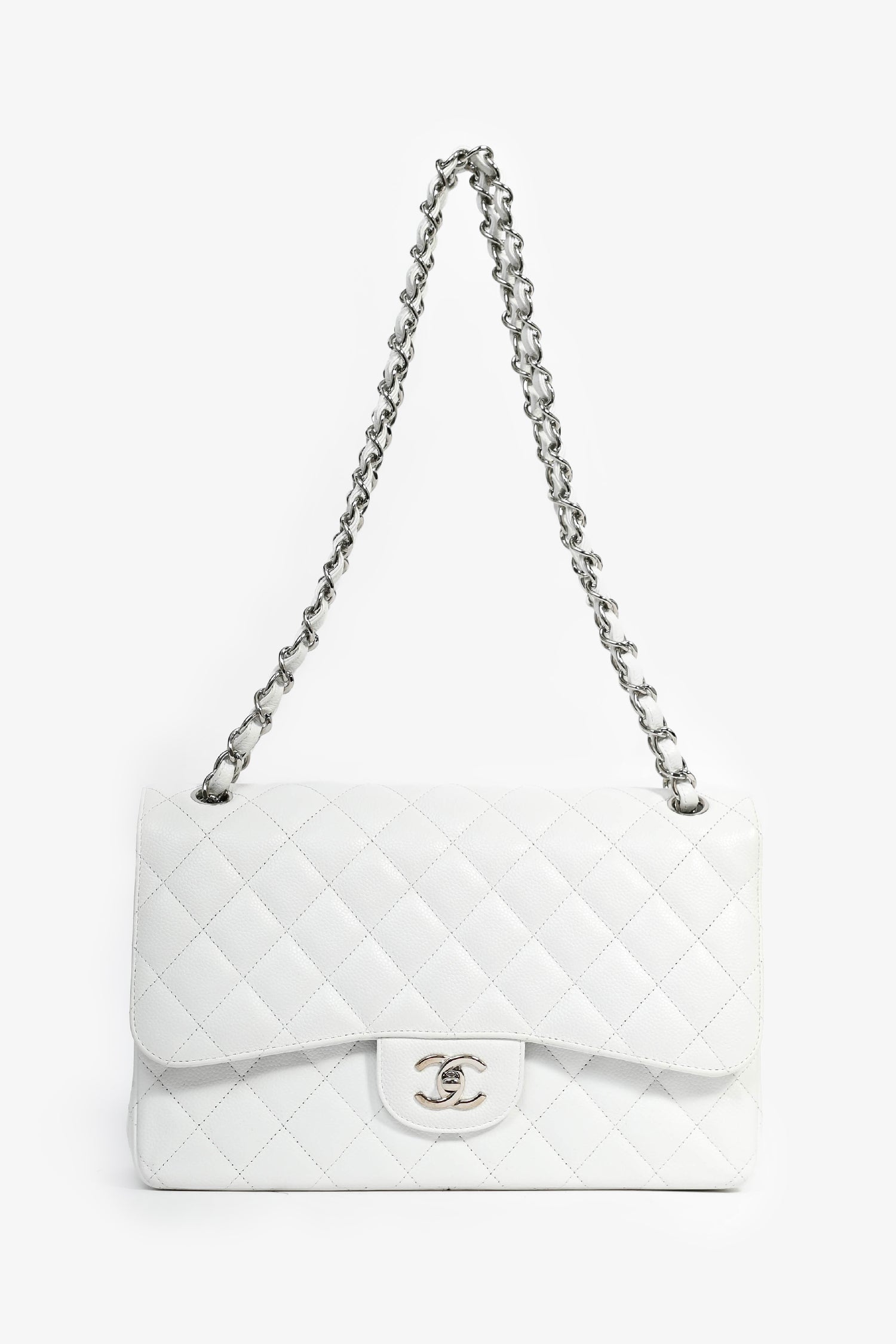 Pre-Loved Chanel™ 2011 White Caviar Leather Jumbo Double Flap Shoulder Bag. Silver-toned hardware. Tonal interior. Top flap with turn lock closure. Zip pocket on interior top flap. 1 exterior slip pocket. 3 interior slip pockets. Tonal stitching.