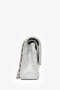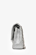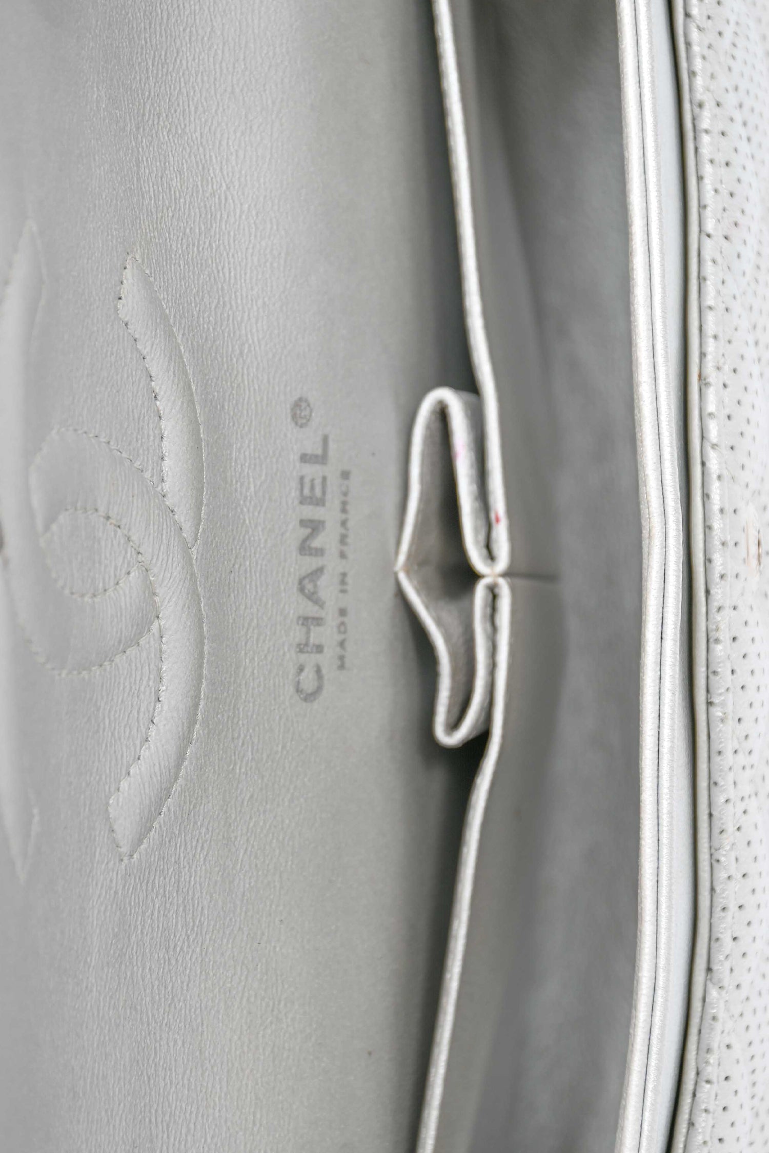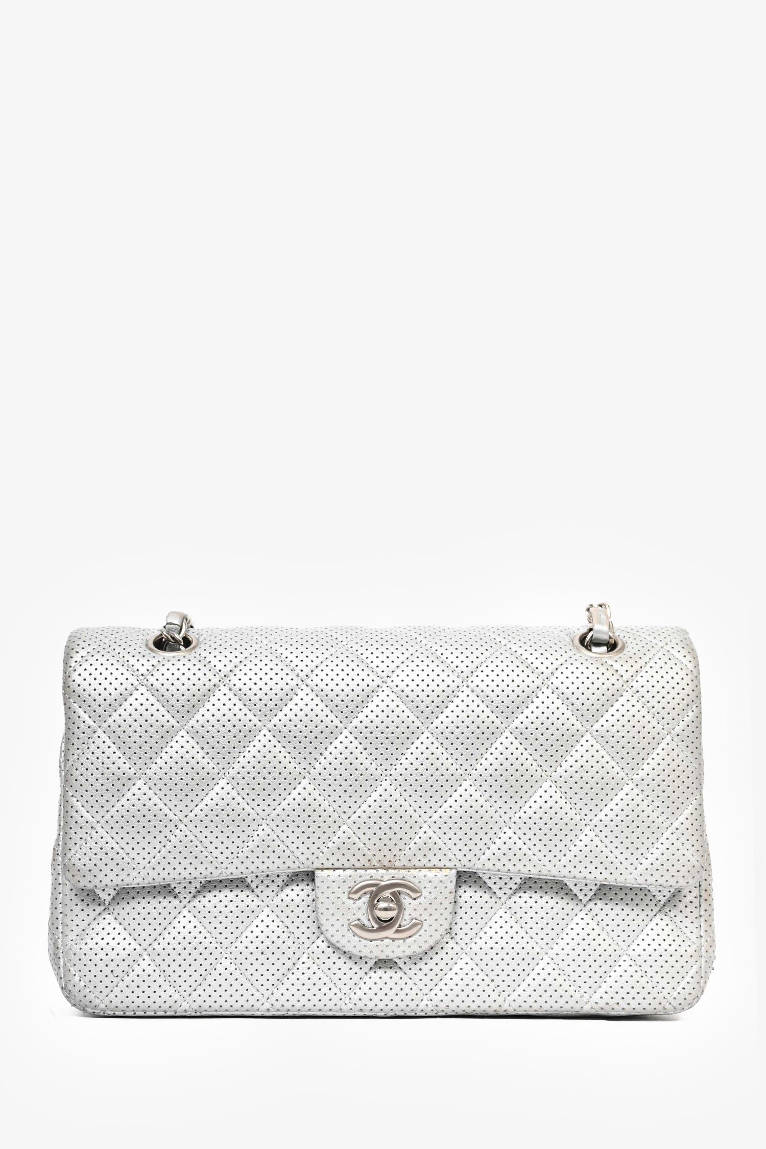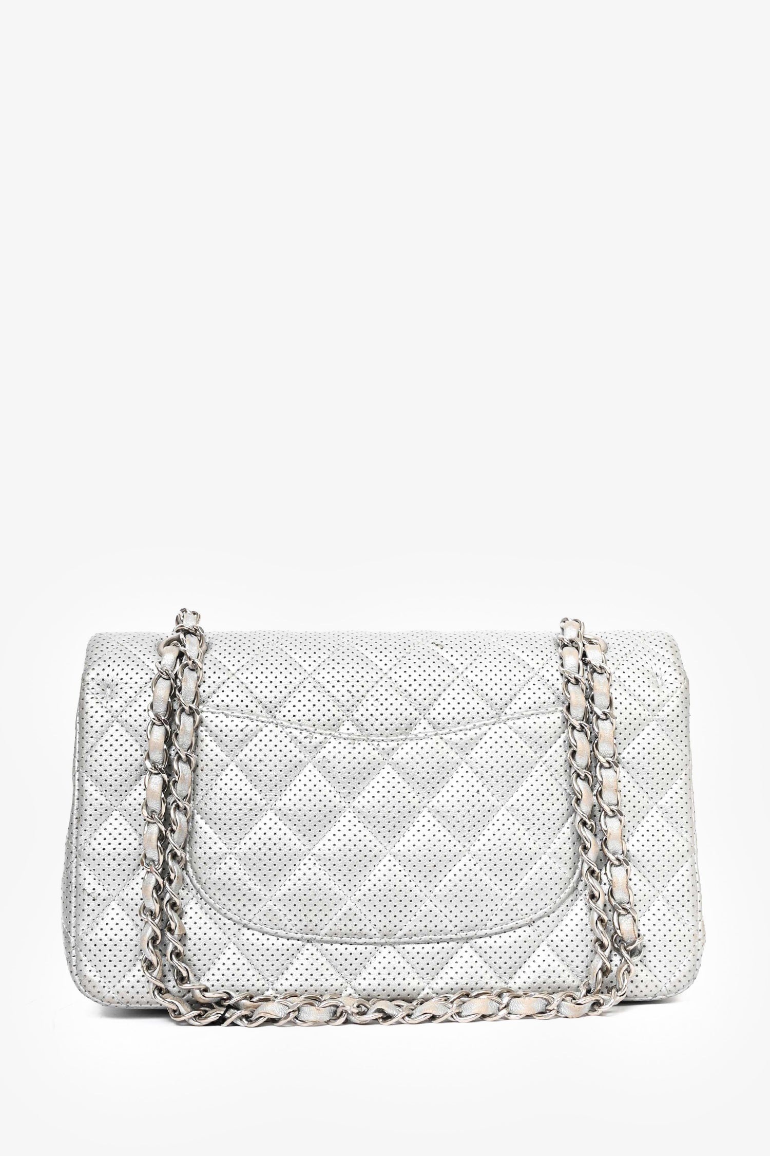 Pre-Loved Chanel™ 2014 Silver Perforated Leather Medium Double Flap Shoulder Bag. Front fold-over flap with turn-lock closure. Front fold-over flap with snap-button closure. 2 interior wall slip pockets. Zippered pocket on the interior of the front flap. Slide-around chain. Silver-tone hardware.