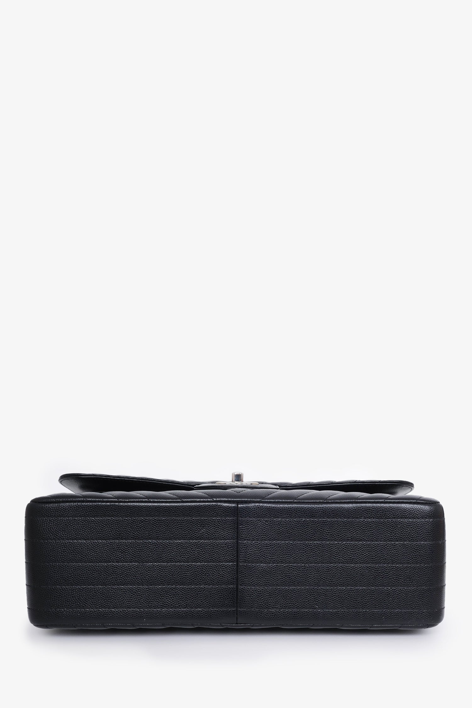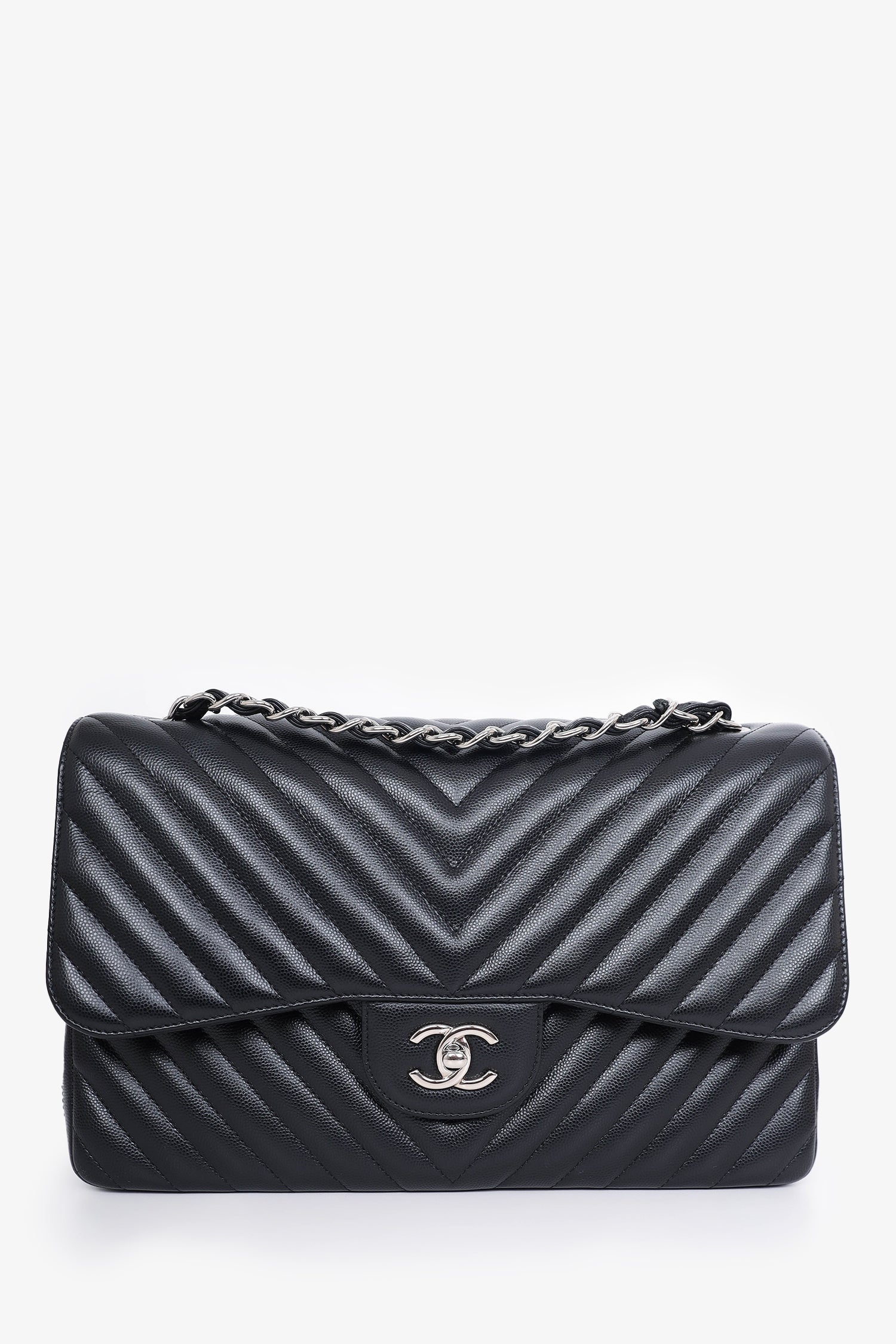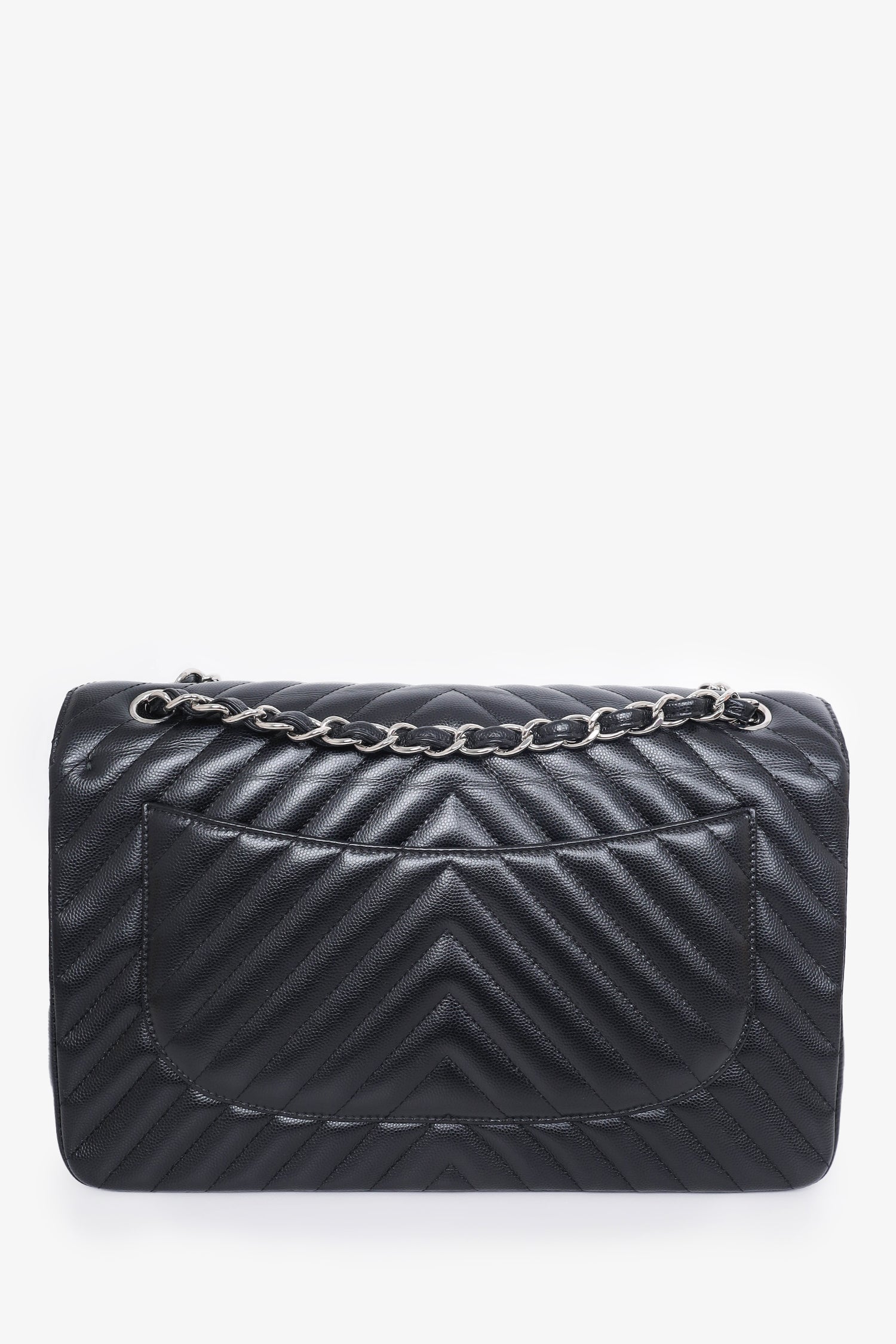 Pre-Loved Chanel™ 2016-17 Black Chevron Caviar Leather Jumbo Double Flap. Front fold-over flap with turn lock closure. Pocket with closure on interior side of flap. Front interior slip pocket with second fold-over flap. 2 interior wall slip pockets. Silver tone hardware. Exterior slip pocket on rear. Tonal stitching.