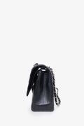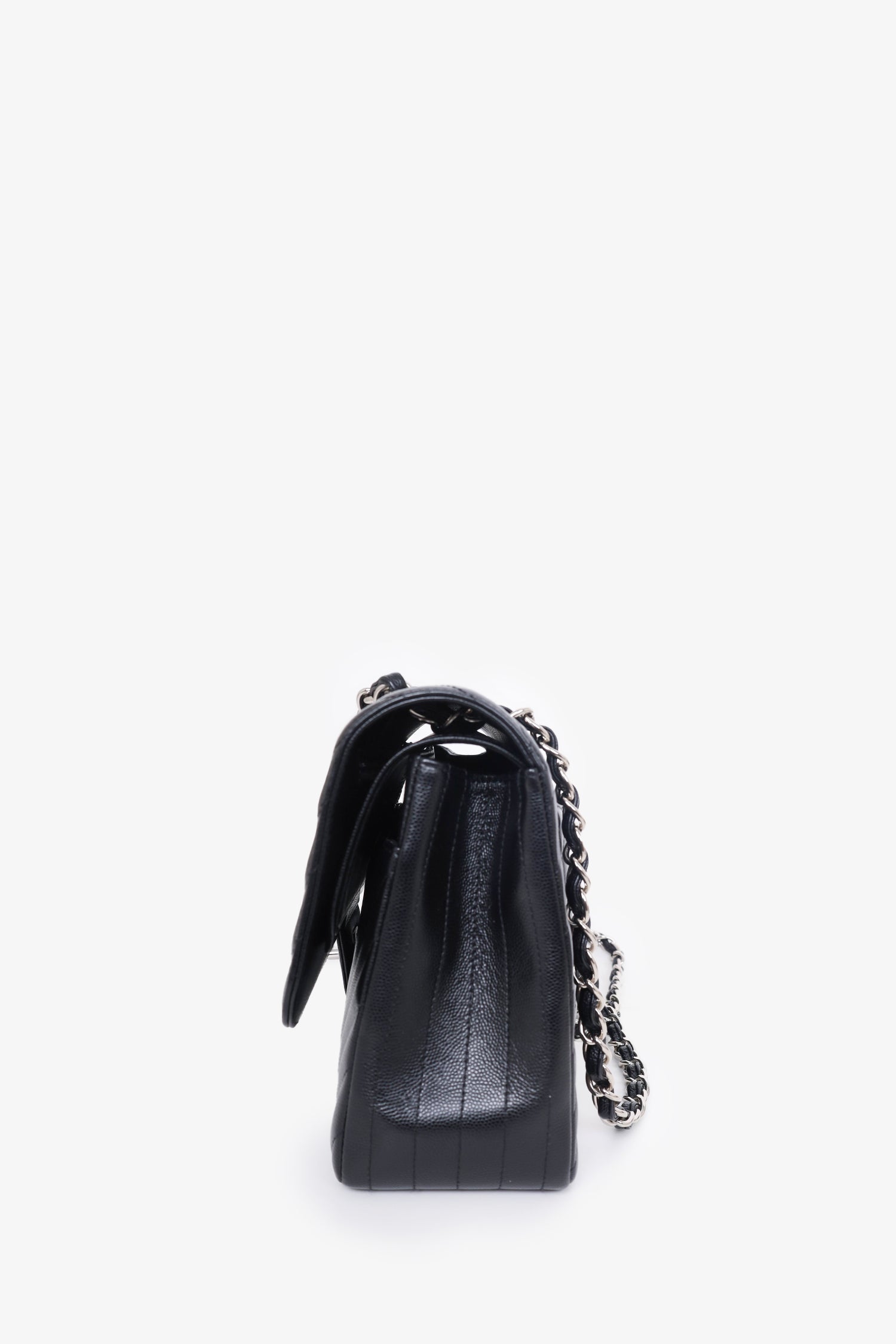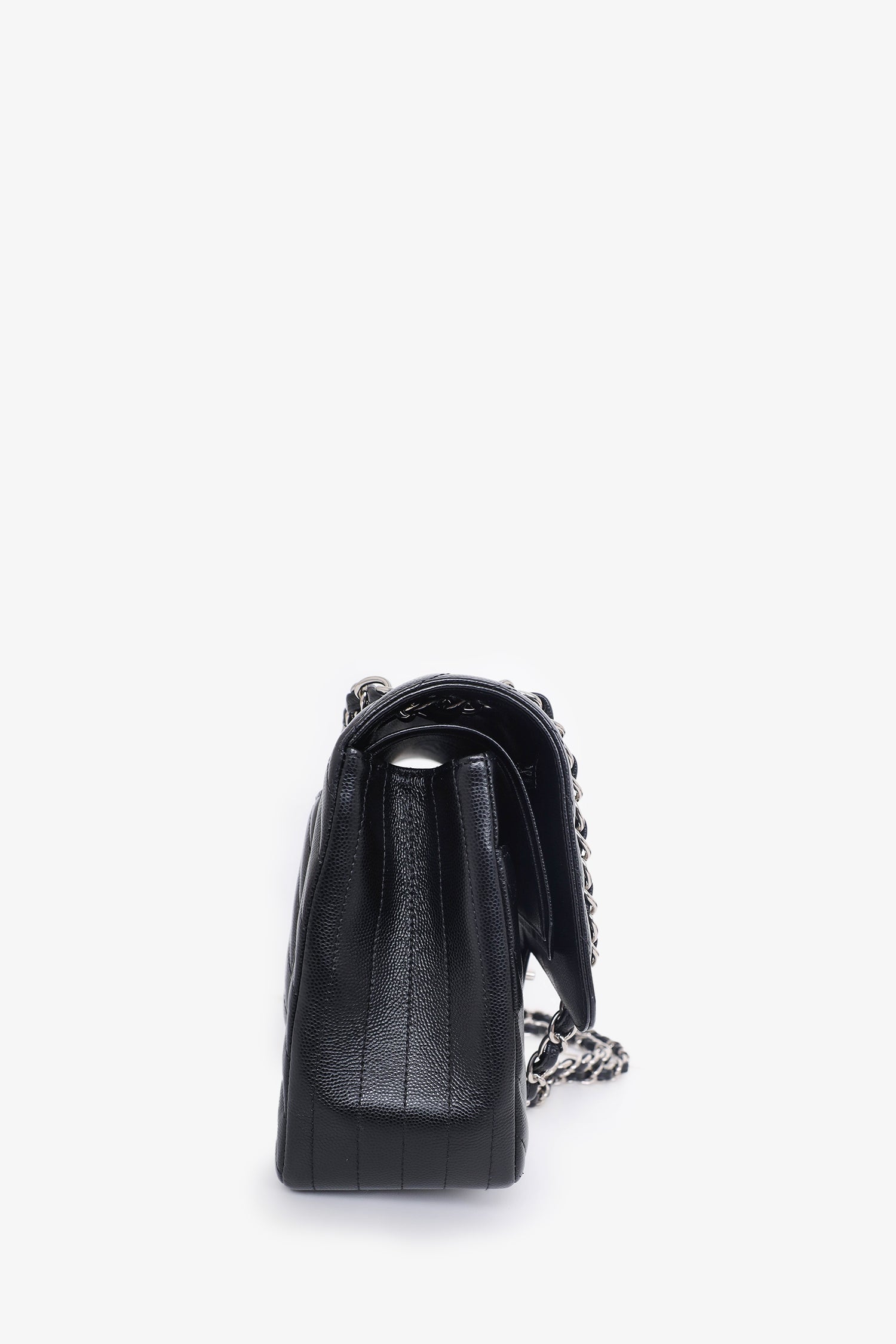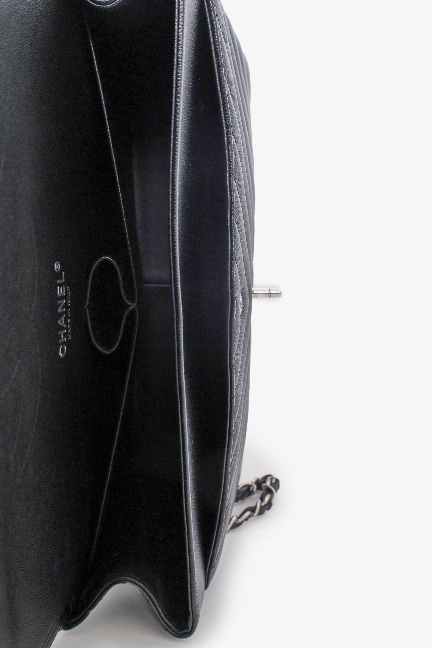 Pre-Loved Chanel™ 2016-17 Black Chevron Caviar Leather Jumbo Double Flap. Front fold-over flap with turn lock closure. Pocket with closure on interior side of flap. Front interior slip pocket with second fold-over flap. 2 interior wall slip pockets. Silver tone hardware. Exterior slip pocket on rear. Tonal stitching.