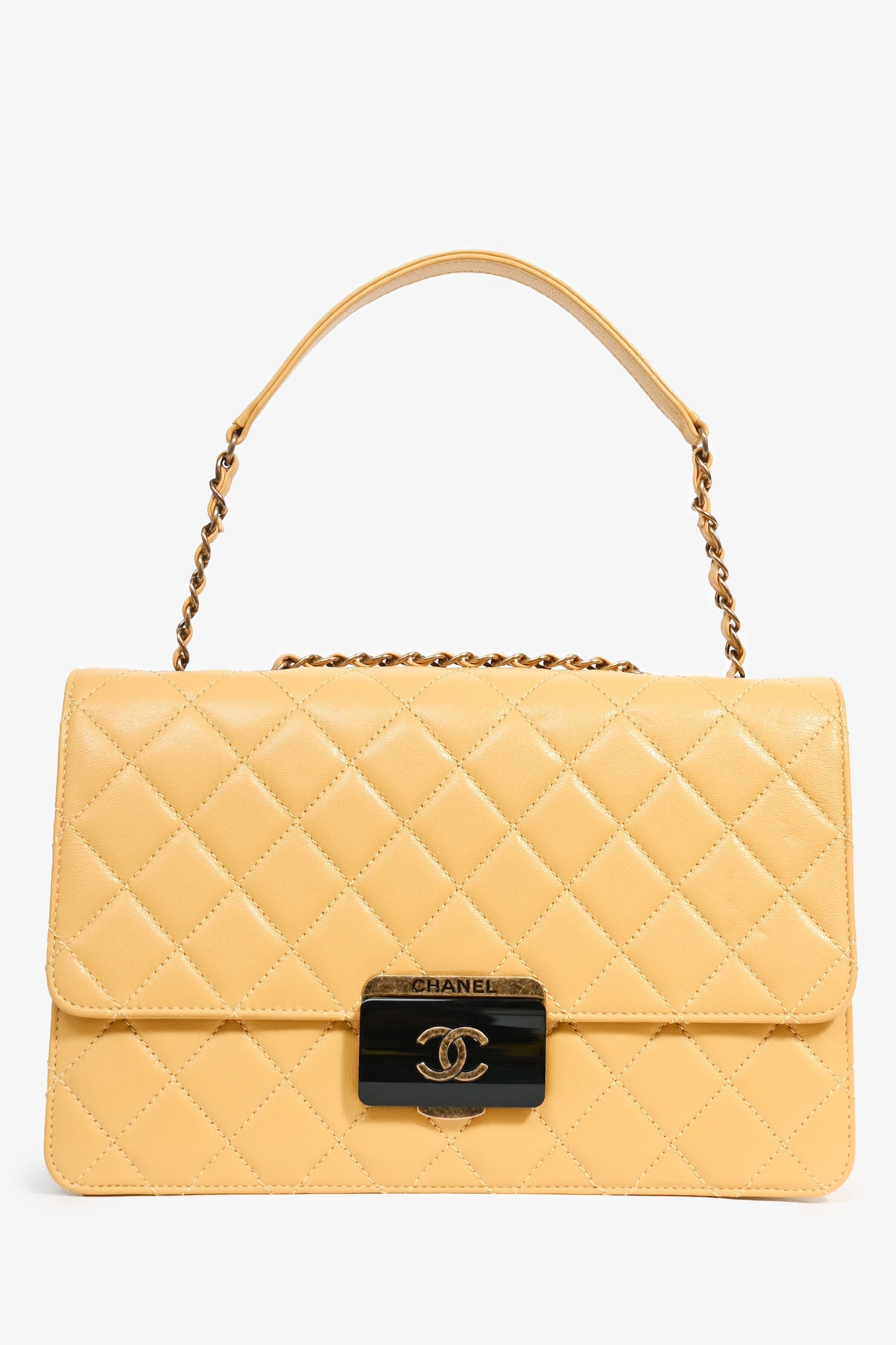 Pre-Loved Chanel™ 2016-17 Yellow Quilted Leather Large Beauty Lock Chain Bag. Front fold-over flap with push lock closure. Distressed hardware details.
