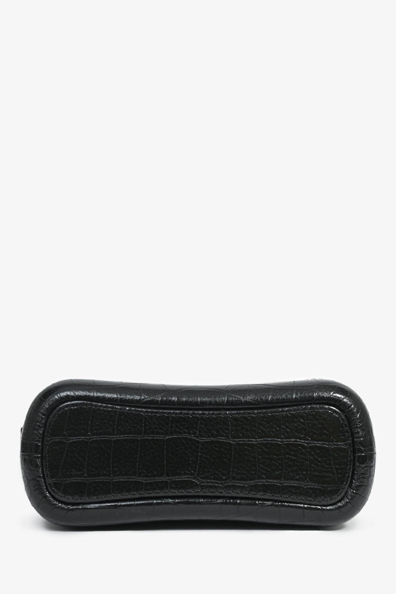 Pre-Loved Chanel™ 2019-20 Black Croc Embossed Leather Medium Gabrielle Crossbody Bag with Logo Strap. Top zipper closure. Single compartment with 2 wall slip pockets and a wall zip pocket. Built-in pouch strap. Detachable straps and handle. Adjustable strap. Two-tone hardware. Lined. Tonal stitching.