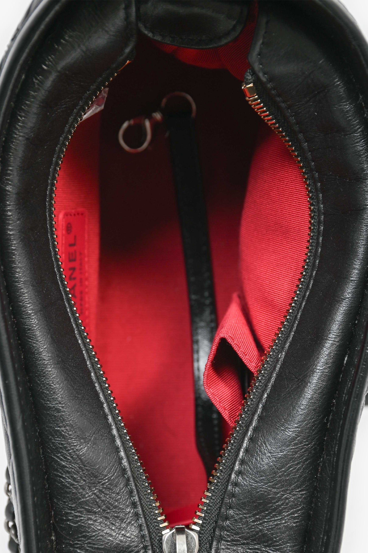 Pre-Loved Chanel™ 2019 Black Lambskin Leather Small Gabrielle Bag. Top zip closure. Red textile interior lining. 3 interior wall pockets; 2 slip and 1 with zip closure. Duo-tone hardware.