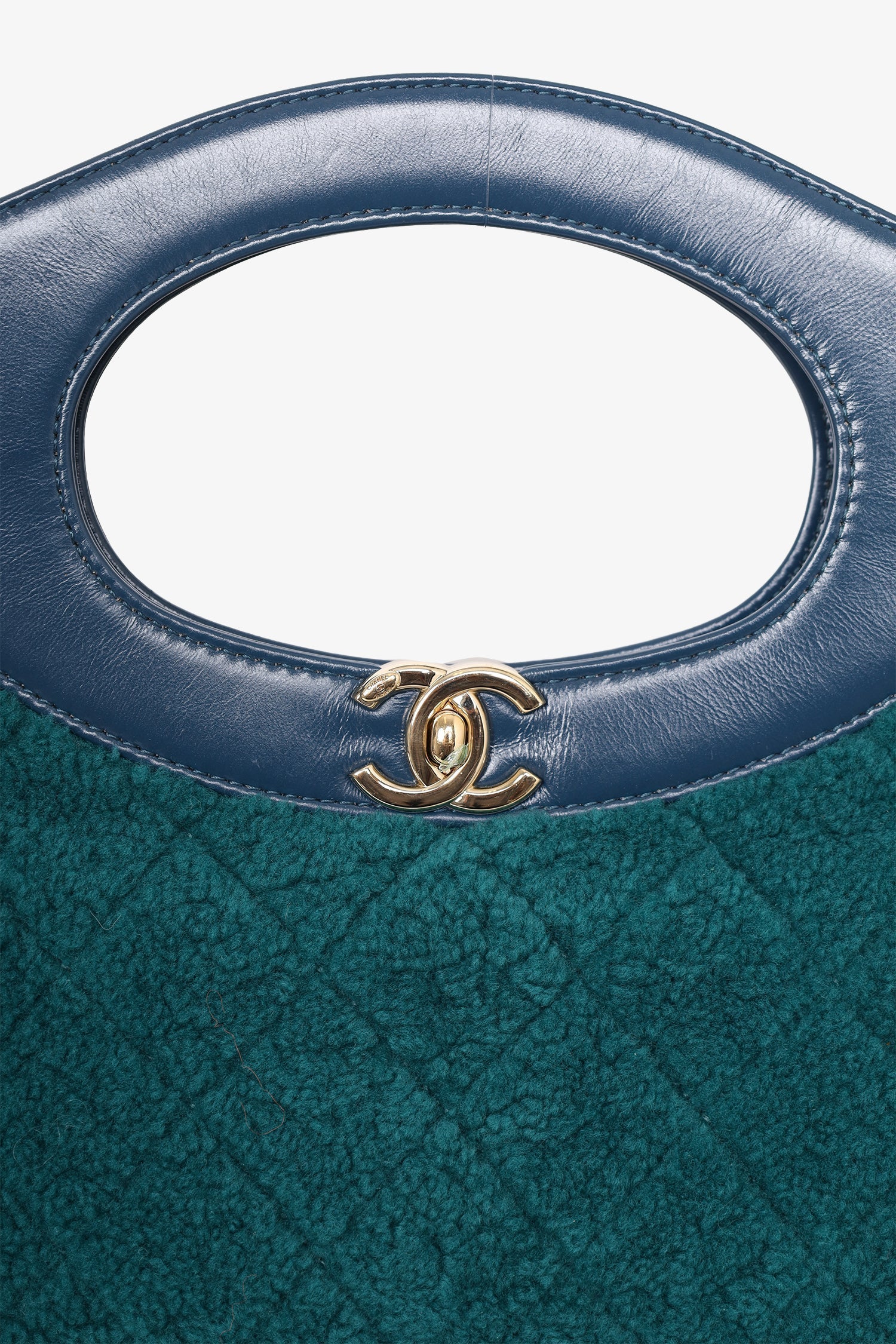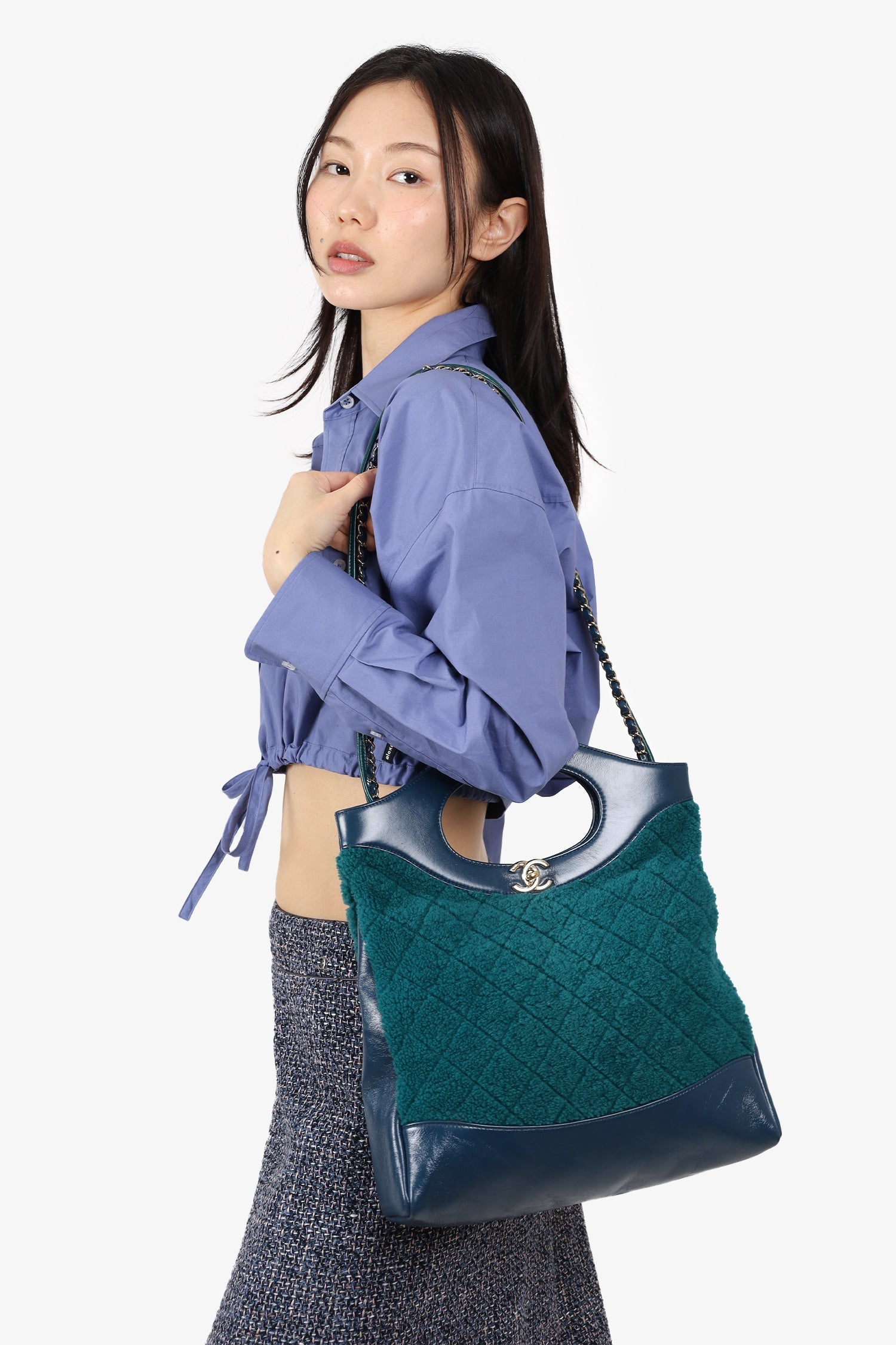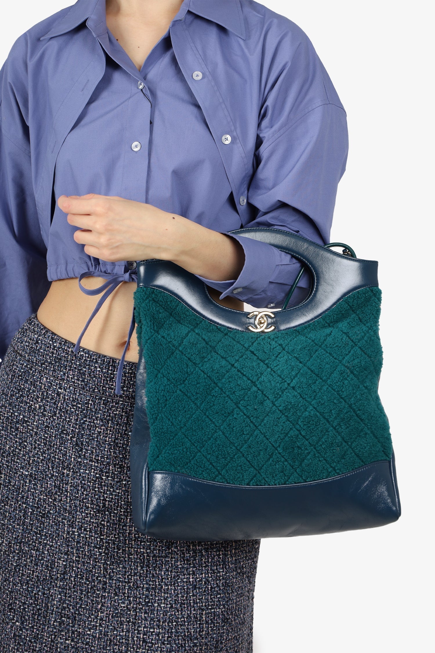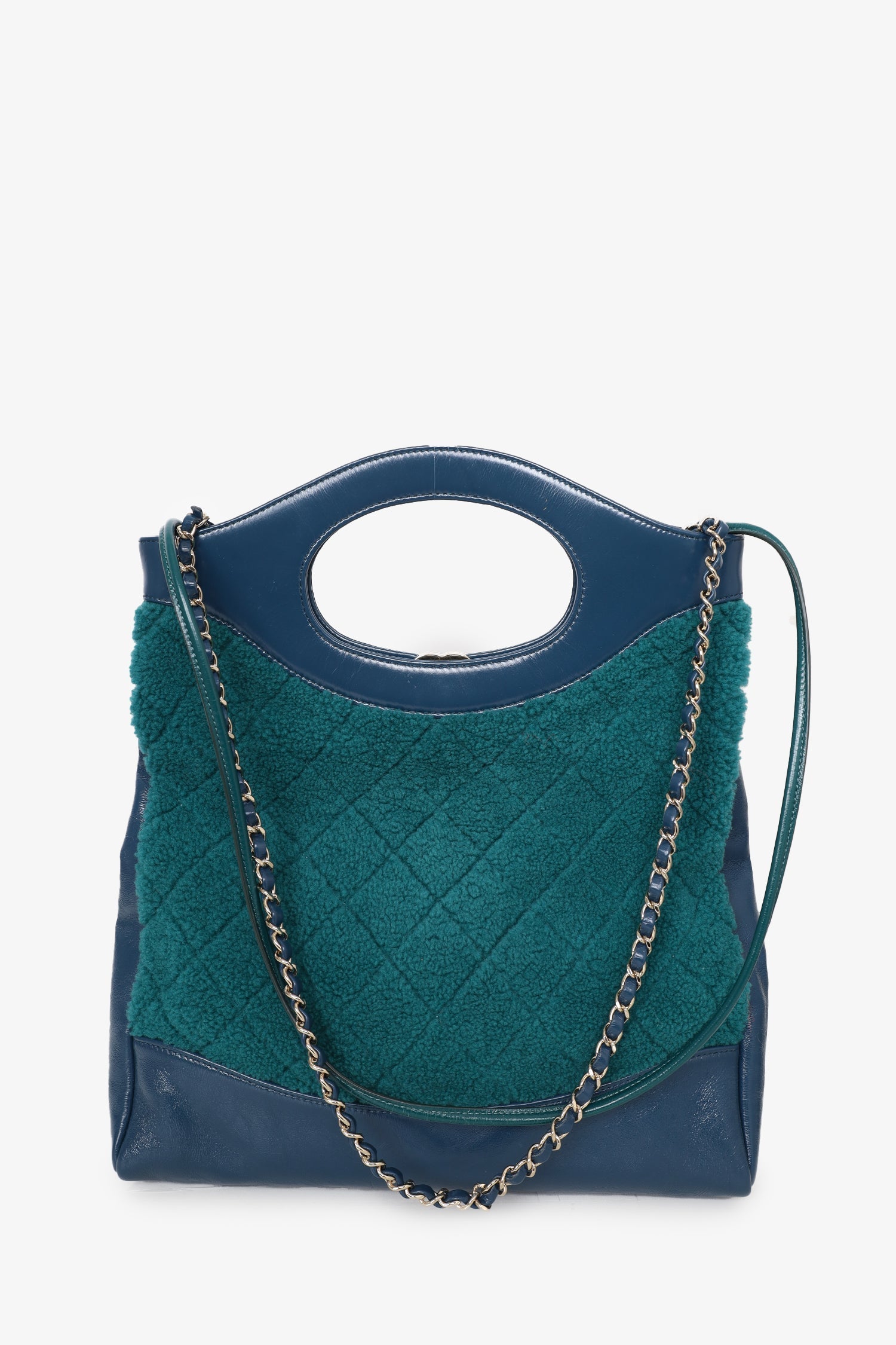 Pre-Loved Chanel™ 2019 Blue/Green Quilted Shearling/Leather 31 Shopping Bag. Turn-lock closure. 2 zip pockets. 2 shoulder straps. Interior key leash Gold-toned hardware. Tonal stitching.