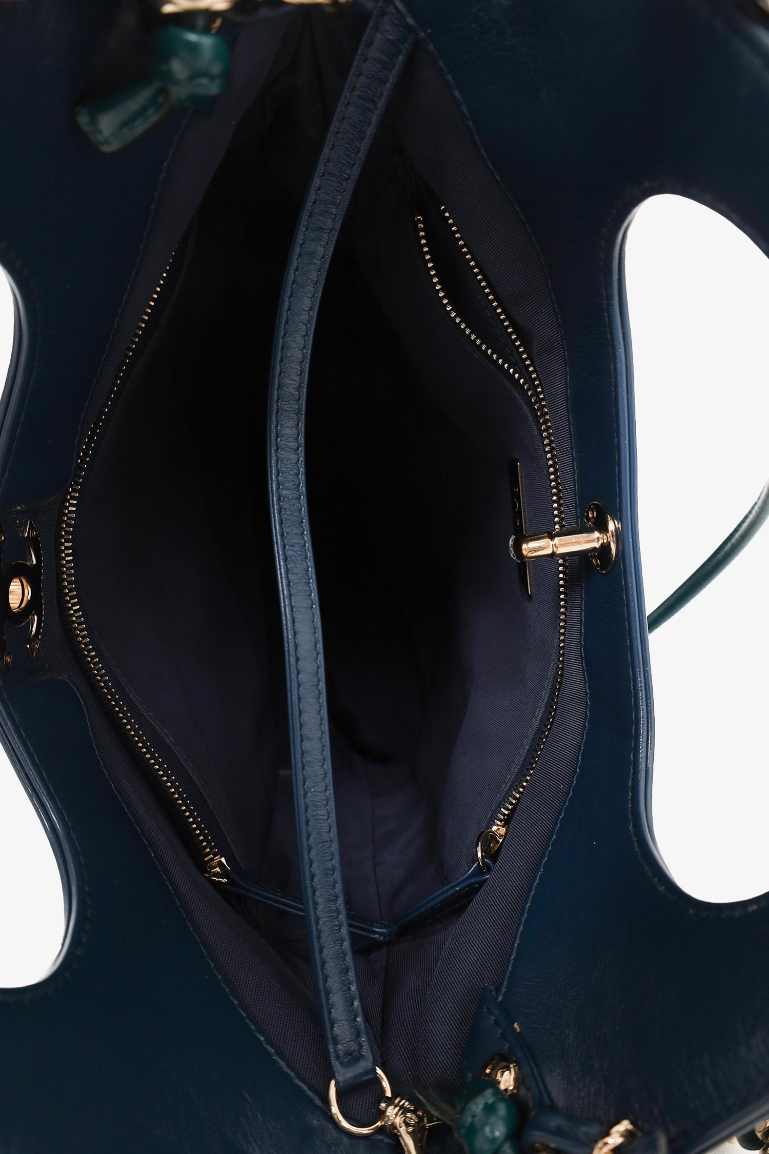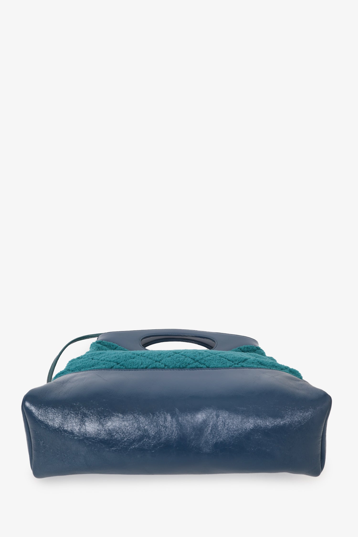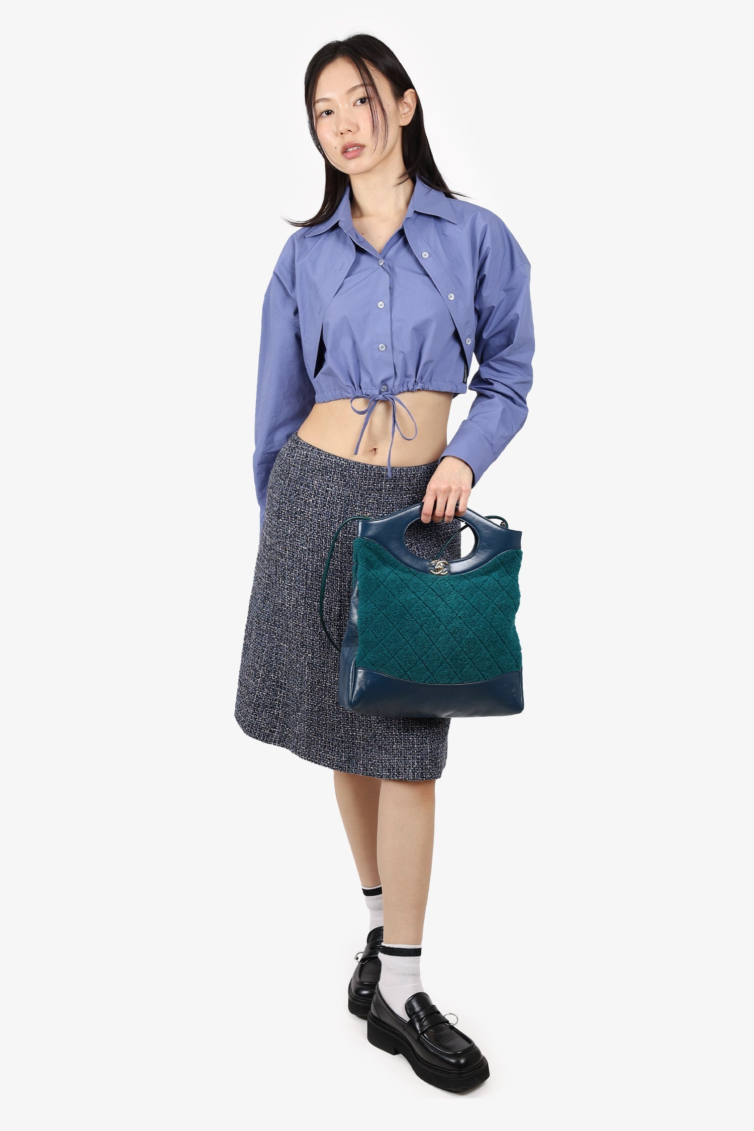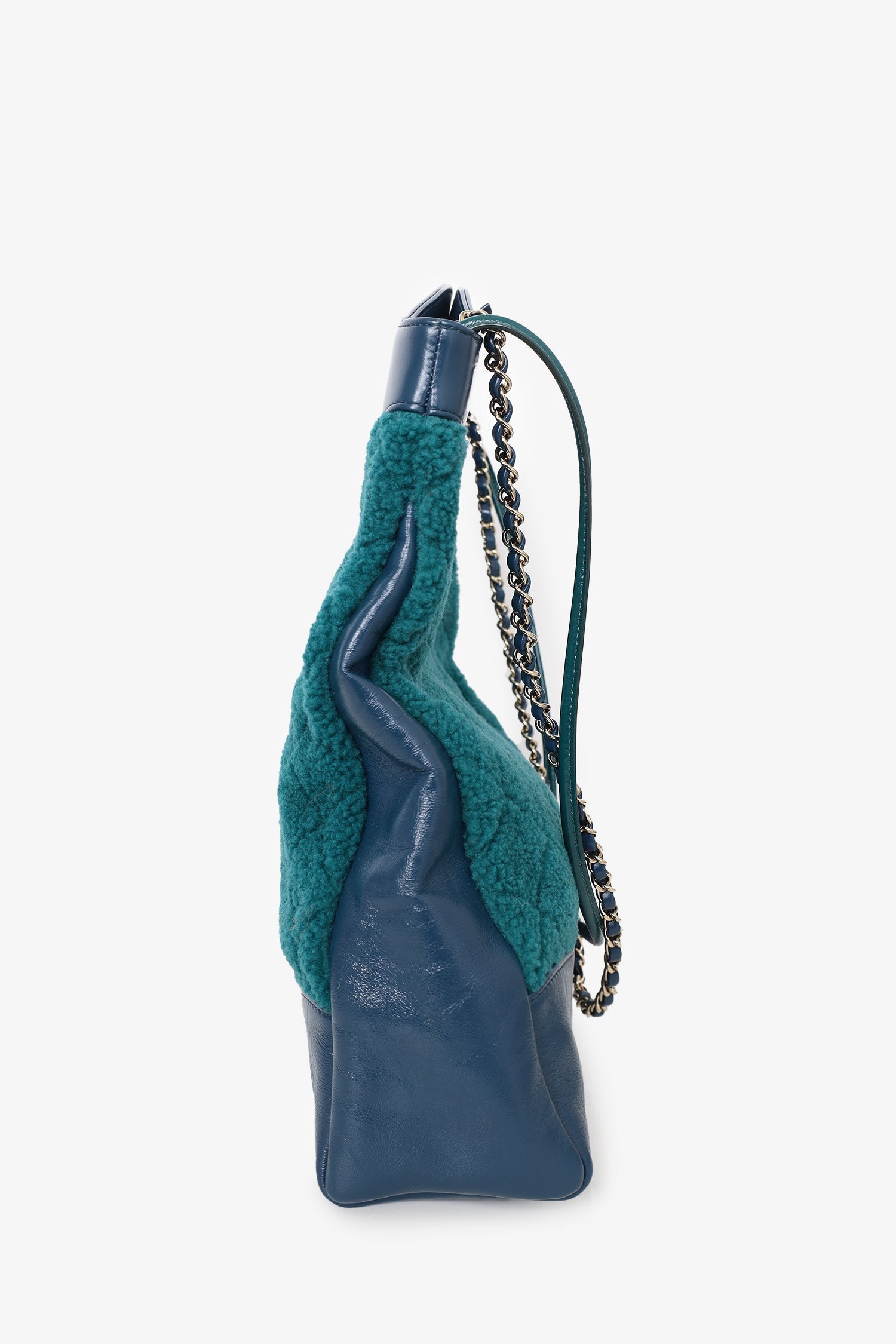 Pre-Loved Chanel™ 2019 Blue/Green Quilted Shearling/Leather 31 Shopping Bag. Turn-lock closure. 2 zip pockets. 2 shoulder straps. Interior key leash Gold-toned hardware. Tonal stitching.