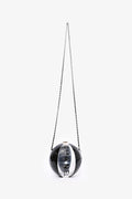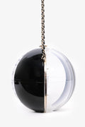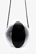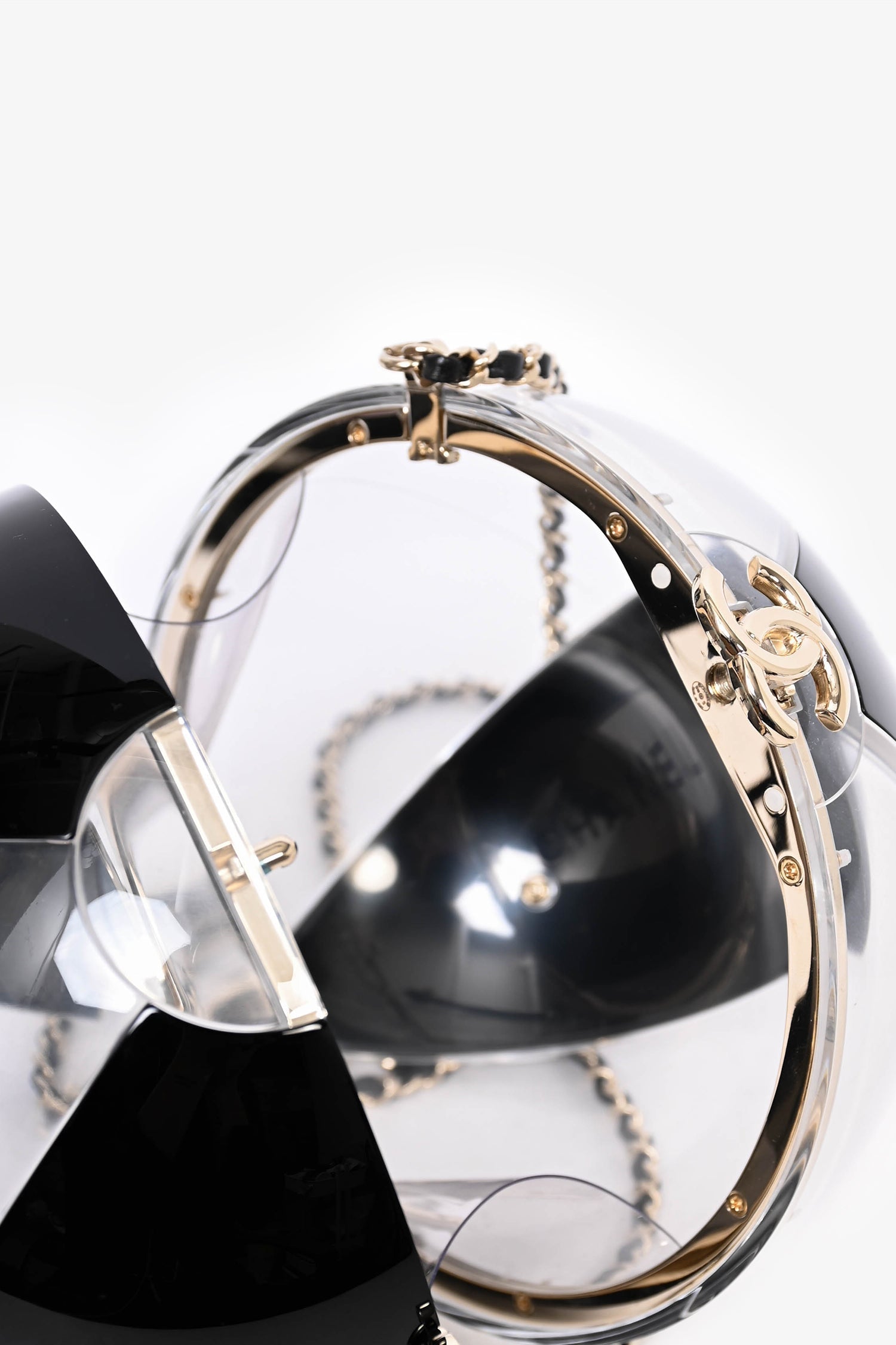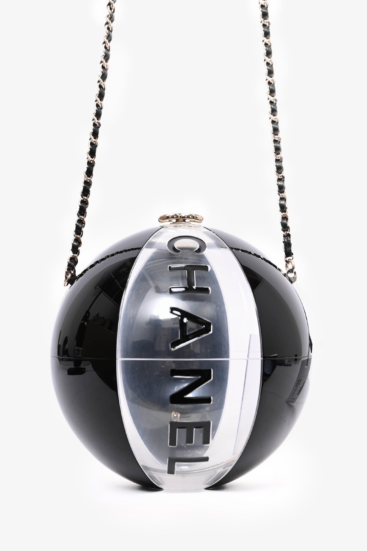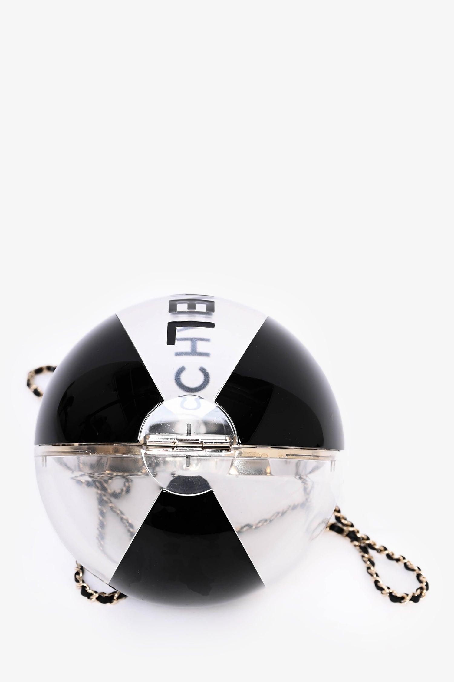 Pre-Loved Chanel™ 2019 Coco Beach Ball Minaudière Clutch Bag. Chain-link strap with gold-tone accents. 'CC' closure. Black opaque and clear beach stripes throughout. Bifold opening.