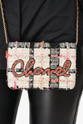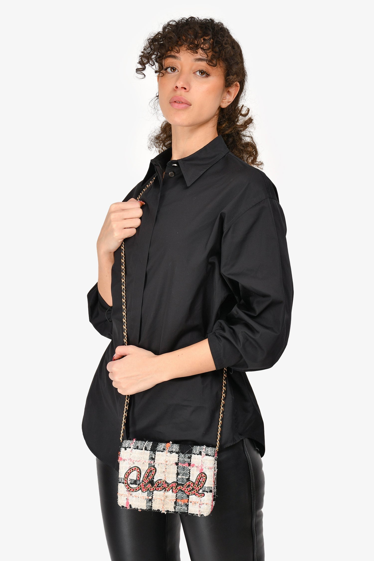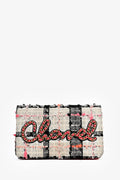 Pre-Loved Chanel™ 2019 Pink/Black/Cream Tweed Wallet On Chain