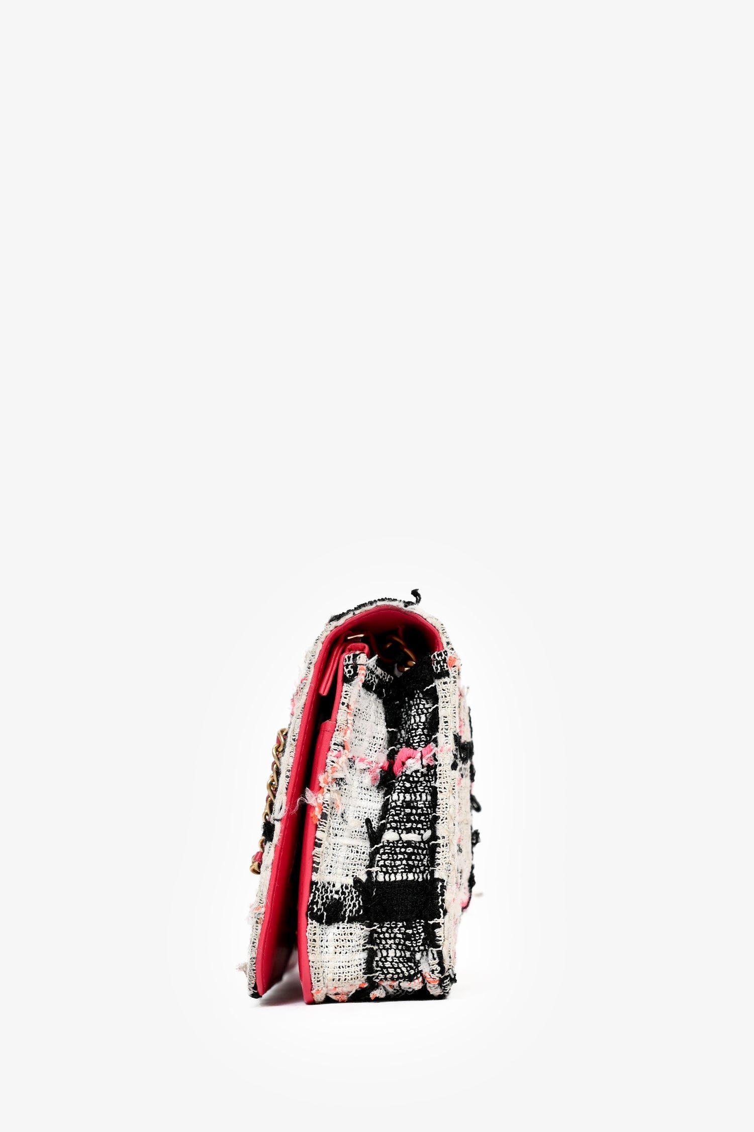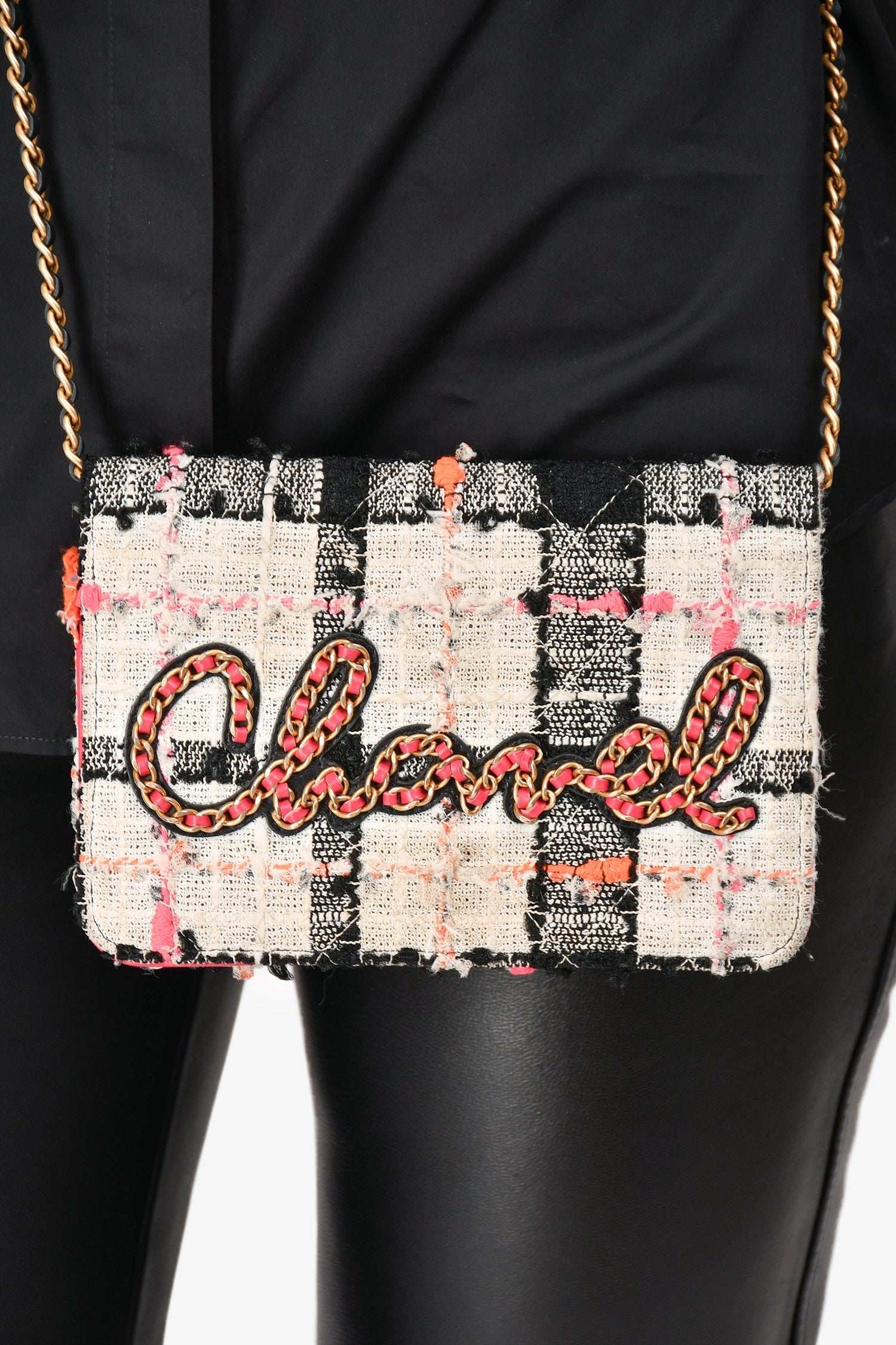 Pre-Loved Chanel™ 2019 Pink/Black/Cream Tweed Wallet On Chain. Gold-toned hardware. Fold over flap with magnet closure. Three interior compartments; open compartment with six card holder slots; one middle zipped compartment and one slip compartment at the front. Zipper with leather pull tab under flap. Chain-link shoulder strap. Tonal stitching.