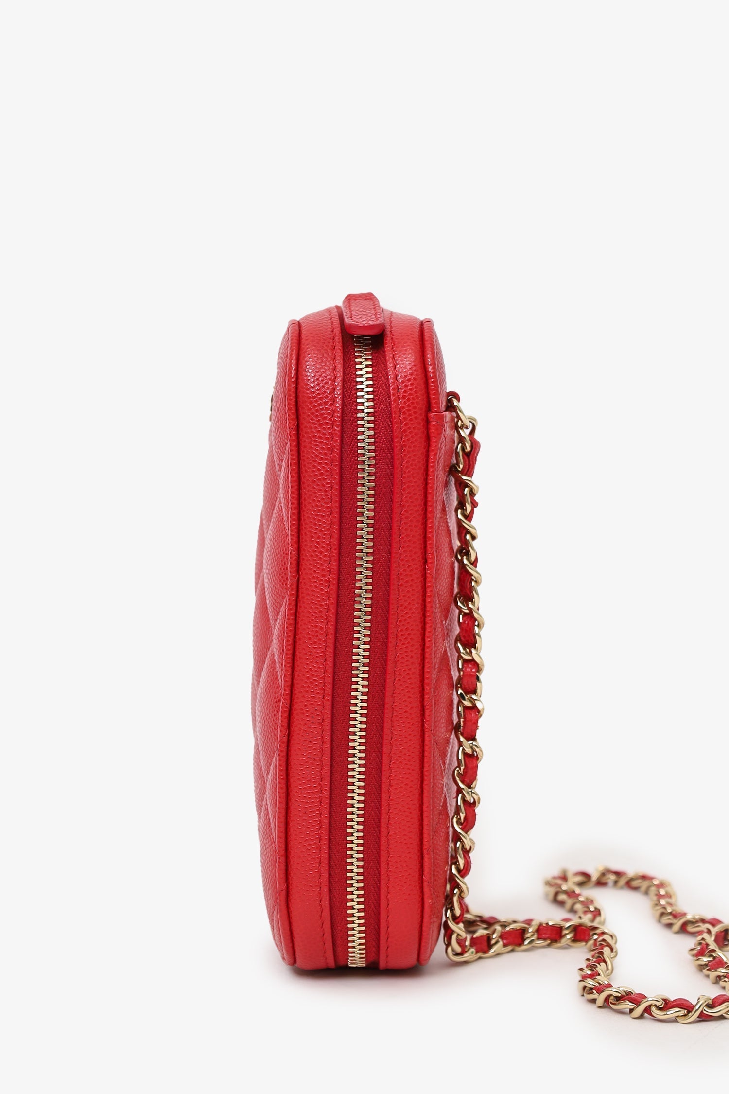 Pre-Loved Chanel™ 2019 Red Caviar Vertical ZIP Around Phone Chain Bag. 3/4 zip closure. Chainlink strap. 2 interior compartment; 1 slip pocket on each side. Gold-tone hardware. Tonal stitching.