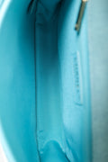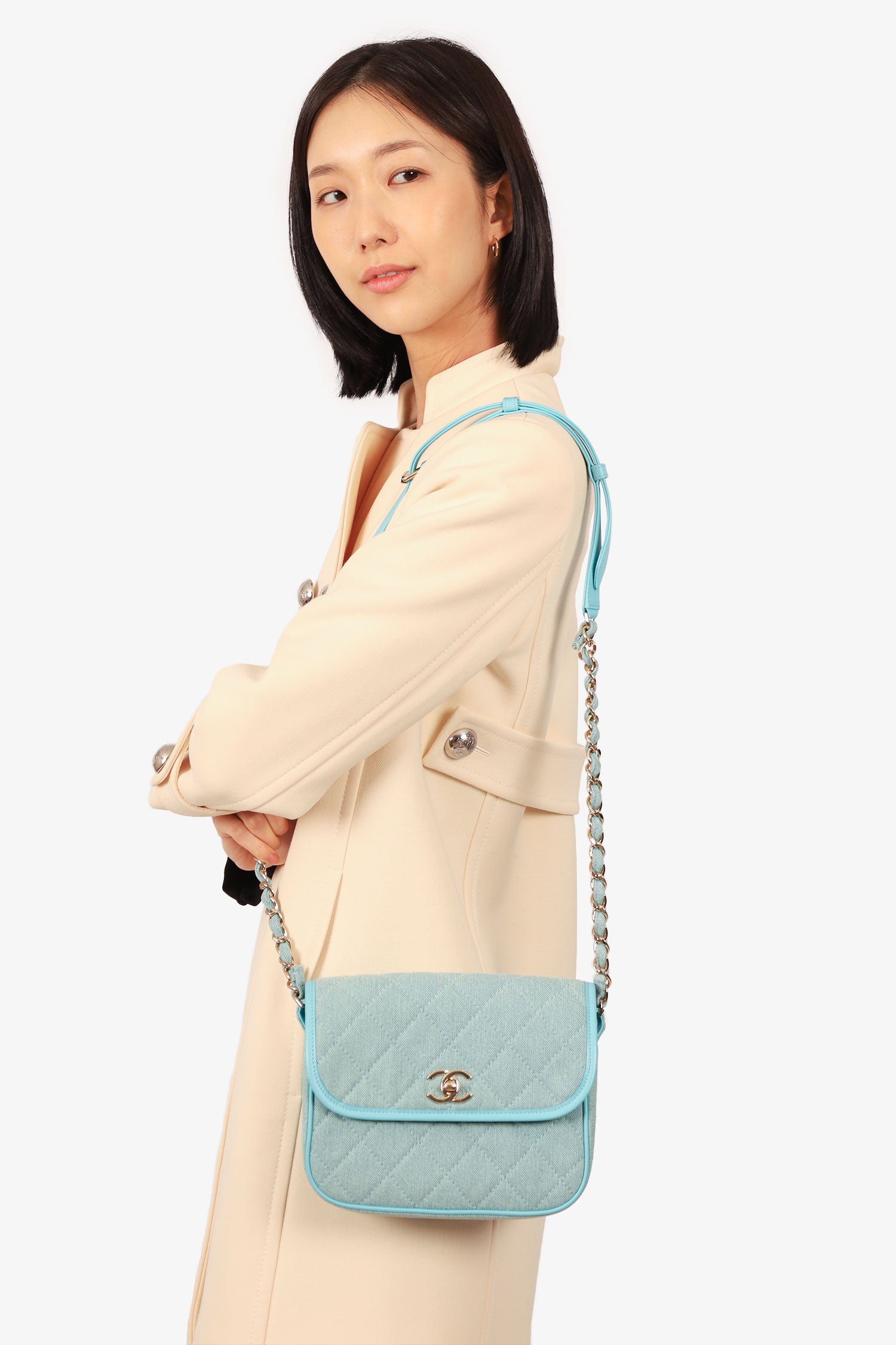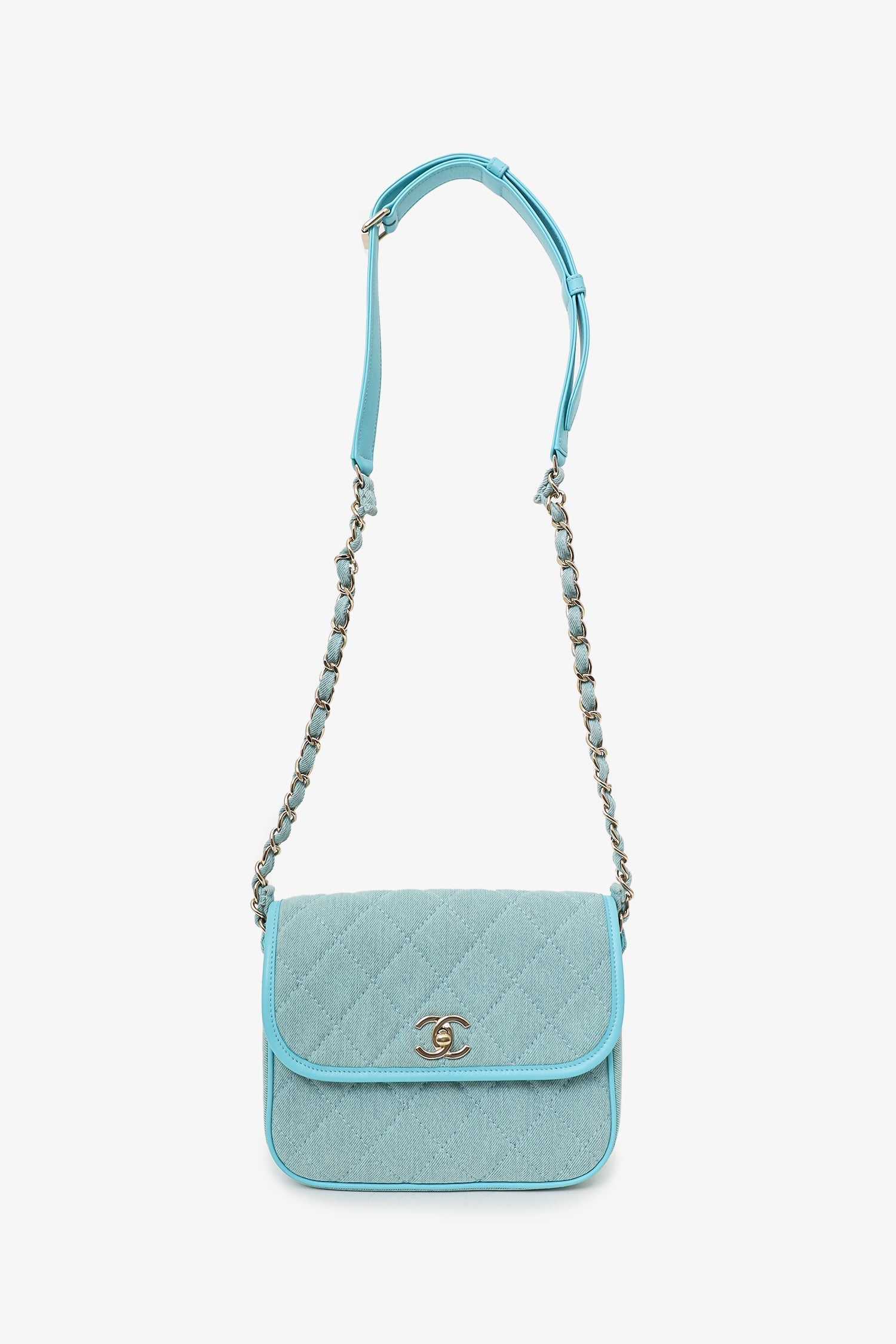 Pre-Loved Chanel™ 2021 Blue Denim Quilted CC Small Messenger Flap Bag. Front fold-over flap with turn-lock closure. Adjustable chainlink and leather shoulder/crossbody strap with buckle closure. 1 rear exterior slip pocket. 2 interior compartment; front slip compartment and back compartment with single zip pocket. Leather-trimmed. Satin-lined interior. Gold-tone hardware. Tonal stitching.
