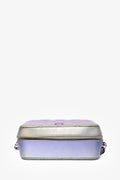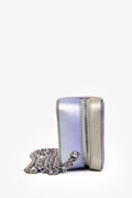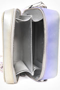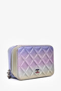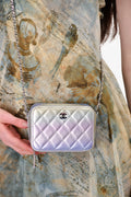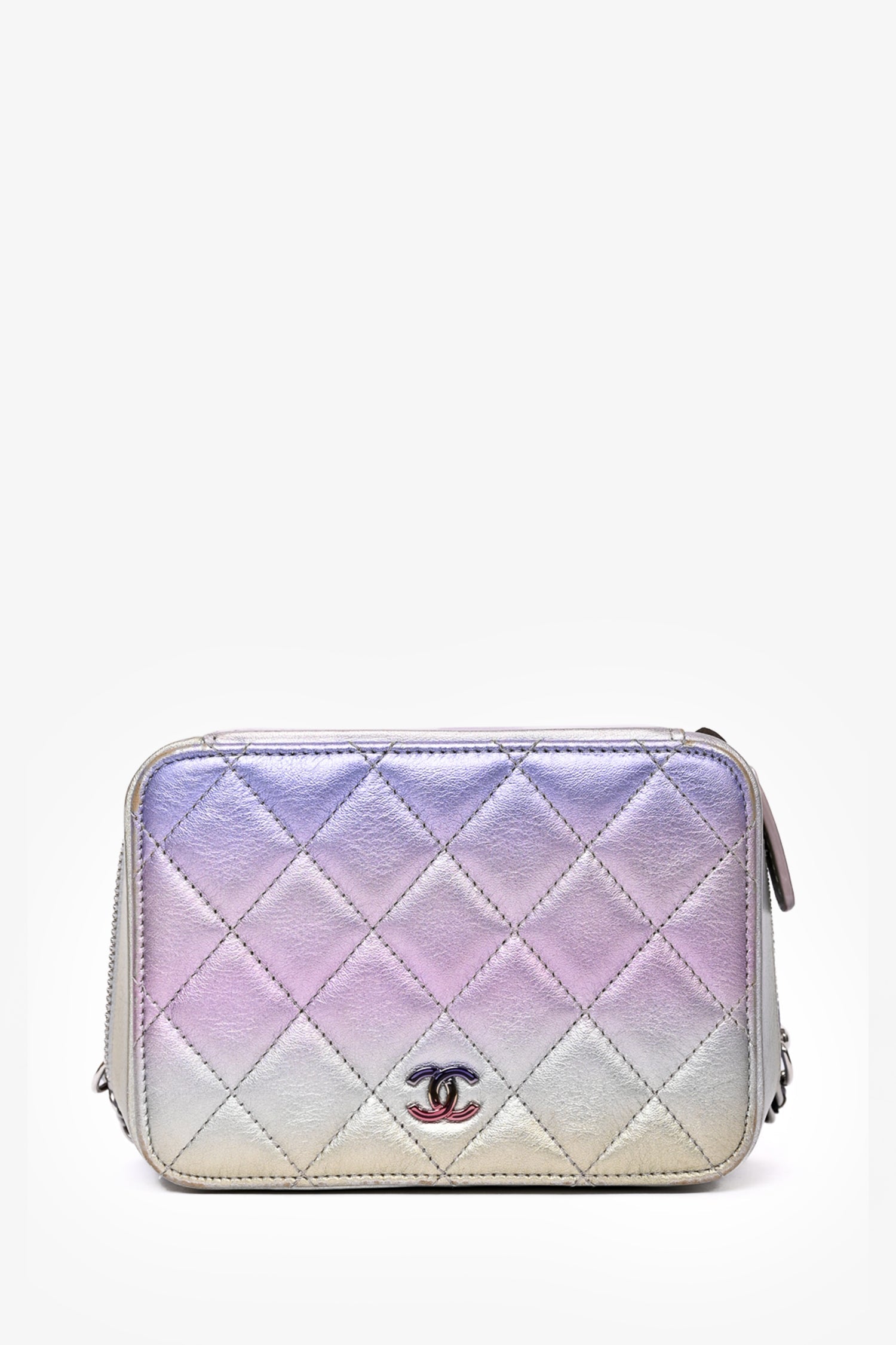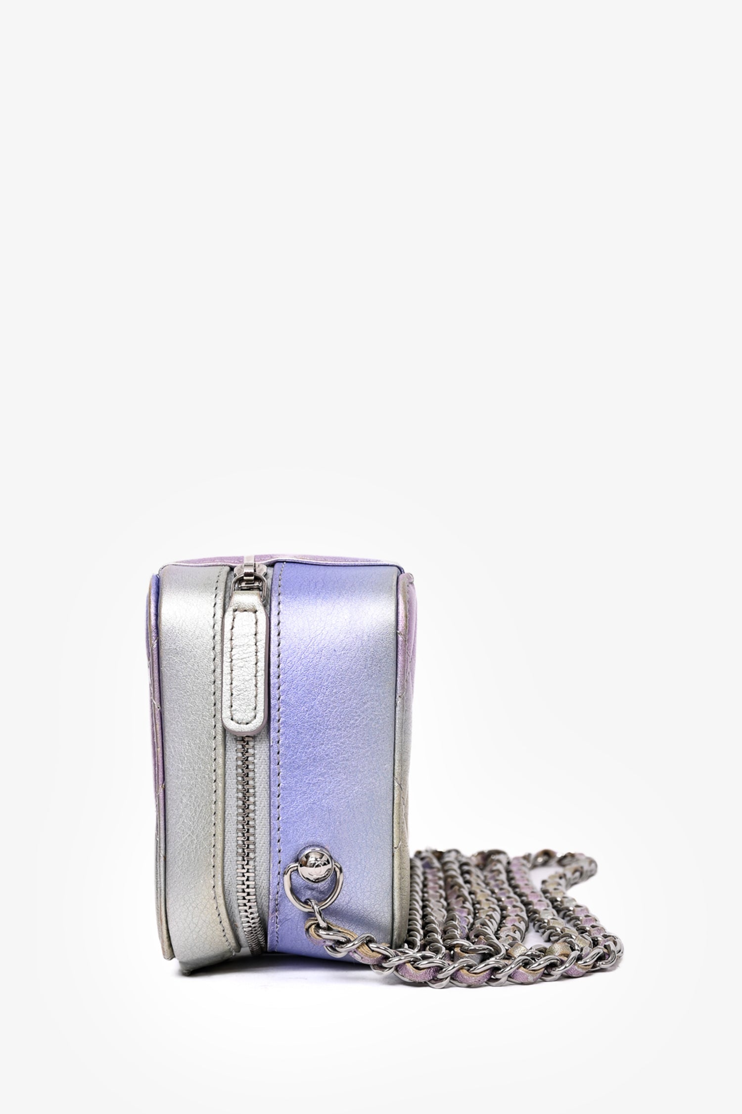 Pre-loved Chanel™ 2021 Iridescent Quilted Lambskin Cube Crossbody. Top zip closure. 2 interior compartments; separated by a divider. 4 interior wall card slots. Silver-tone hardware. Tonal stitching.