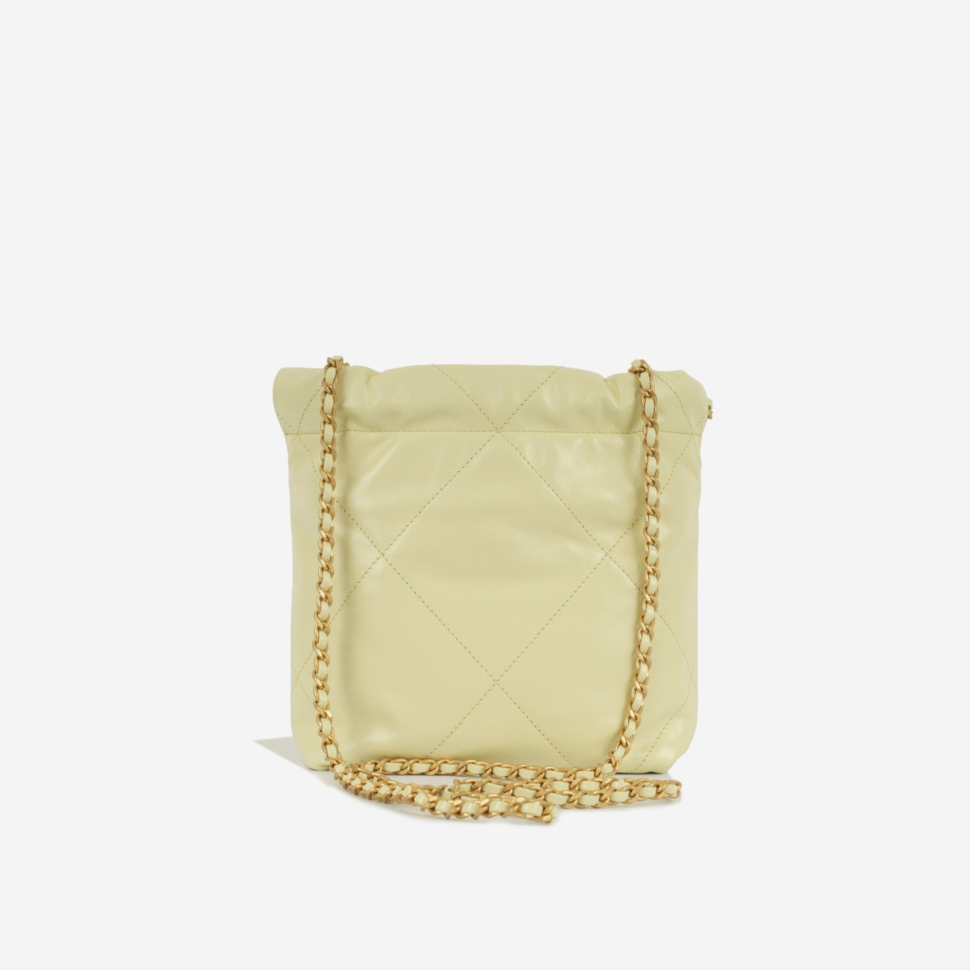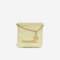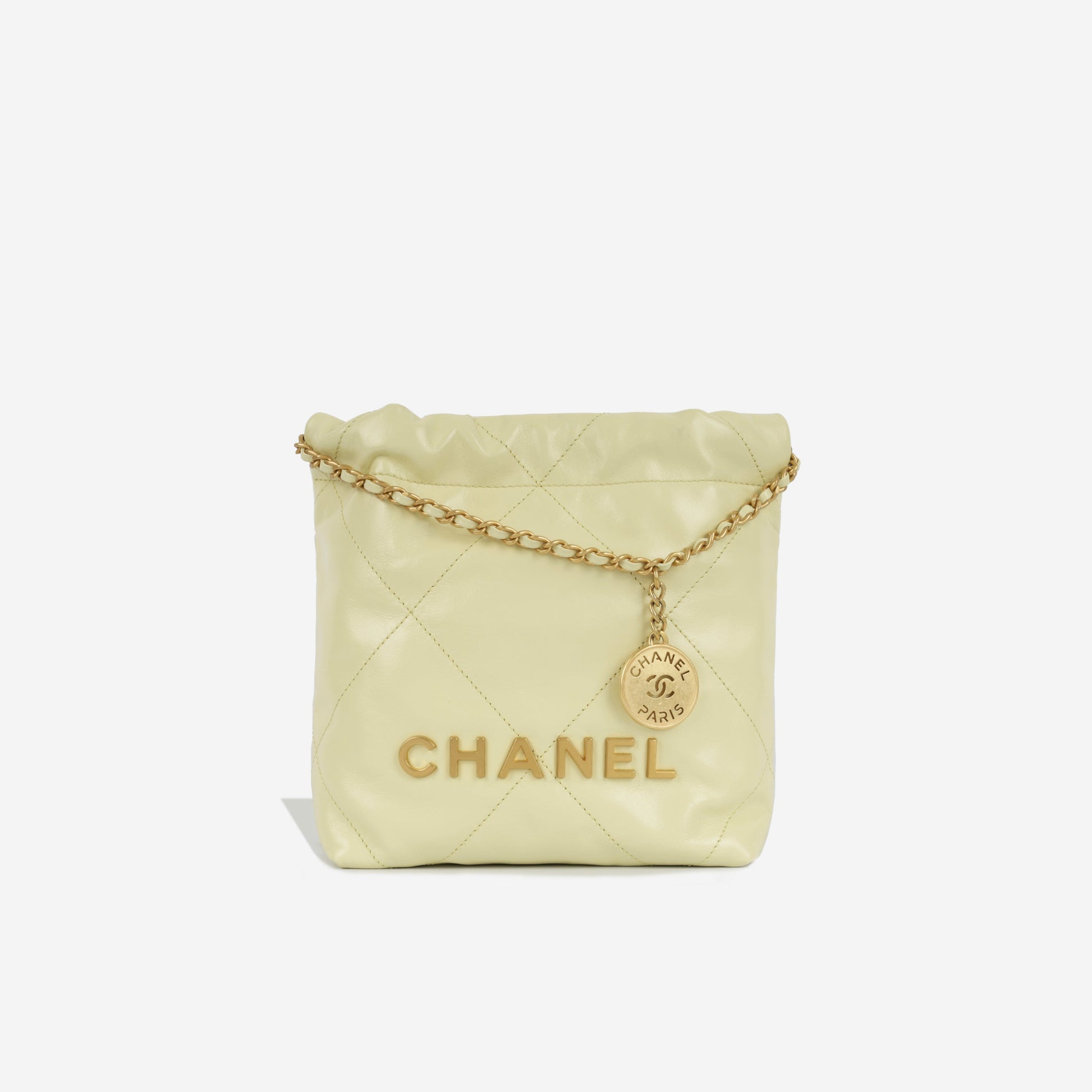Carefully crafted from shiny crumpled calfskin leather, Chanel presents their 22 Mini. The chicest item for the lady that wants to carry everything around with them, this bag features Chanels classic interwoven back straps along with top handles to carry it handheld. This piece from 2023 is a well worthy addition to any luxury handbag collection.