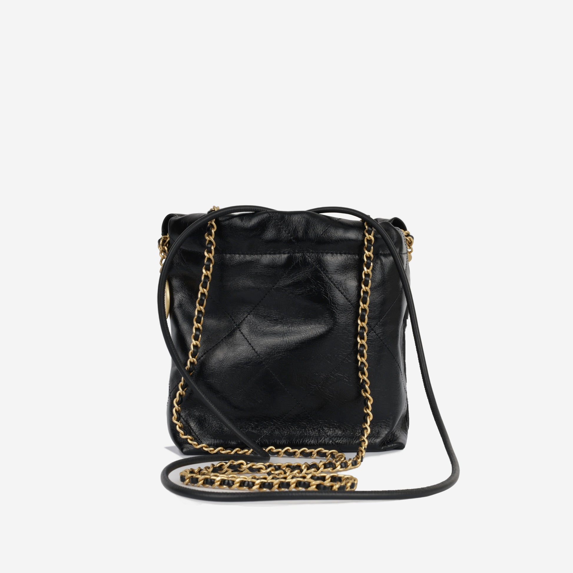 Carefully crafted from shiny crumpled calfskin leather, Chanel presents their 22 Mini. The chicest item for the lady that wants to carry everything around with them, this bag features Chanels classic interwoven back straps along with top handles to carry it handheld. This piece from 2023 is a well worthy addition to any luxury handbag collection.