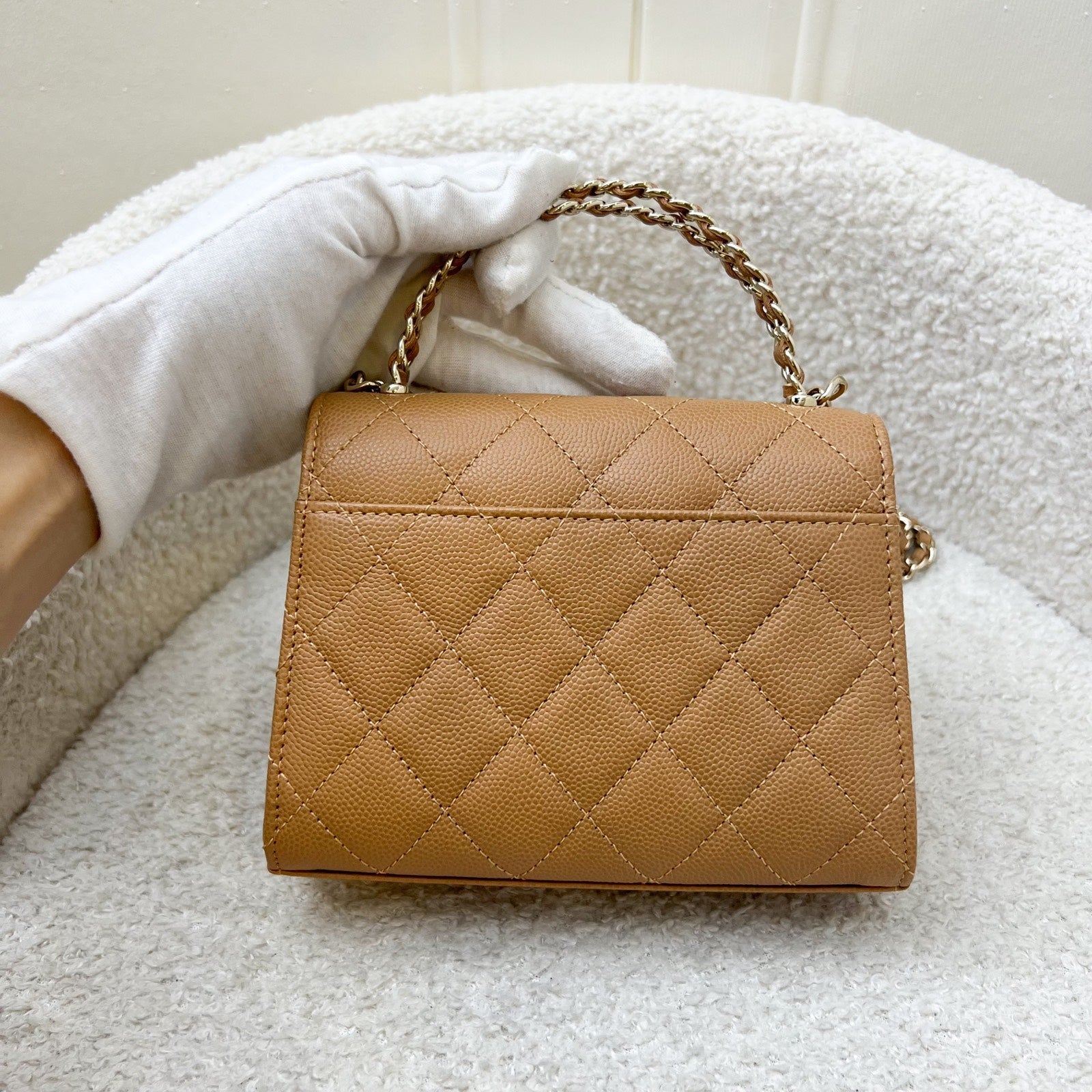 Chanel 23P Top Handle Kelly Clutch with Chain in Caramel Caviar and GHW (Model: AP3237)