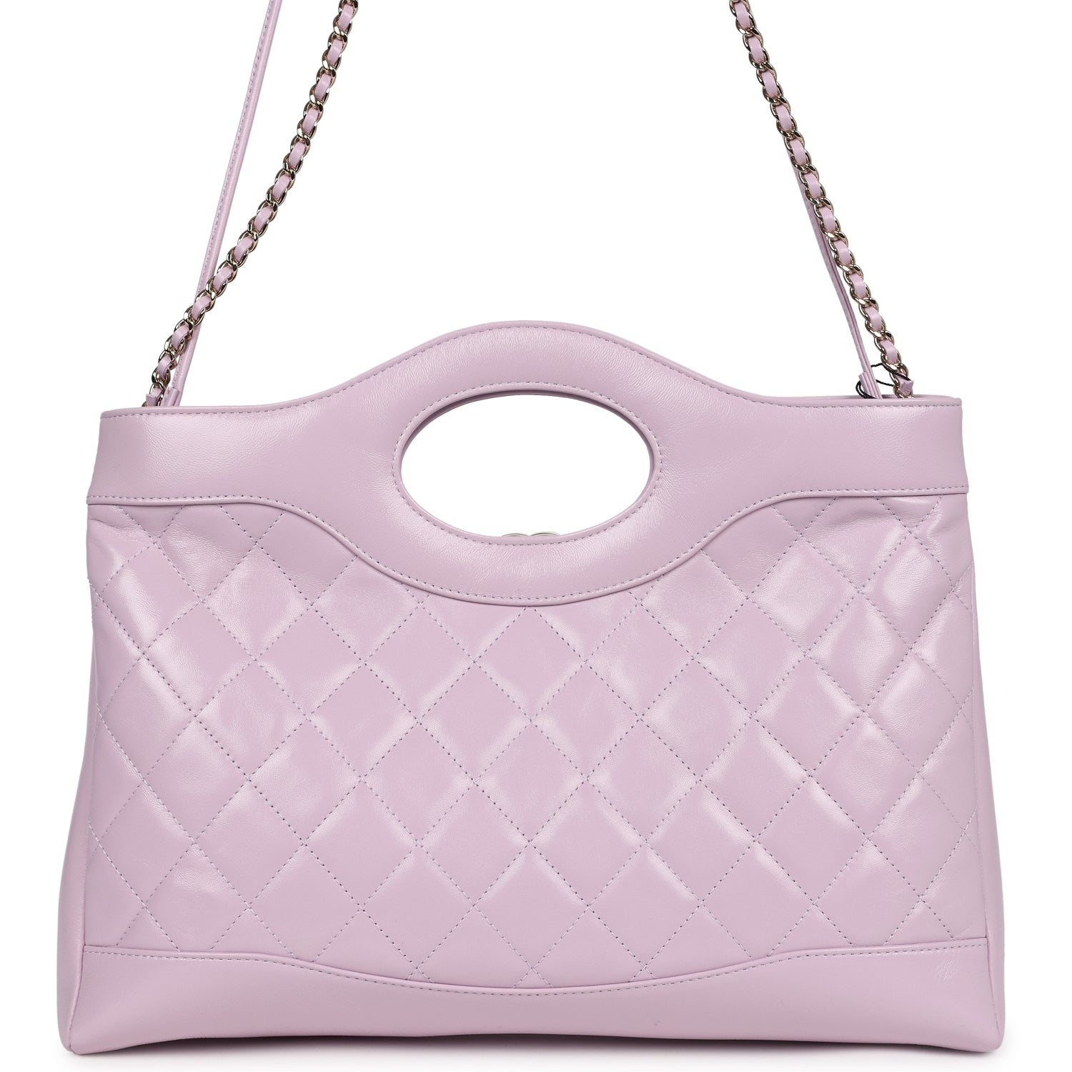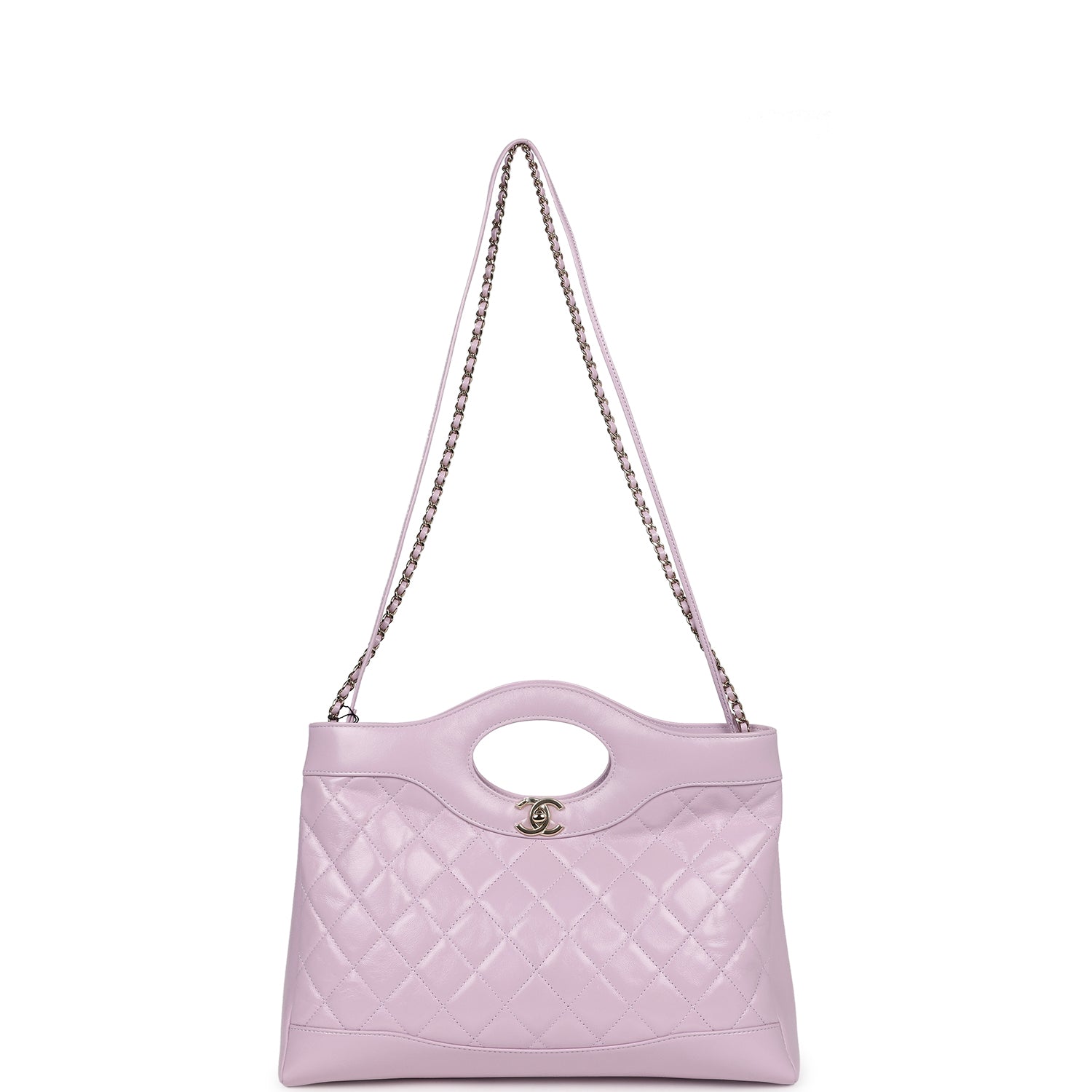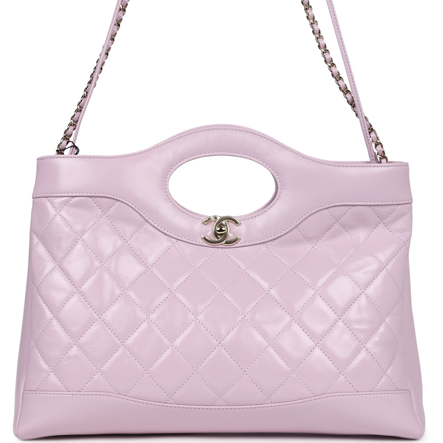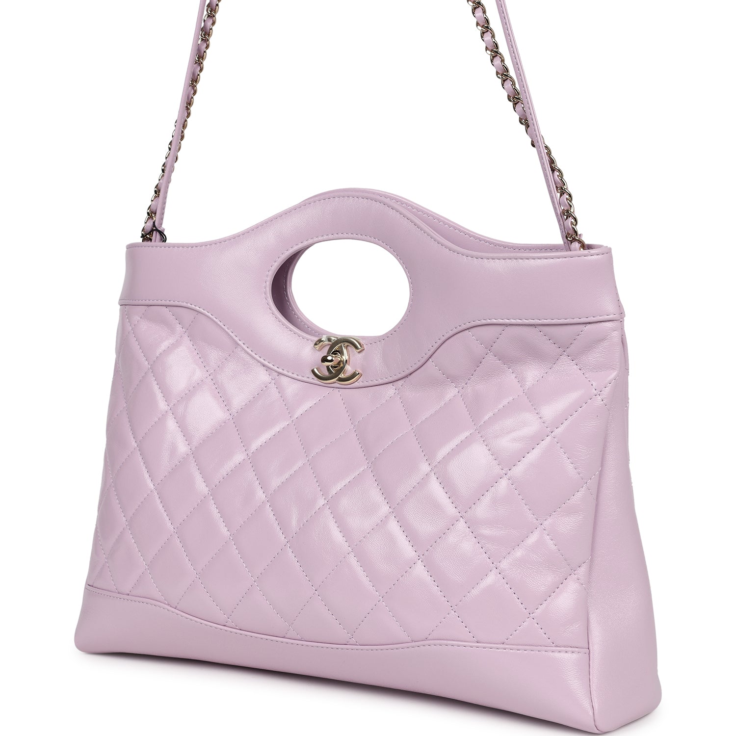 This large Chanel 31 shopper bag in light purple shiny lambskin leather with light gold tone hardware, featuring cutout top handles, cc turnlock closure, one interwoven light purple leather and light gold chainlink shoulder strap, and one light purple leather rope shoulder strap.