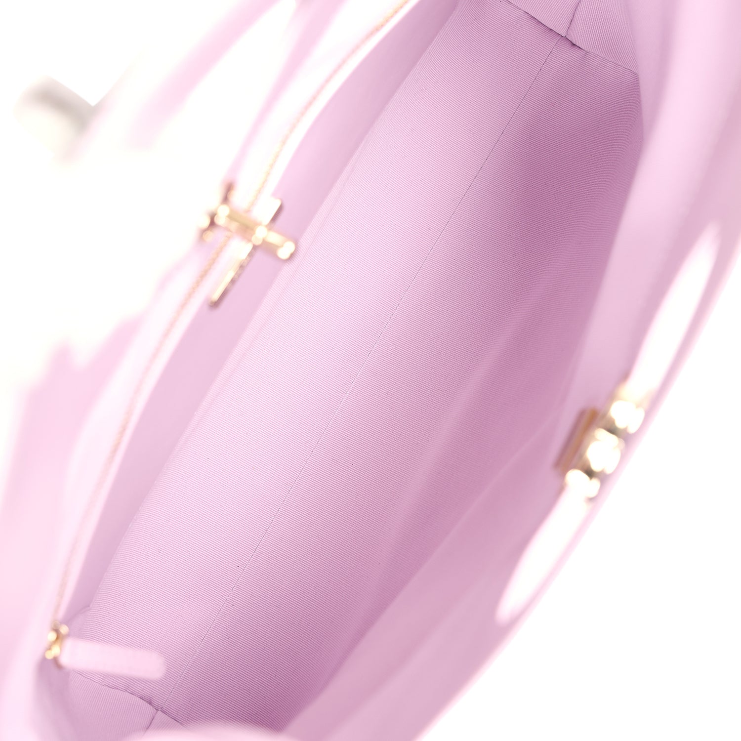 The interior is lined in a mixture of light purple grossgrain and leather with one zippered pocket on rear wall with zipper pull and logo.