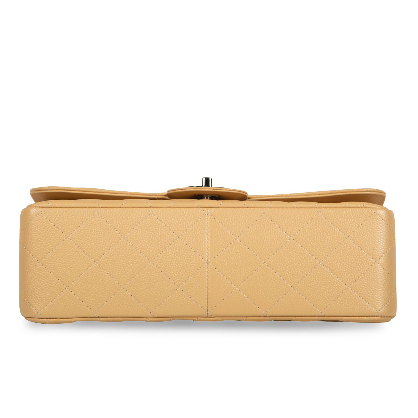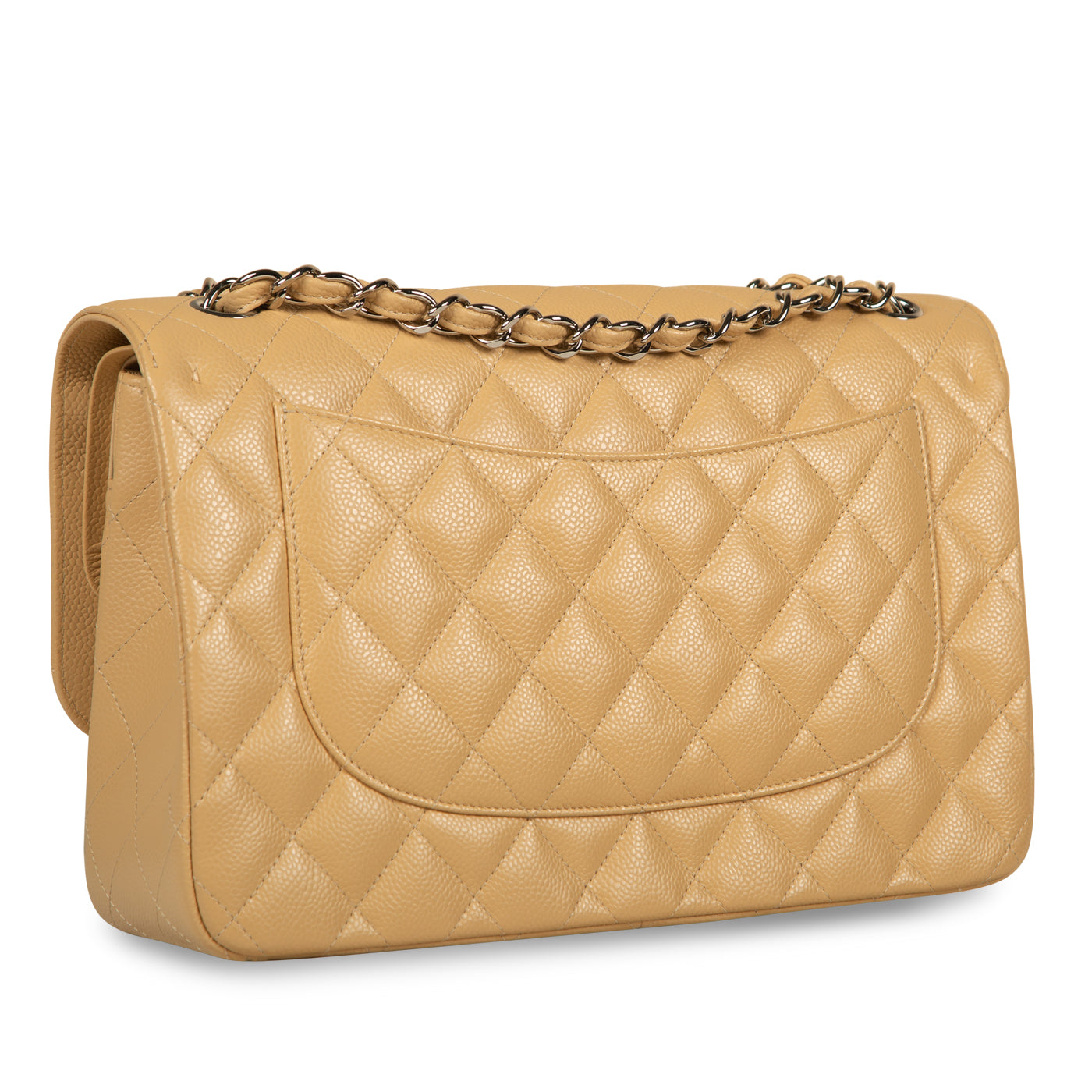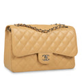 Chanel continues to present its signature line of Classic Flap bags. Inspired by the original Re-Issue Flap Bag and created by Karl Lagerfeld, the Classic Flap is perhaps the most acclaimed bag in all of fashion history. Timeless, elegant and sophisticated, it's no wonder the Classic Flap is, well, a classic. Featuring its infamous quilted lambskin leather and interwoven chain / leather strap, the Jumbo is an absolute must-have in any luxury handbag collection. Not only is this highly coveted, stunning beige bag the perfect accessory to compliment anything in your wardrobe, but it's also an investment piece that will never lose its value. Embodying elegance and traditional femininity to a T, a Chanel Classic Flap Bag is a purchase you won't ever regret.