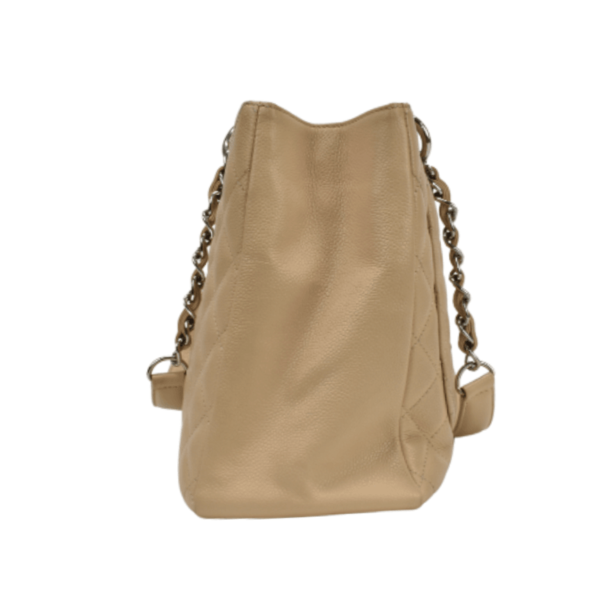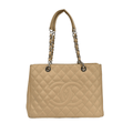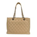 Chanel 'GST' or 'Grand Shopping Tote' in quilted beige caviar leather with silver hardware. Features a 'CC' logo on the front, chain straps with shoulder rests, and an open, fabric lined interior with center zip pocket.