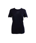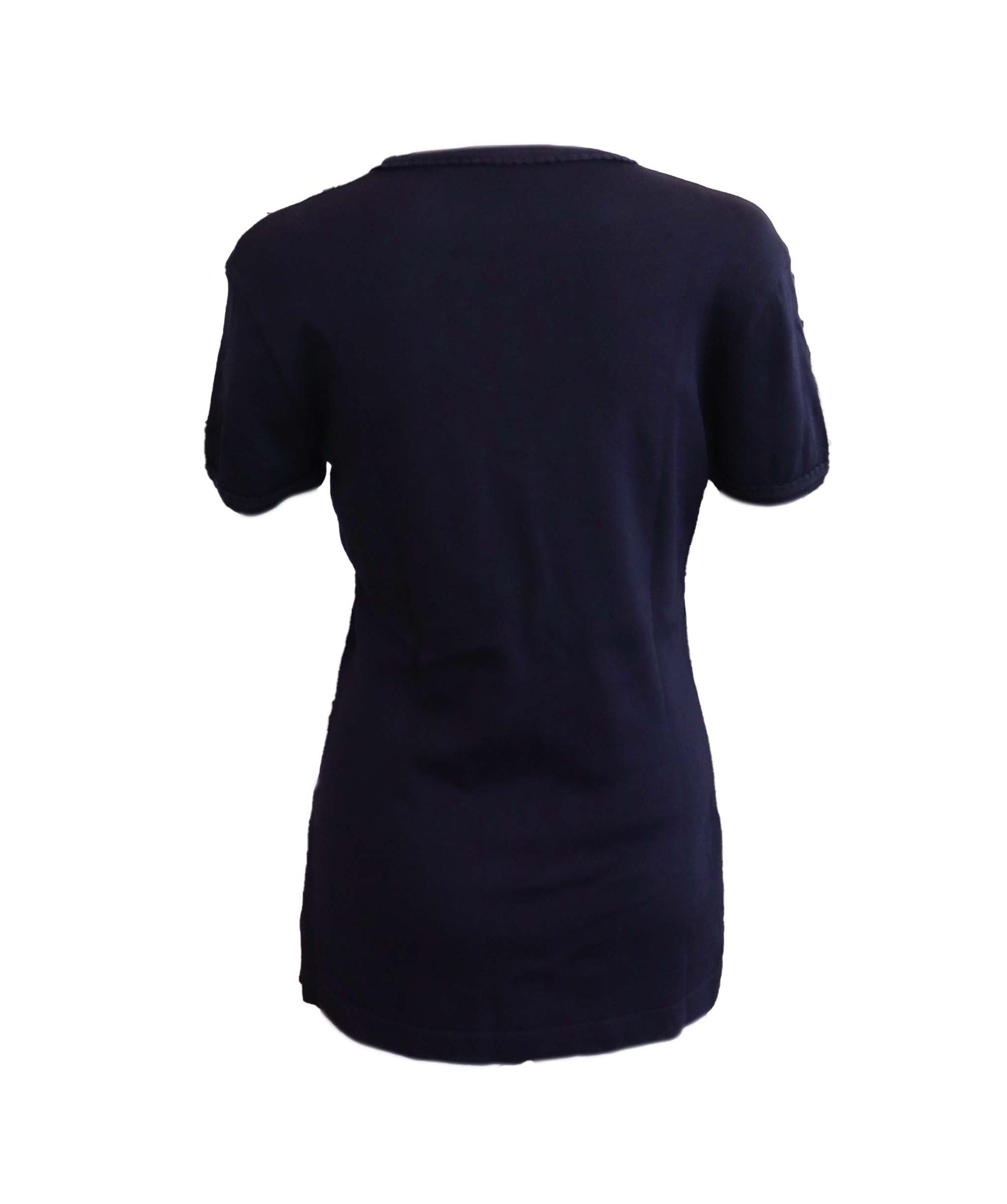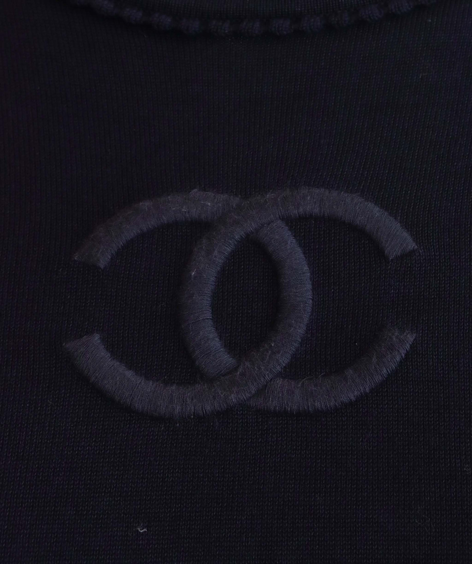 Description: This navy blue cotton ribbed knit, with the Chanel signature interlocking CC logo at the front and high round neck and short sleeves, this top has a straight hem that will take this from day to night.