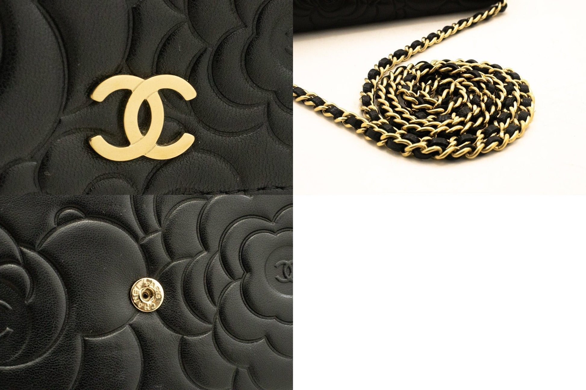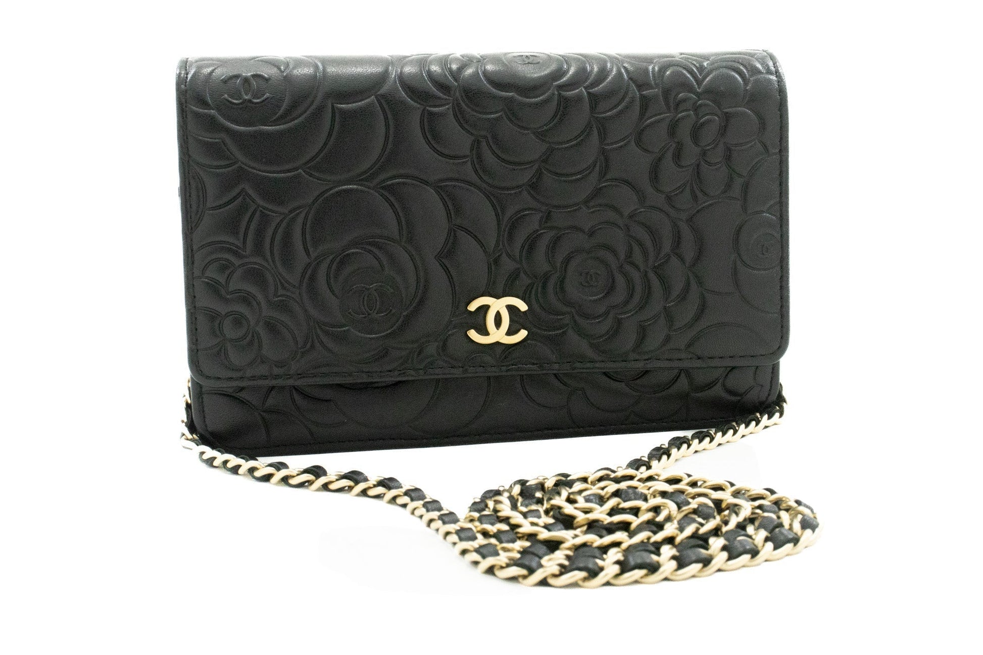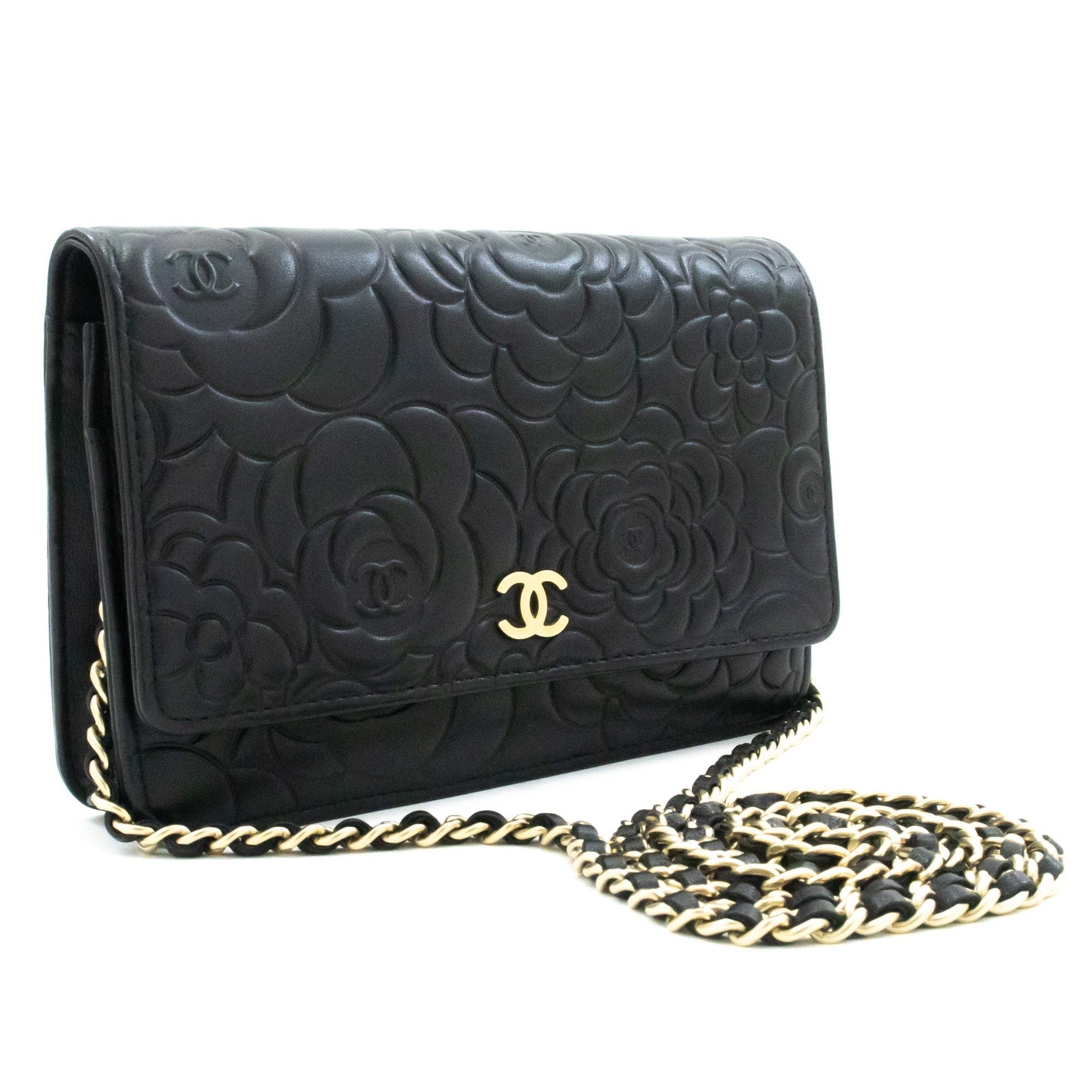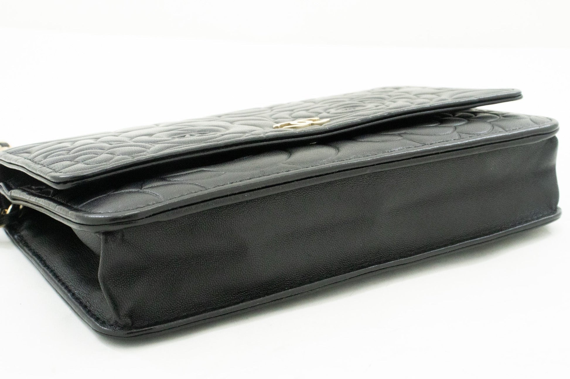 CHANEL Black Camellia Embossed Wallet On Chain WOC Shoulder Bag k53