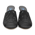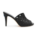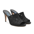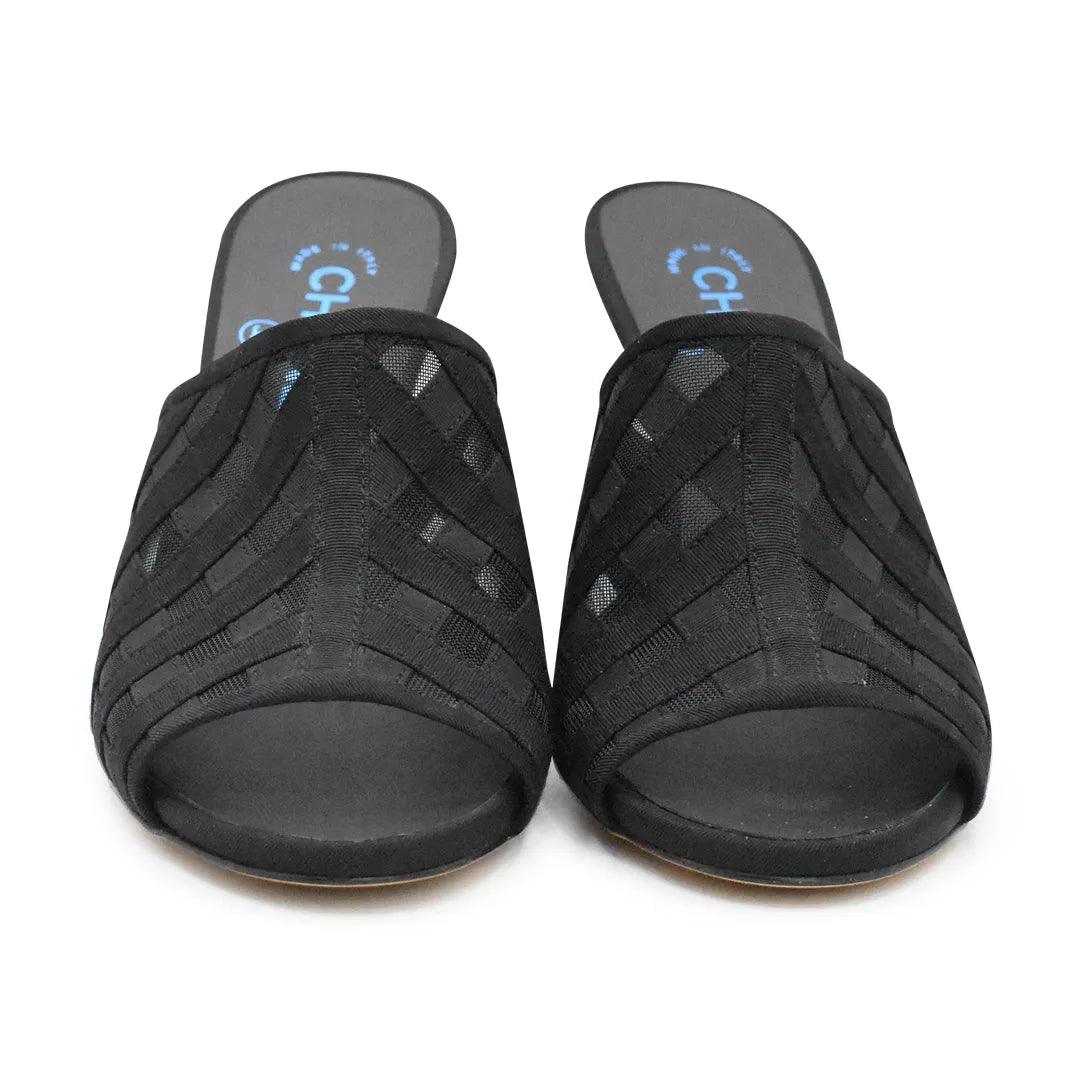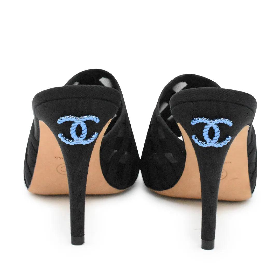 Chanel peep-toe mules in black quilted mesh with a small stiletto heel that features a blue CC plaque.