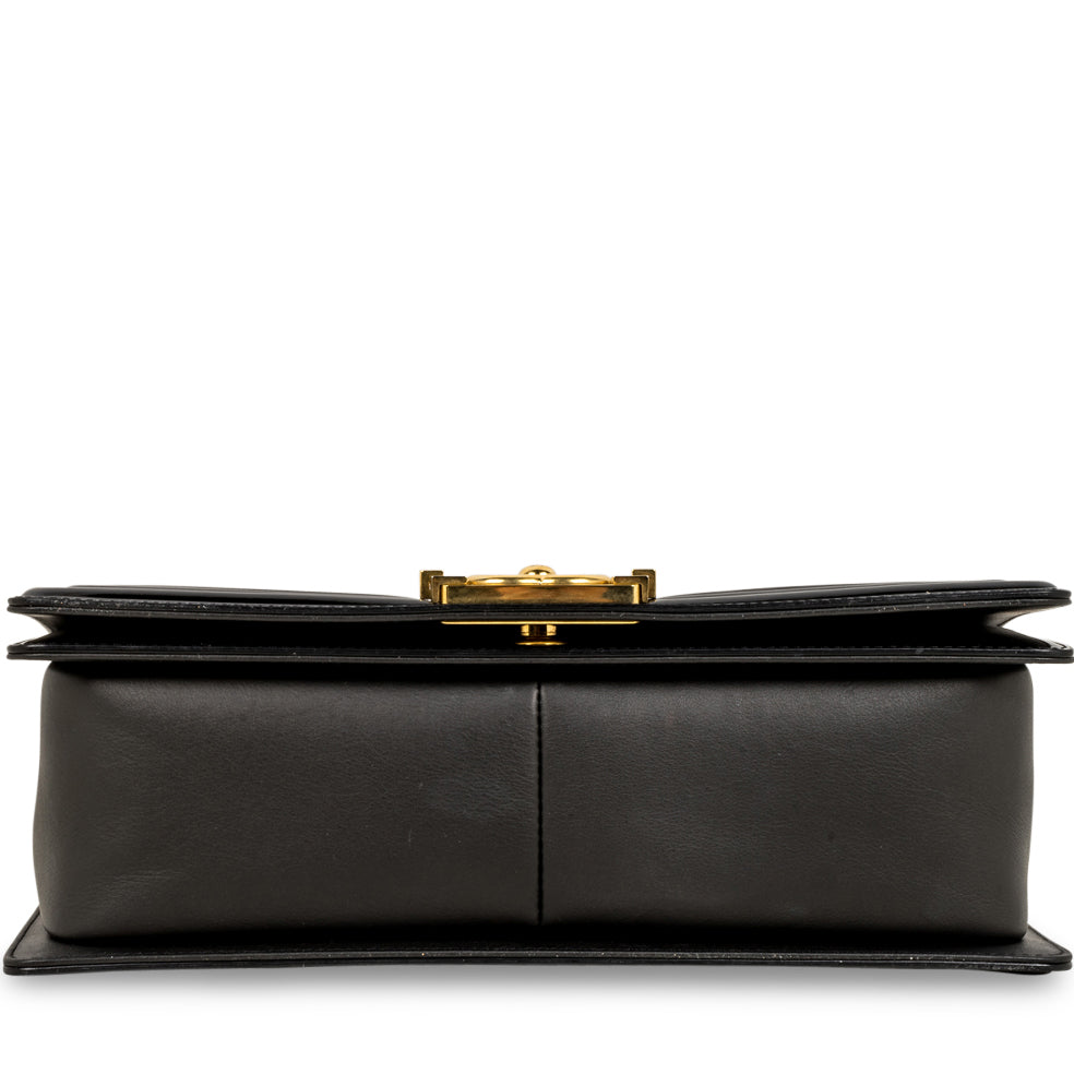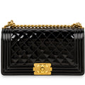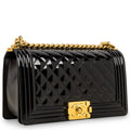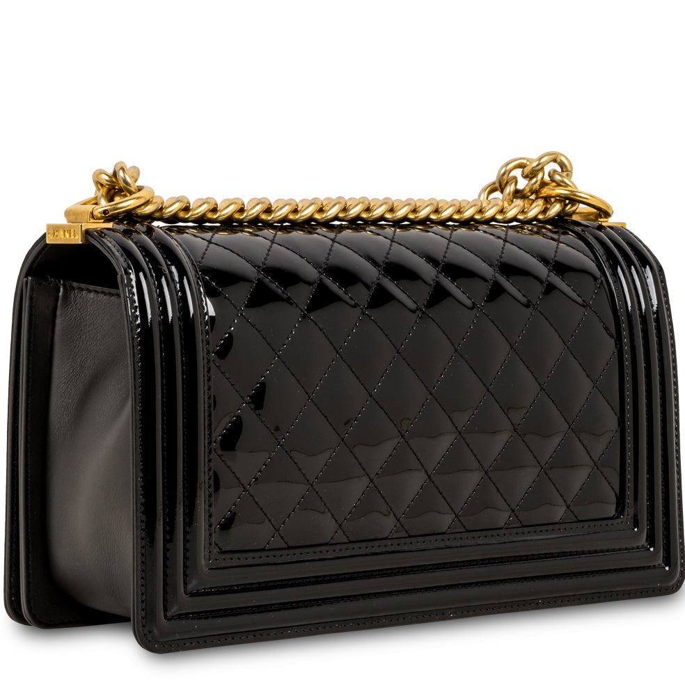Chanel presents one of its highly-acclaimed and most sought after bags, the Chanel Boy Bag in Medium in the timeless combination of Black Patent Leather and Gold Hardware. As designed by Karl Lagerfeld, the Boy Bag collection was established to embody boyish charm and femininity. This magnificent handbag is crafted from quilted patent leather. Its charm is only fortified through the delicate punctuation of antique gold hardware from the chain-link strap to the signature CC push lock. Its interior features fabulous fabric lining and a single storage compartment, not to mention a subtle slip pocket.