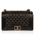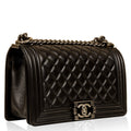 Chanel presents one of its highly-acclaimed and most sought after bags, the Chanel Boy Bag in Medium in the timeless combination of Black Caviar Leather and Ruthenium Hardware. As designed by Karl Lagerfeld, the Boy Bag collection was established to embody boyish charm and femininity. This magnificent handbag is crafted from quilted caviar leather. Its charm is only fortified through the delicate punctuation of ruthenium hardware from the chain-link strap to the signature CC push lock. Its interior features fabulous fabric lining and a single storage compartment, not to mention a subtle slip pocket.