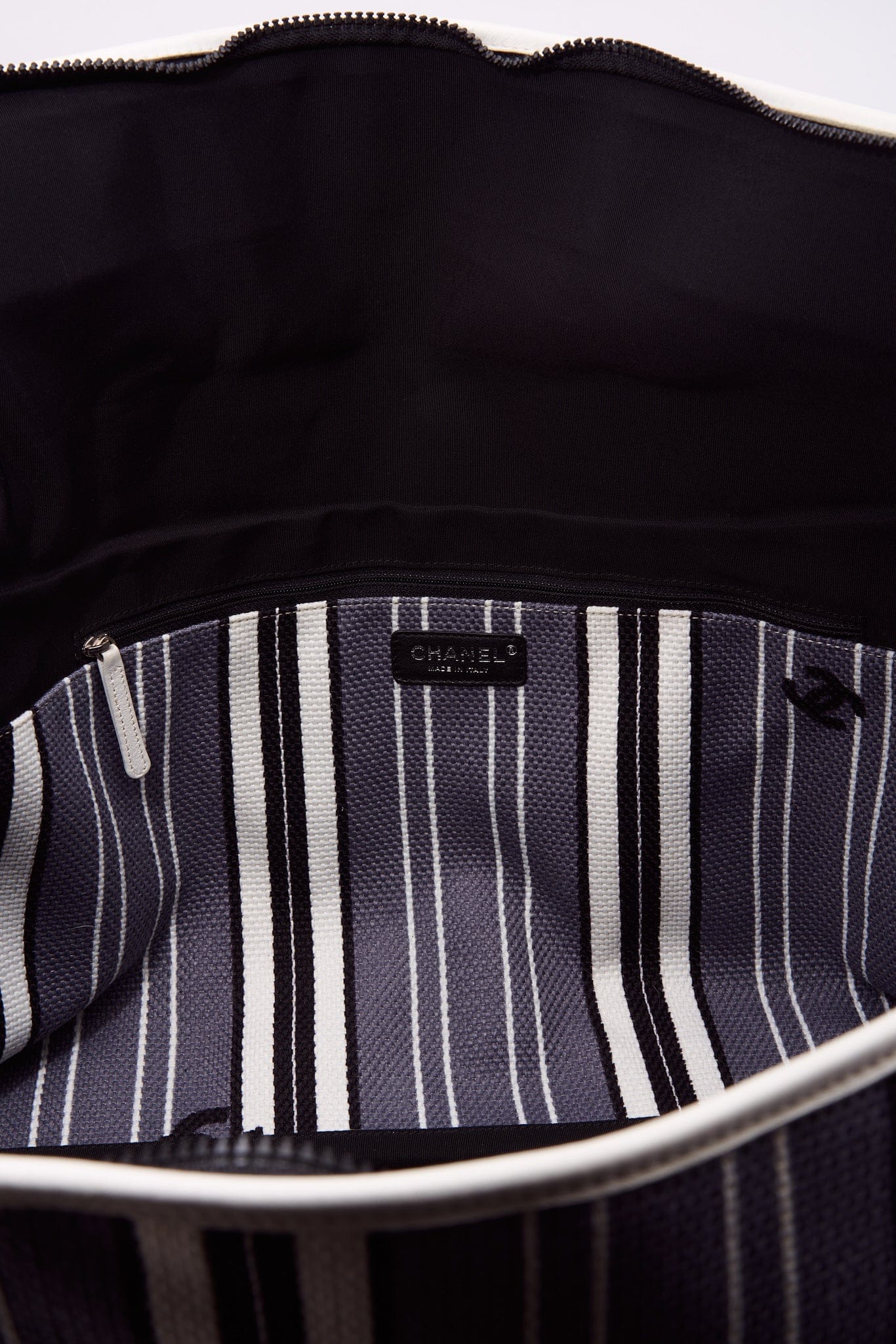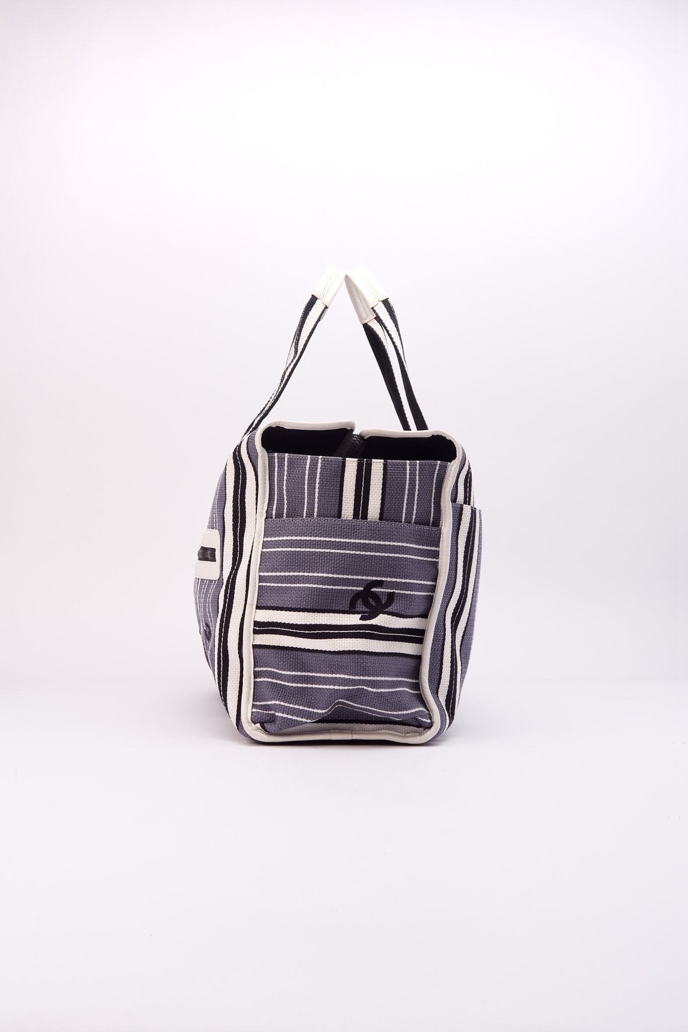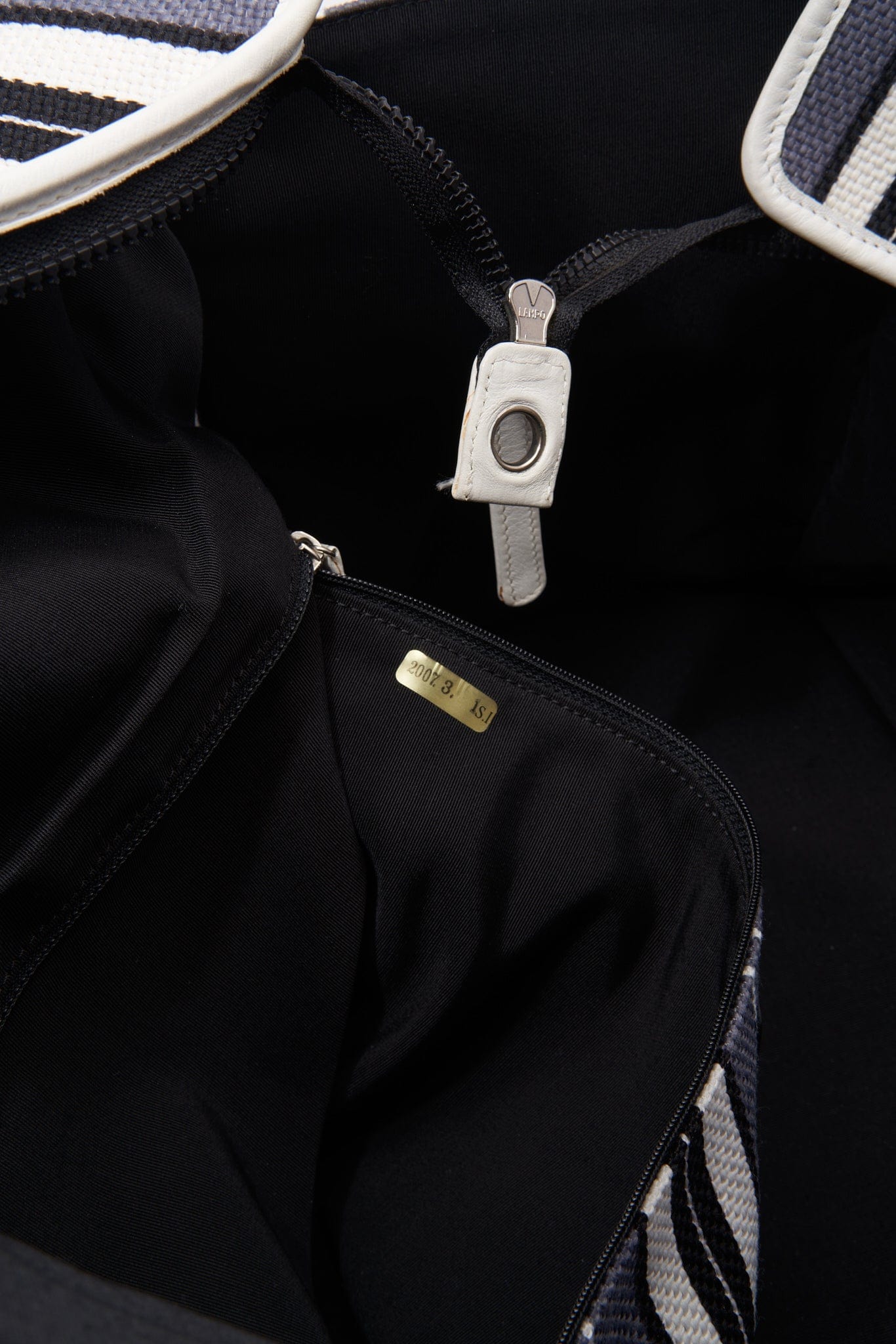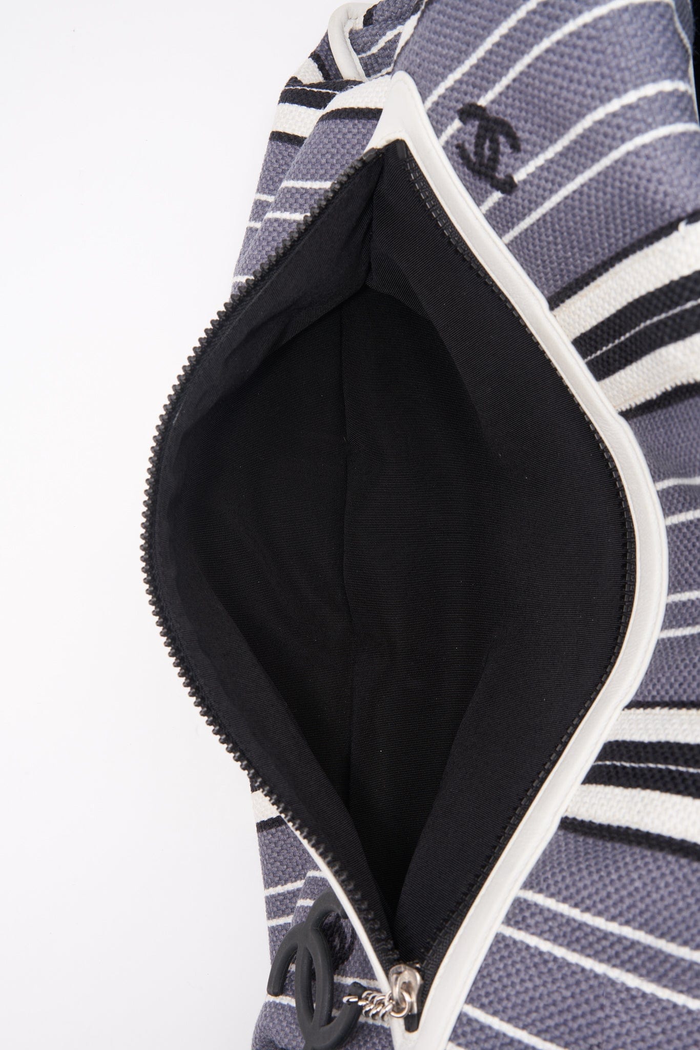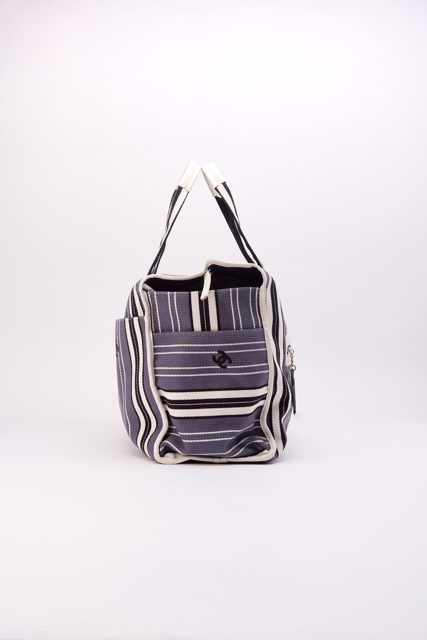 A very cool Chanel bag with CC printed grey/black/white striped cotton canvas and leather trim. This bag fastens with a top zip and there is a zipped pocket on the front panel plus a further slip pocket in the back.