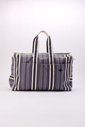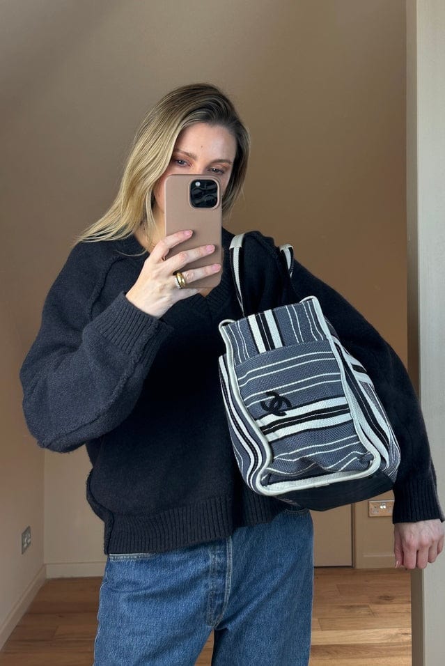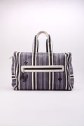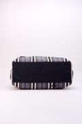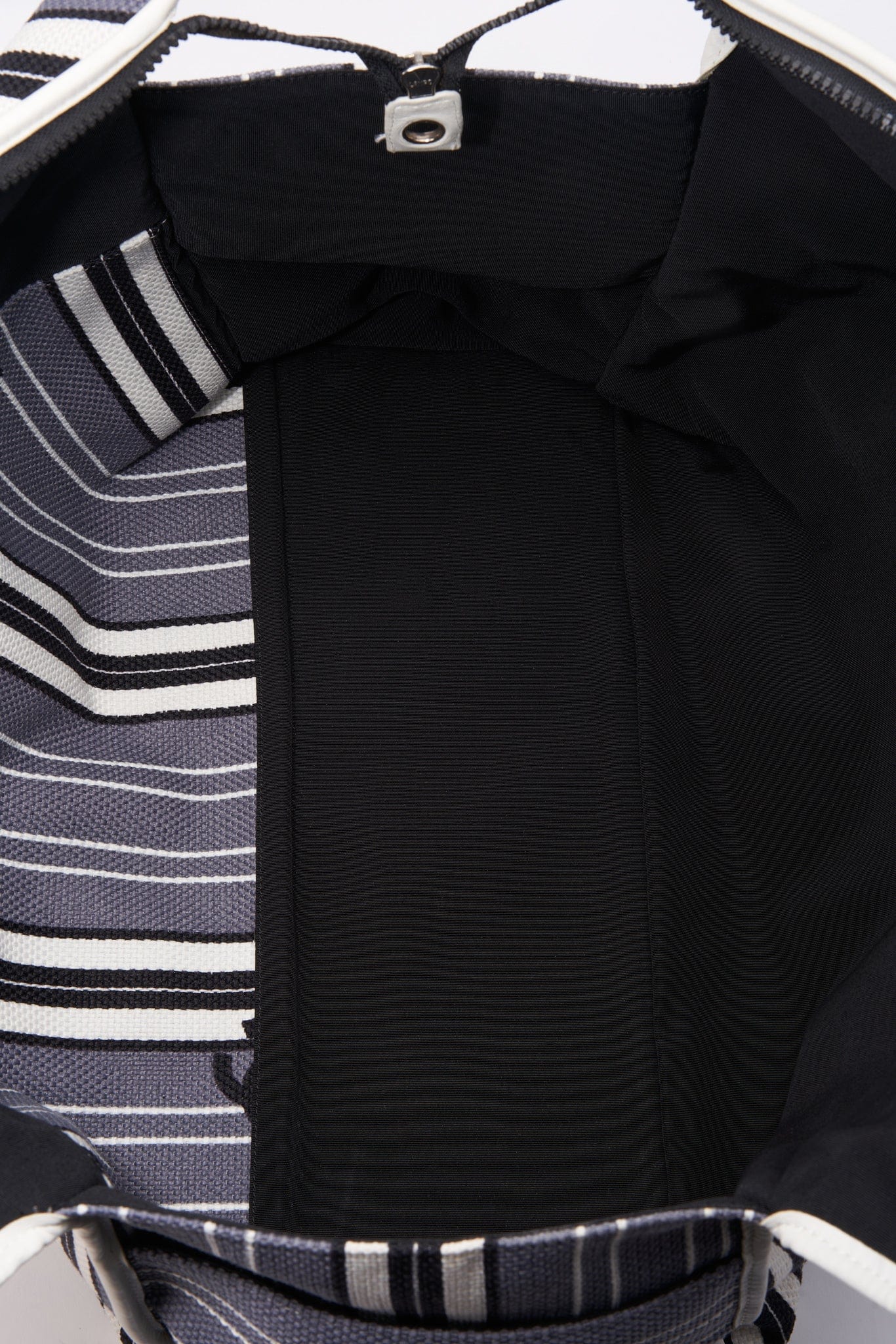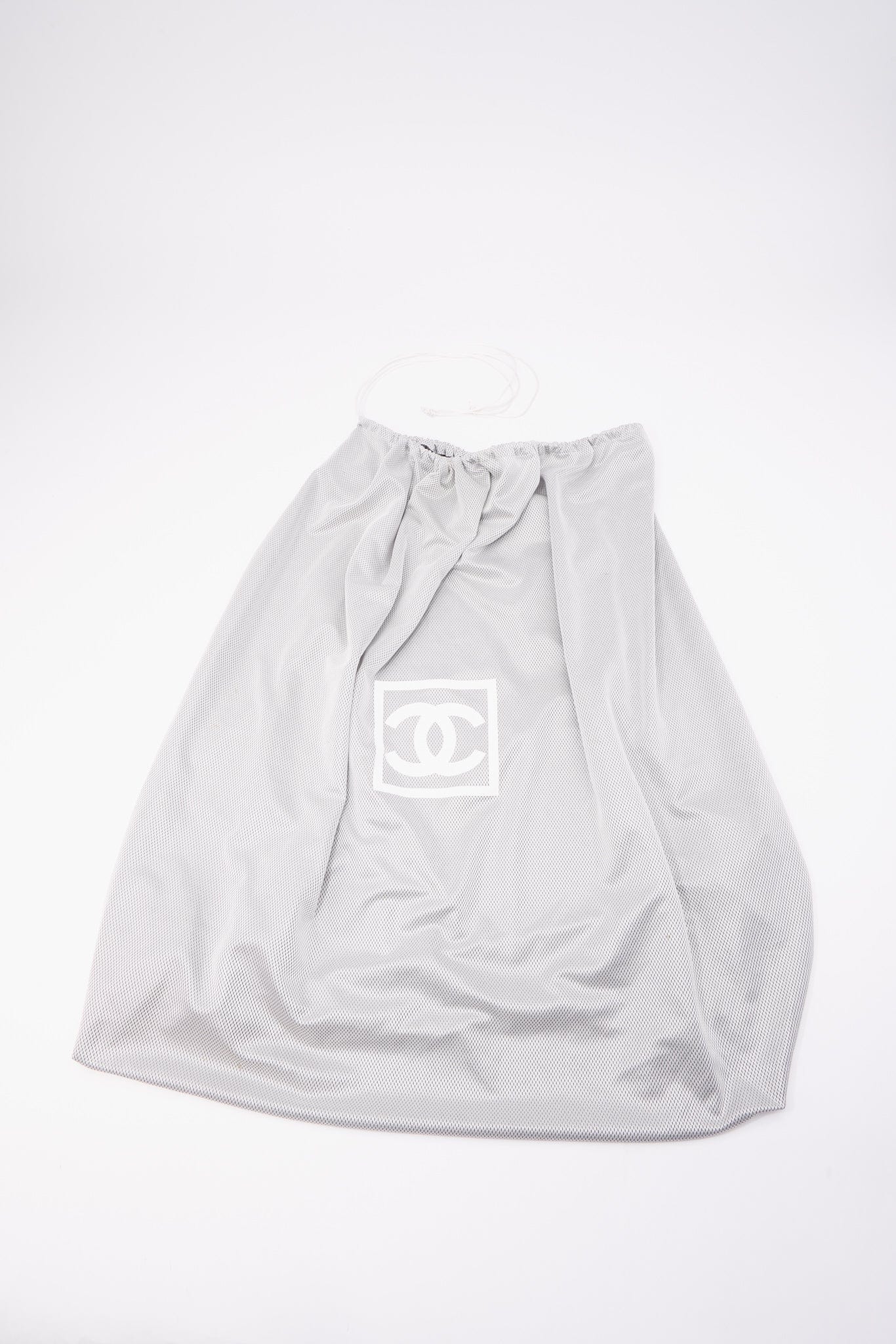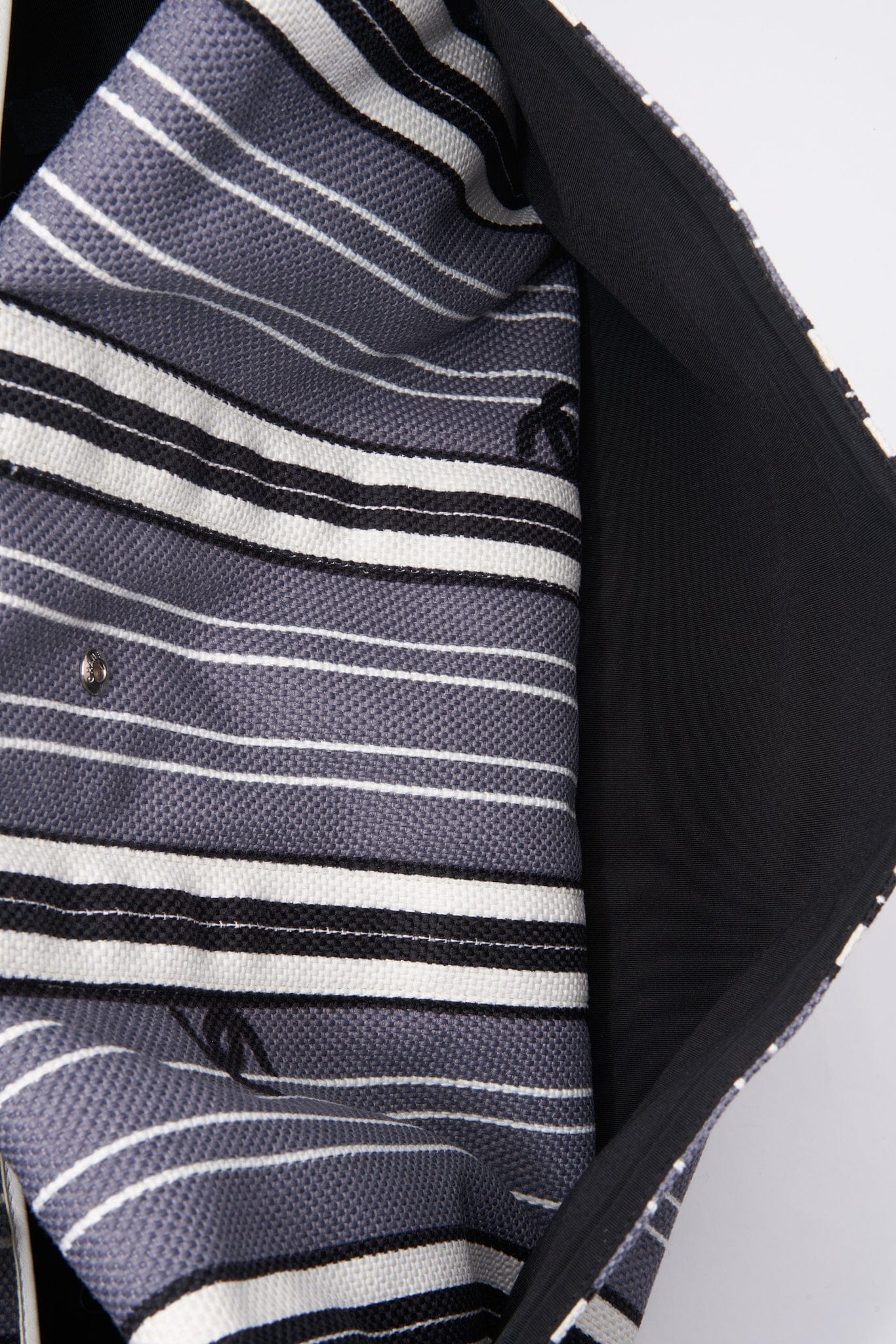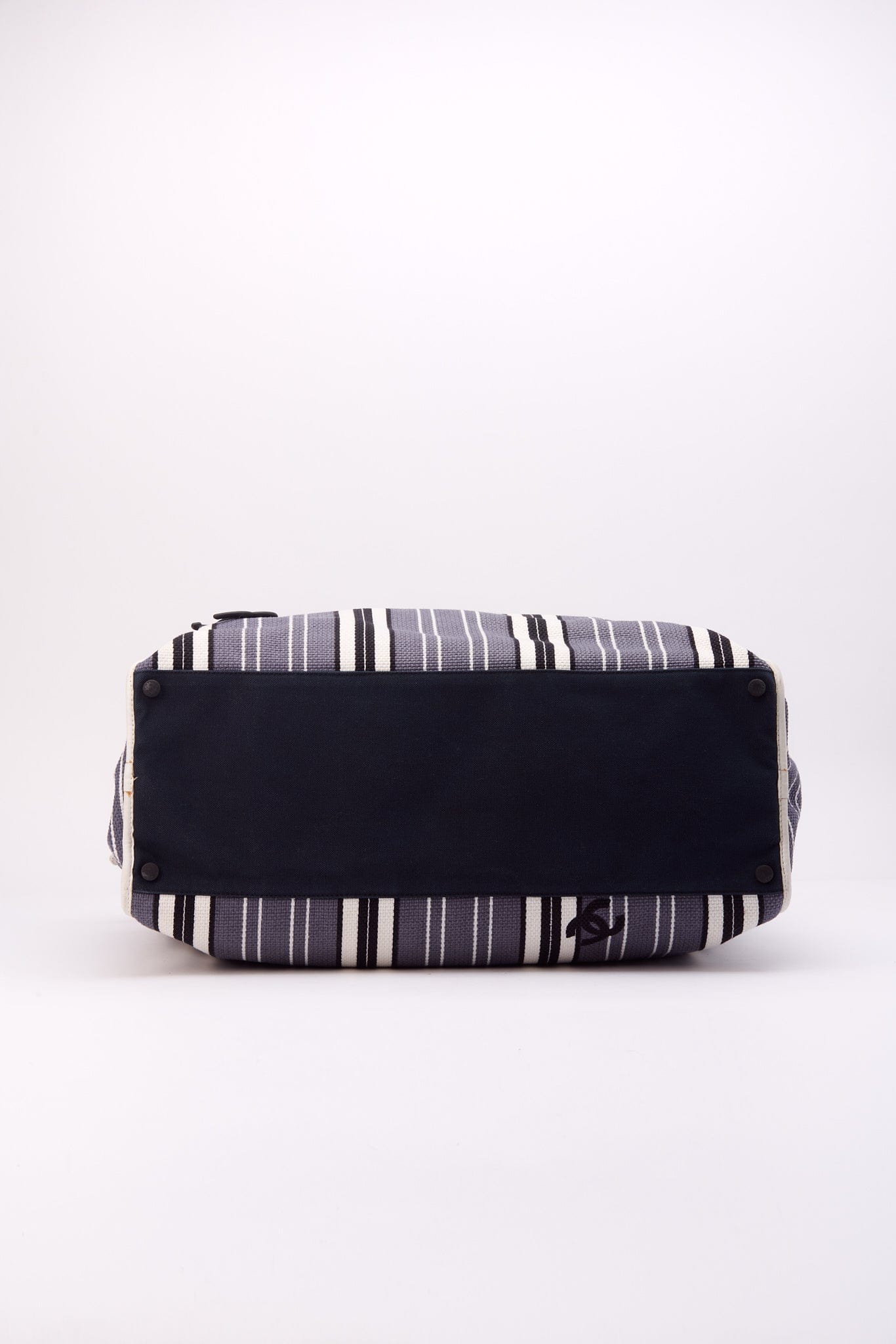 A very cool Chanel bag with CC printed grey/black/white striped cotton canvas and leather trim. This bag fastens with a top zip and there is a zipped pocket on the front panel plus a further slip pocket in the back.