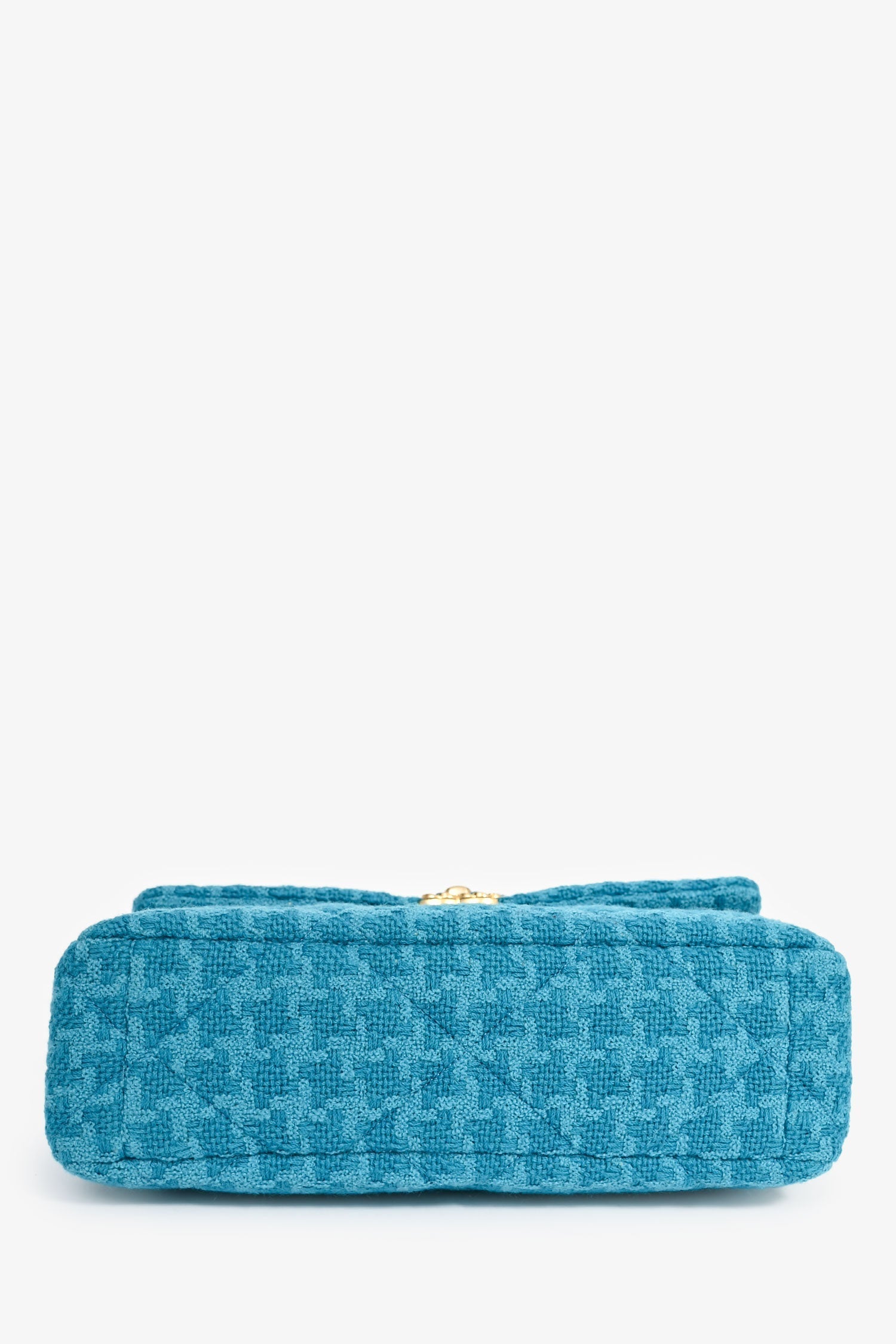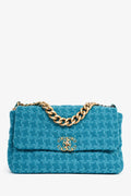 Pre-Loved Chanel™ Blue Houndstooth Tweed Large 19 Flap Shoulder Bag. Front fold-over flap with turn-lock closure. Tonal textile interior lining. Single compartment with a wall zip pocket. Outer rear pocket with magnetic closure. Gold-tone hardware. Two-tone hardware.