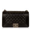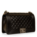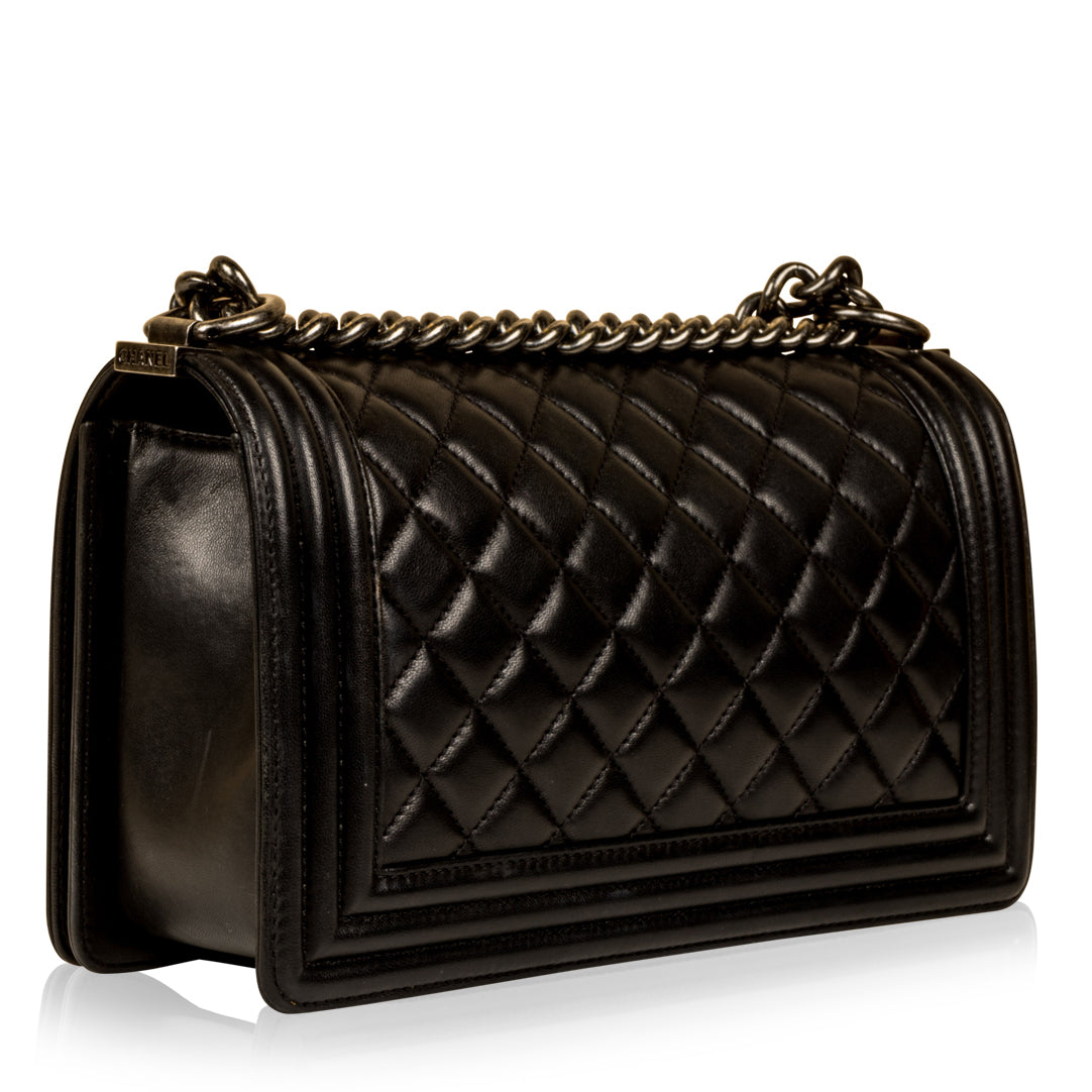 Chanel presents one of its highly-acclaimed and most sought after bags, the Chanel Boy Bag in Medium in a black shade. As designed by Karl Lagerfeld, the Boy Bag collection was established to embody boyish charm and femininity. This magnificent handbag is crafted from lambskin and is meticulously adorned with ruthenium-finish metal. Its interior features fabulous fabric lining and a single storage compartment, not to mention a subtle slip pocket.