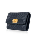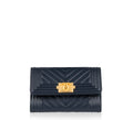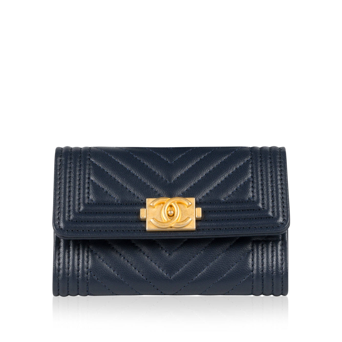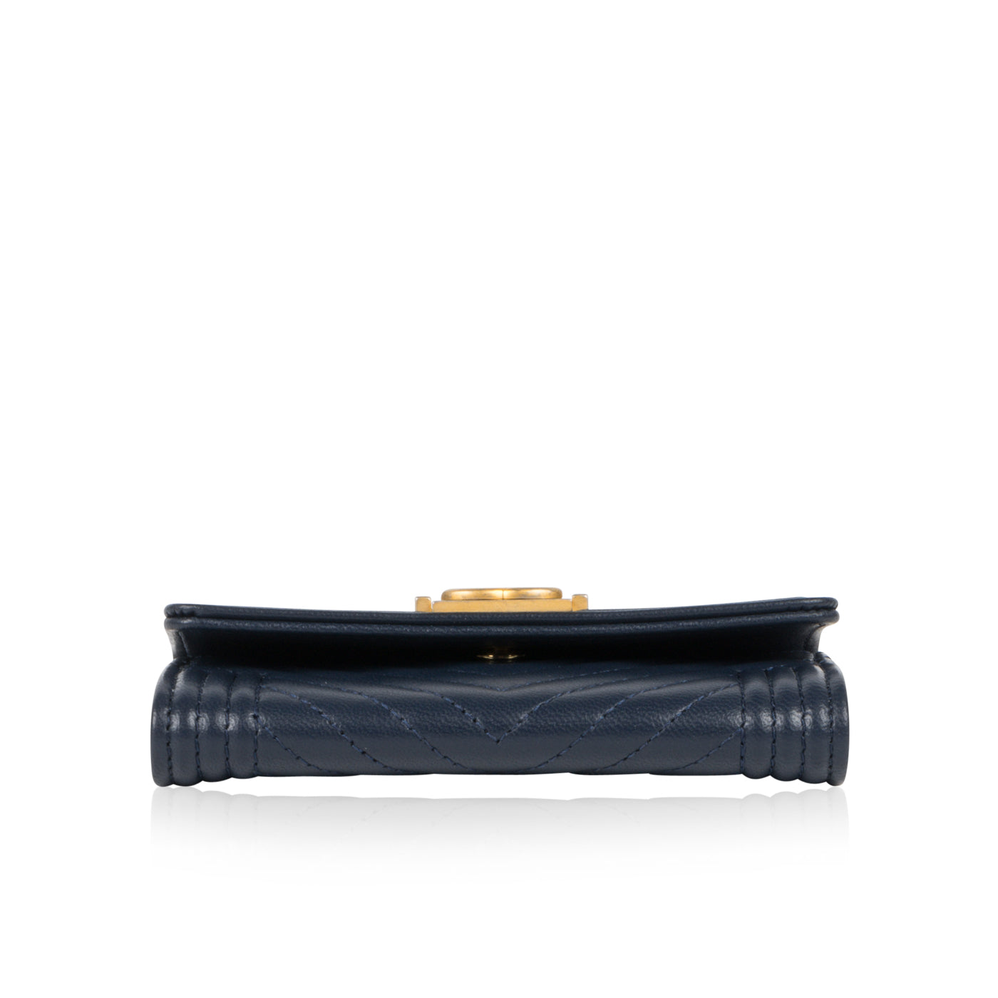 Carefully crafted in smooth, navy lambskin leather, this little accessory is an absolute stunner. Complimented by an antique-gold tone plaque emblemed with Chanel's signature CC logo, this matelassé coin purse also features a thin slip pocket for a few cards. Sleek, stylish and sophisticated this gem of a piece is a true must-have for any woman with a love for luxury. A well-worthy investment and addition to any accessories collection, this card / change holder is one you'll have forever.