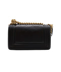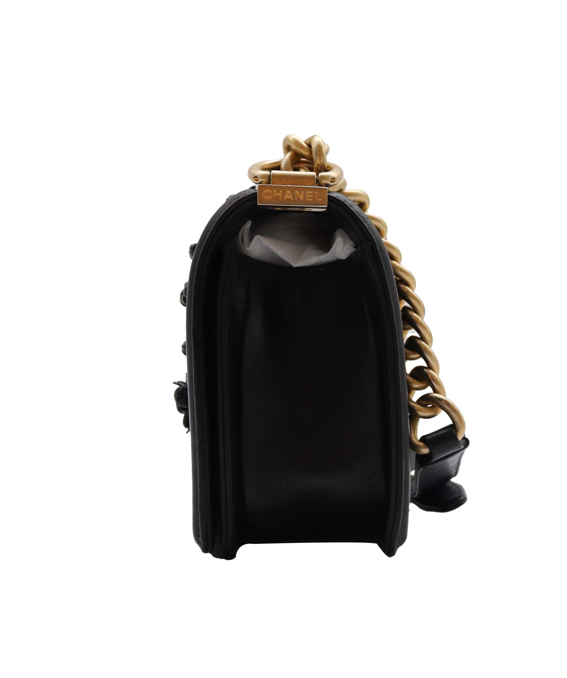 Description: This rare Chanel limited edition Boy camellia flower black leather gold hardware chain bag.