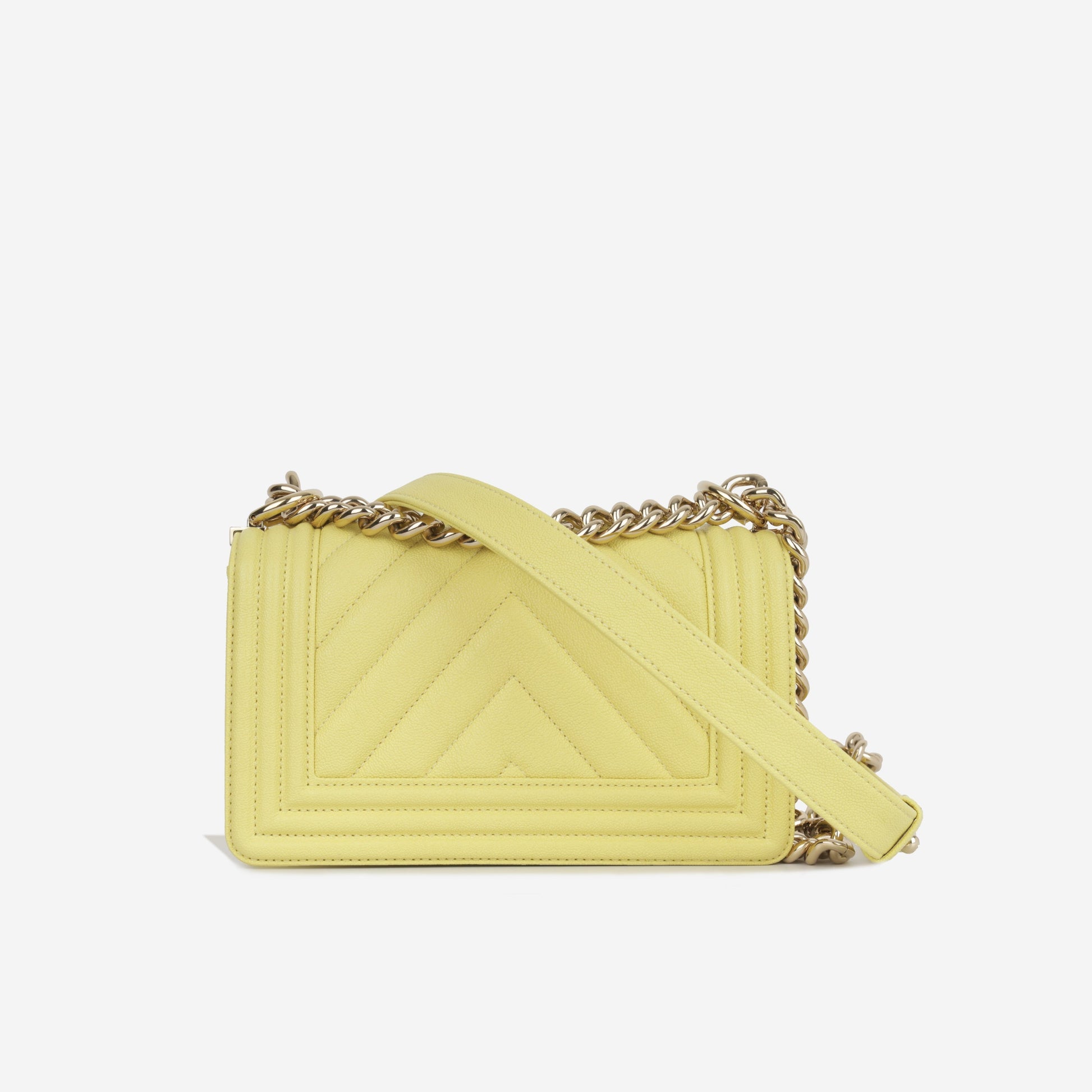 The ‘Boy’ bag, first introduced in 2011 and named after Coco Chanel’s lifetime love, is part of their iconic collection. This particular edition is creating using pastel yellow caviar leather and can be worn with the chain doubled up over the shoulder for an evening look or wear cross-body for a more casual style.