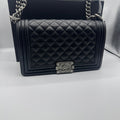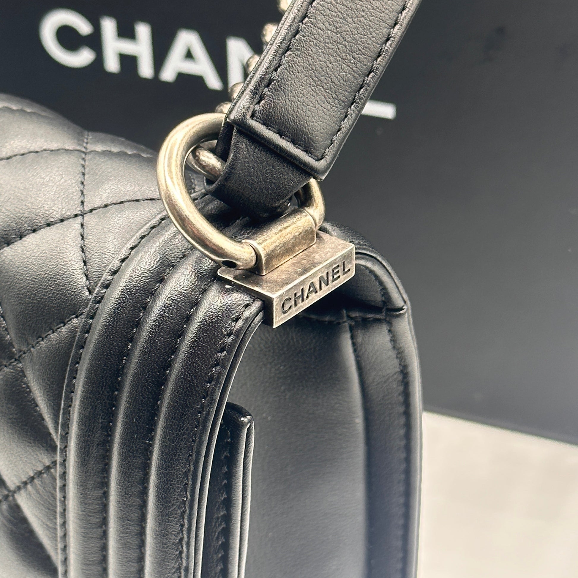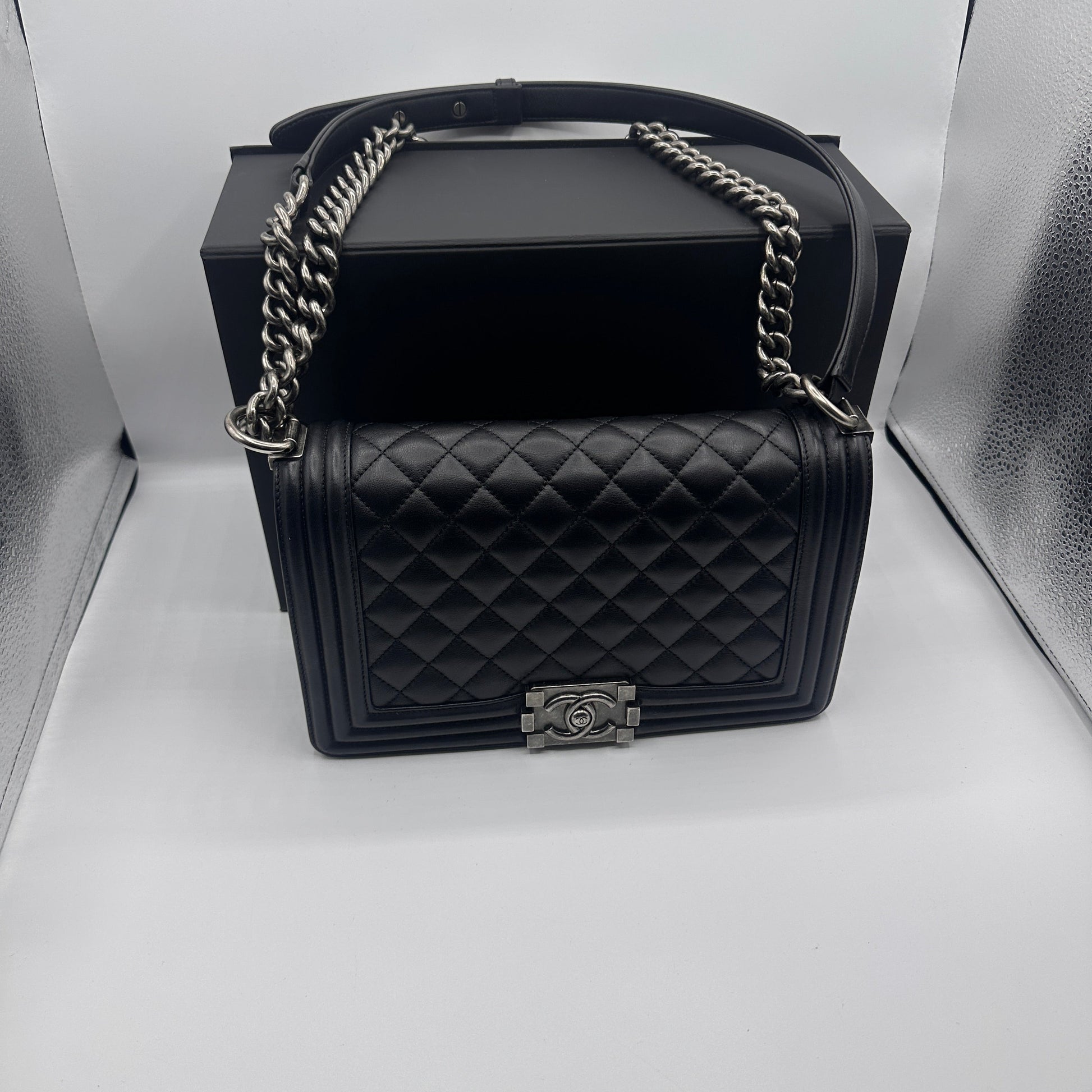 Chanel Boy Blackleather Crossbody Bag Medium with silver hardware.