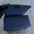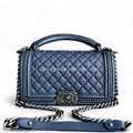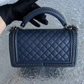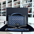 A true Chanel treasure! This Old Medium Quilted Calfskin Boy Handle with Ruthenium Silver Hardware is a rare find from Series 23. Chanel's unique chain-around design and luxurious leather make it a standout piece in any collection.