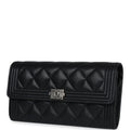 This Chanel Boy Long Flap Wallet is in black quilted caviar leather with aged ruthenium hardware, featuring diamond quilt leather with a border quilted trim, and a Le Boy Snap Closure.