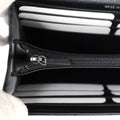 The interior is lined in black grossgrain fabric and has one front slip pocket, 2 main compartments, one middle zippered compartment, 12 card holder slots, one rear slit pocket.